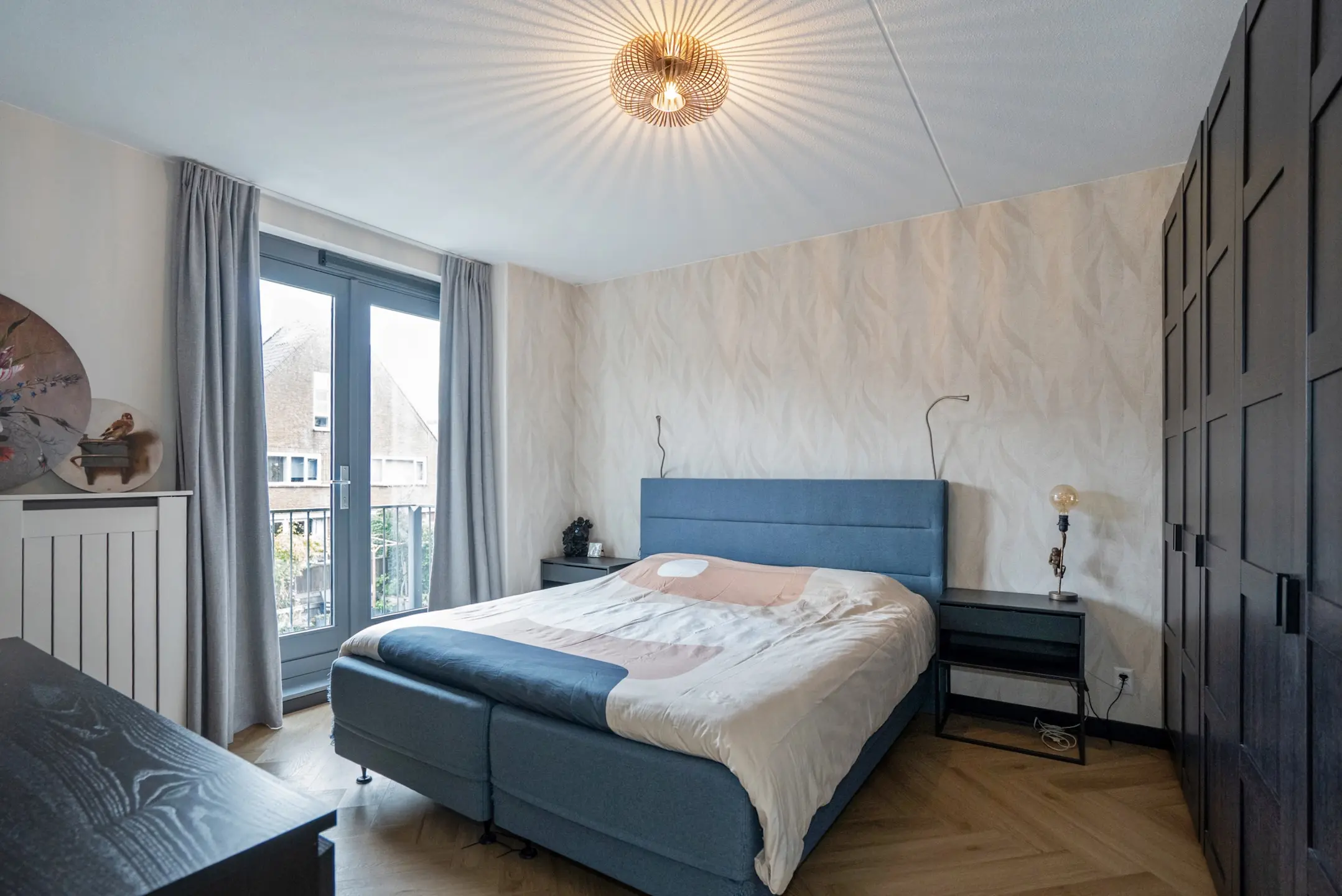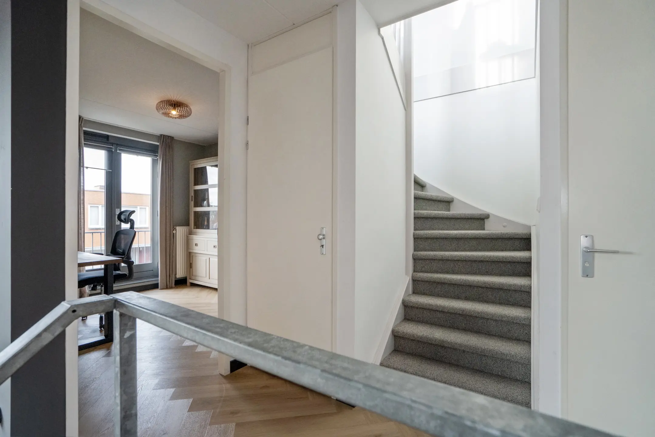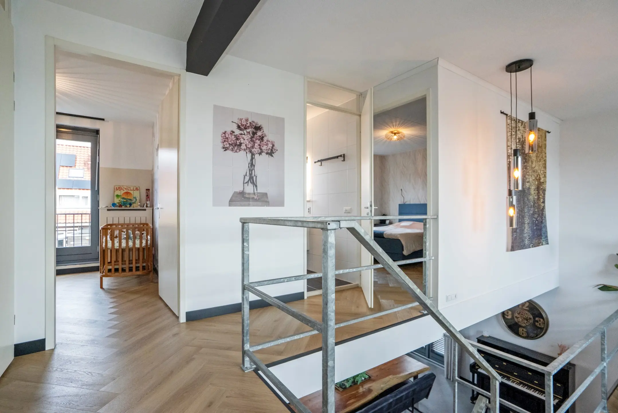 1e verdieping: L-vormige overloop met trapkast, voorgelegen slaapkamer/studeerkamer met Frans balkon, nieuw modern vrij hangend toilet met fontein, achtergelegen hoofdslaapkamer met Frans balkon, 2e grote achtergelegen slaapkamer met wederom een Frans balkon, moderne badkamer (geheel betegeld) met inloop douche, rainshower, dubbel wastafelmeubel, ligbad en design radiator (ventilatie middels raam en mechanische ventilatie).