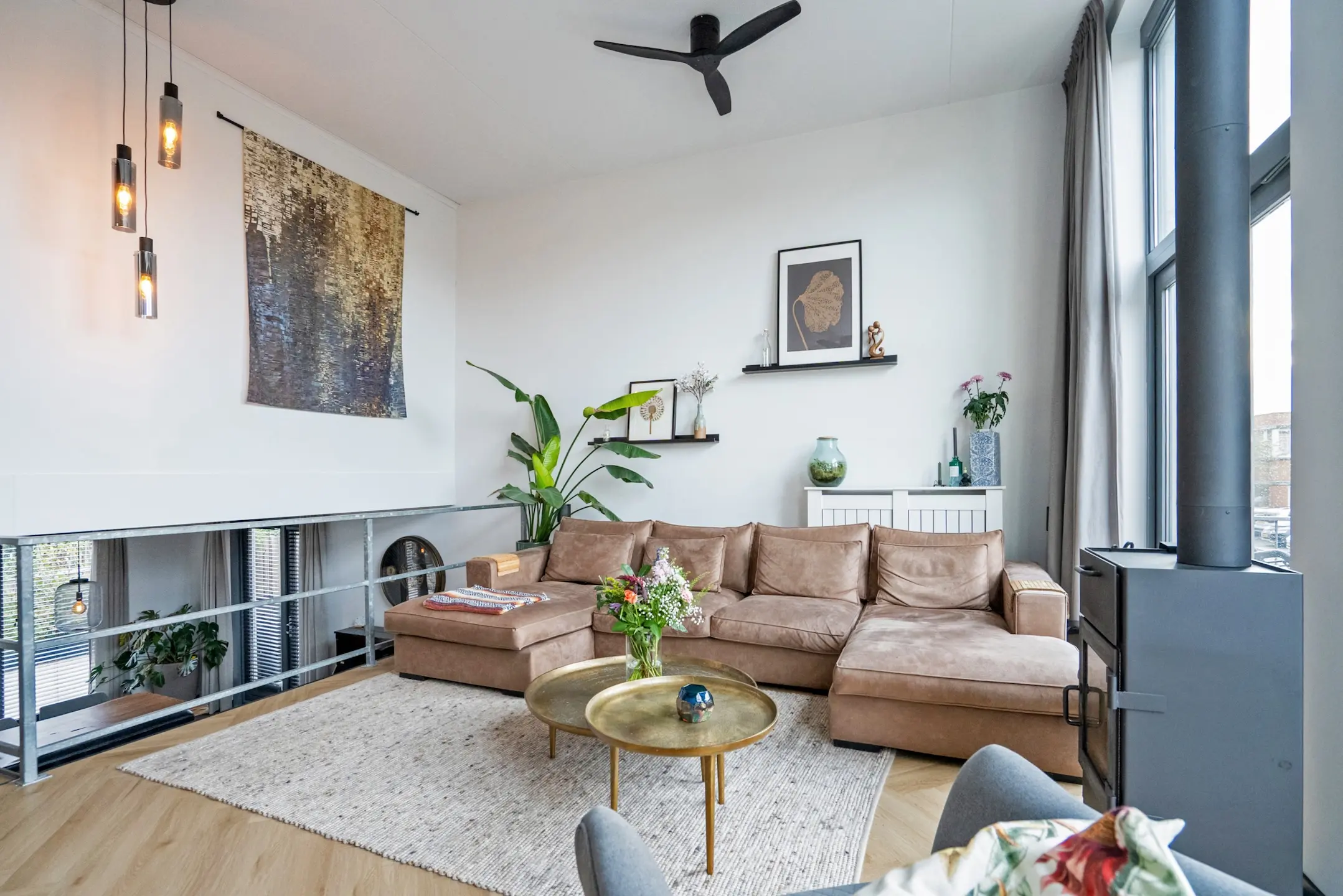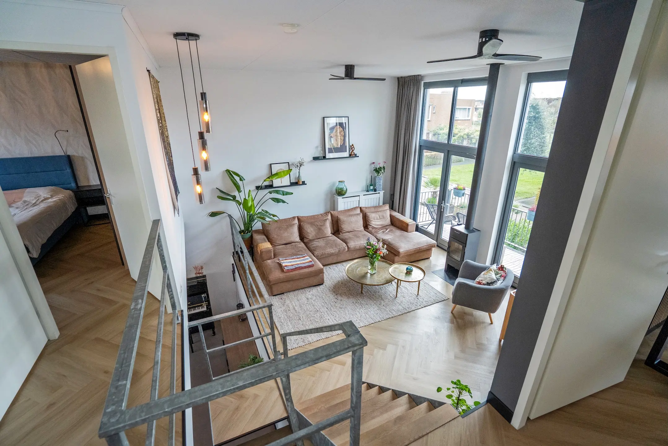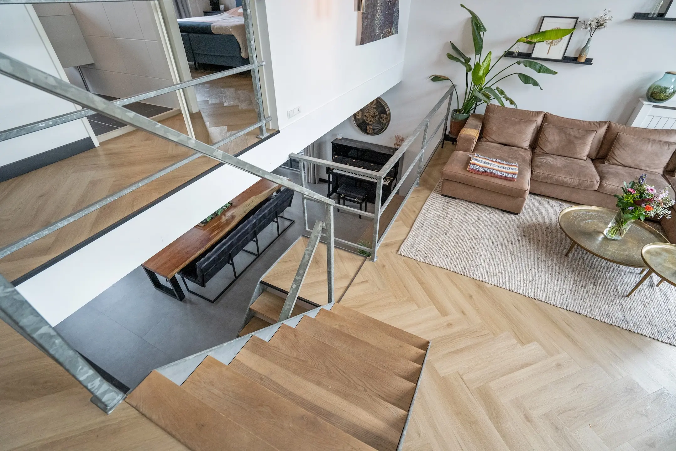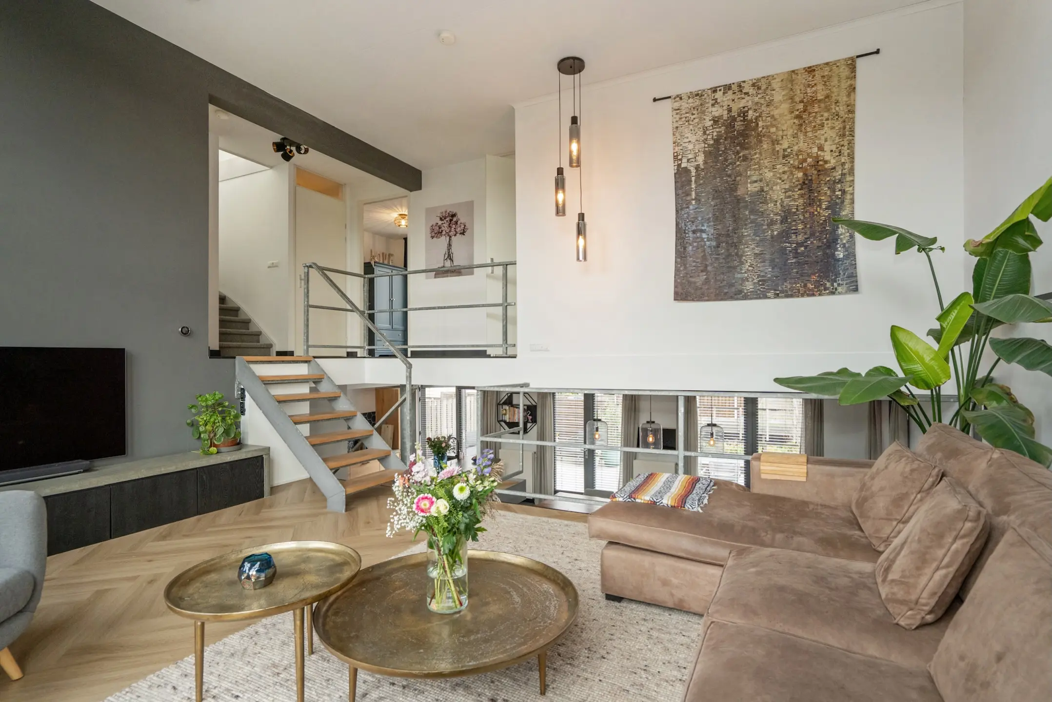 Tussenverdieping: via een eikenhouten- en stalen trap komt men op de tussenvloer waar zich de sfeervolle en door hoge raampartijen zeer lichte woonkamer bevindt met open haard met tevens een aangrenzend zonnig gelegen balkon met schitterend uitzicht op het binnenpark. Via de vide heeft men zicht op de woonkeuken. Deze verdieping is voorzien van een mooie PVC visgraat vloer.
