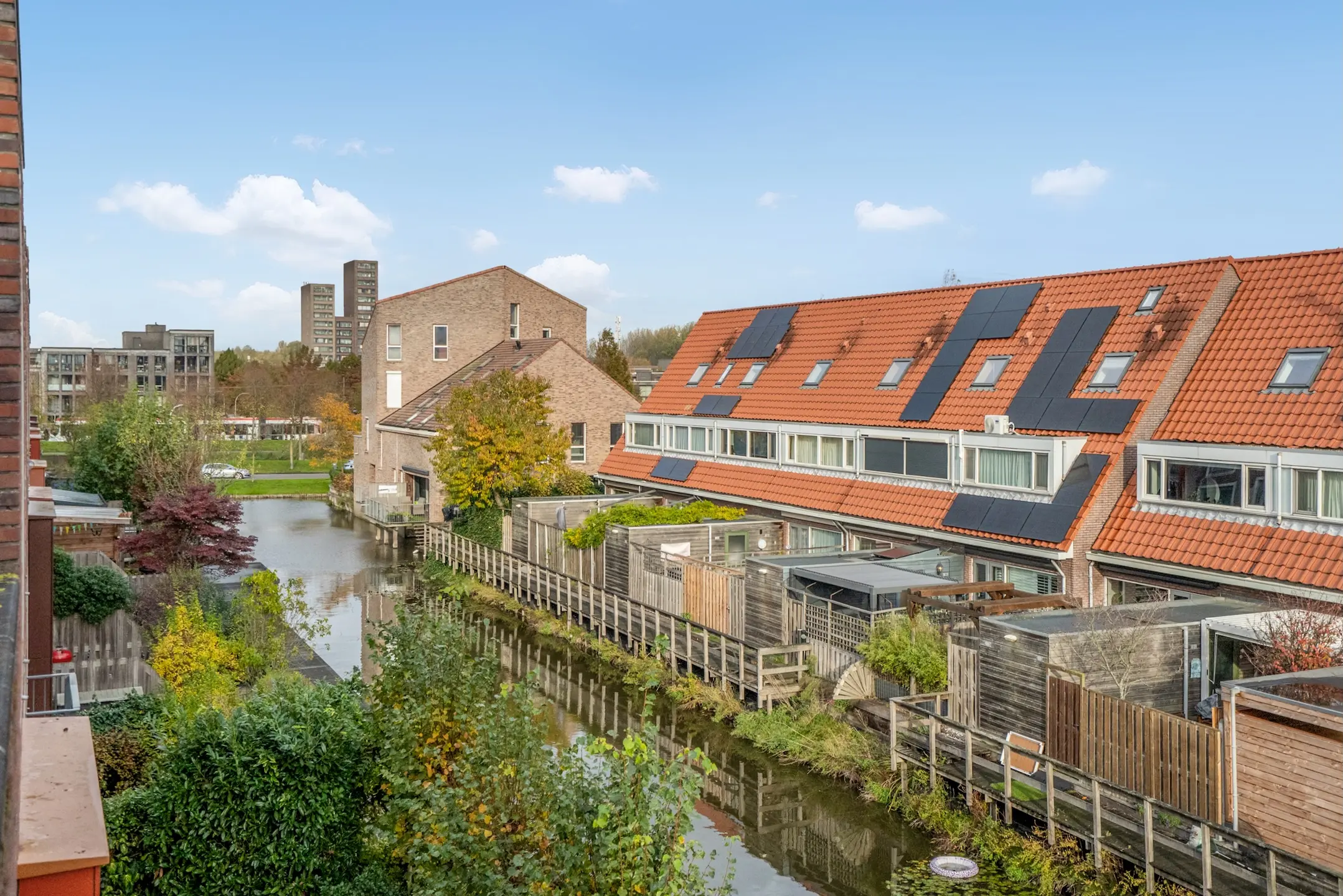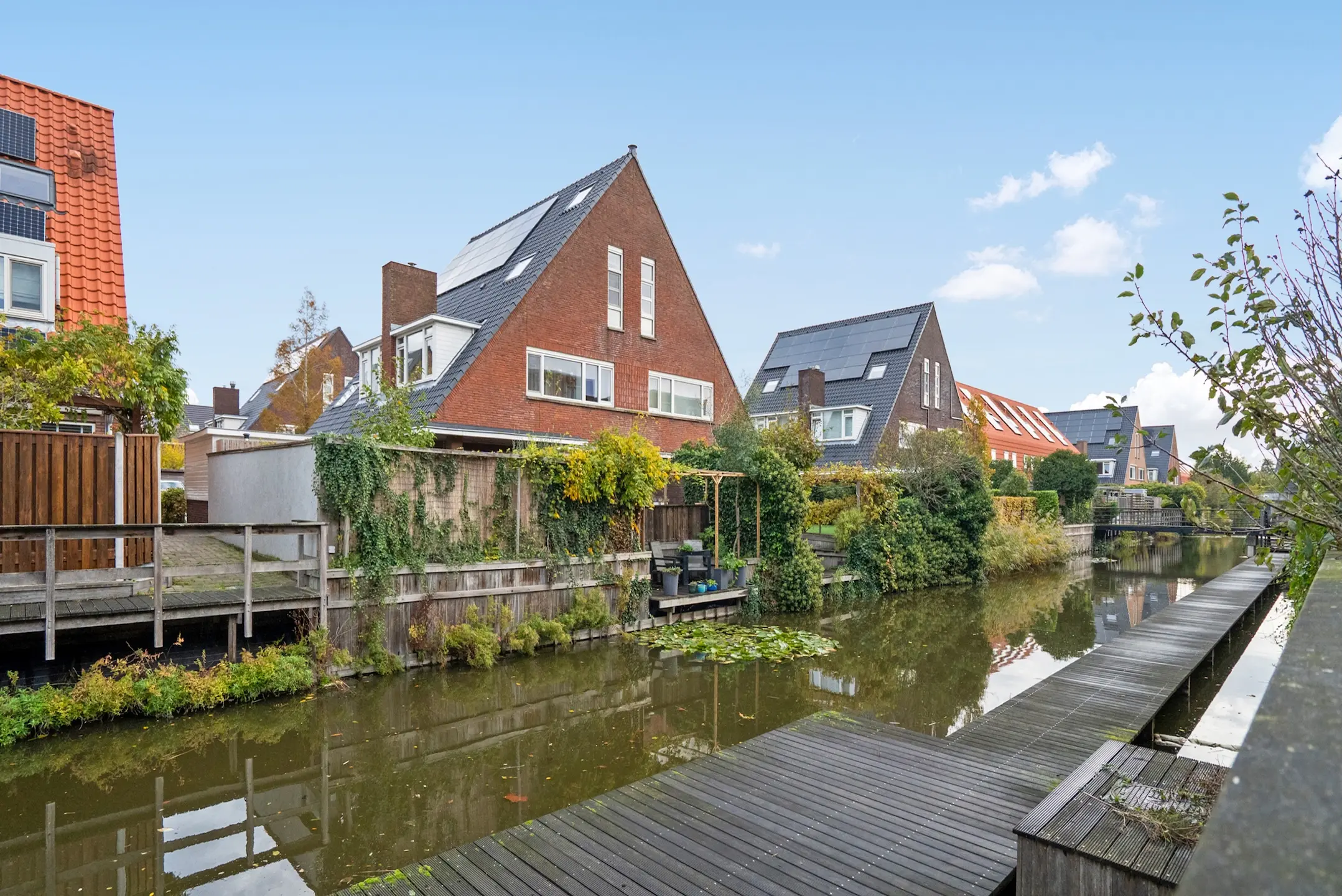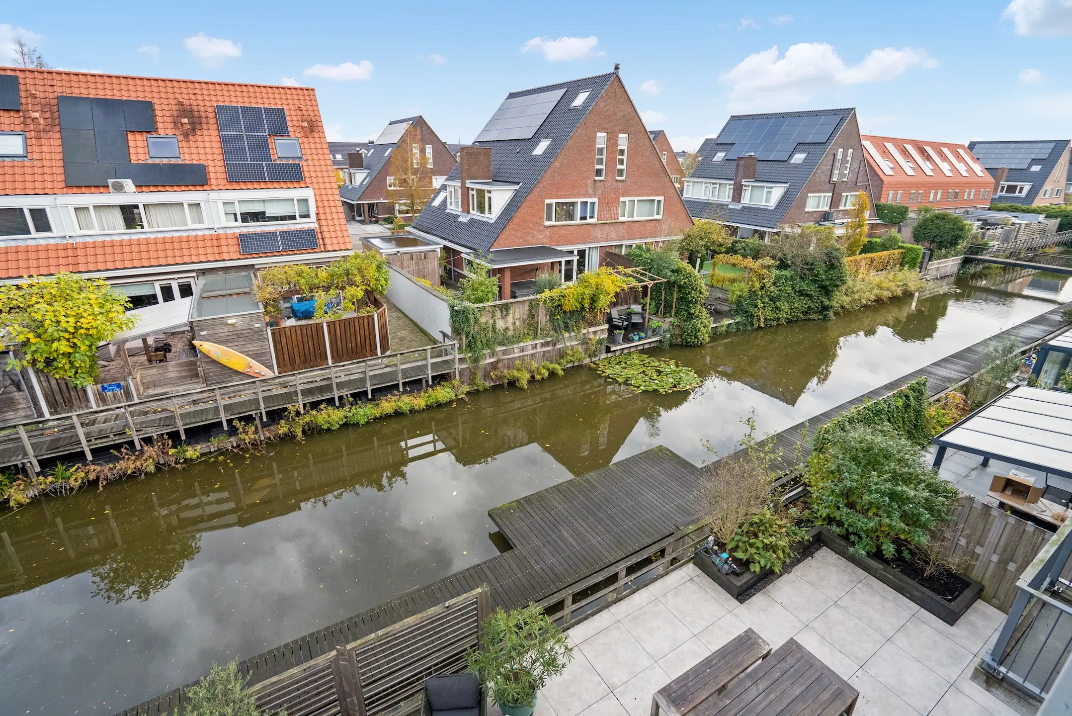 De woning heeft een breedte maat van maar liefst 9.00 meter. De MODERNE woonkeuken bevindt zich op de begane grond en beschikt over een SPOELEILAND en diverse inbouwapparatuur, aangrenzende brede achtertuin welke direct aan het WATER is gelegen, EIKENHOUTEN- en STALEN TRAP naar de UITERMATE lichte living met OPEN HAARD, ZONNIG gelegen balkon, totaal 5 slaapkamers, MODERNE badkamer en een ZONNIG (gehele dag zon) ROYAAL DAKTERRAS met VRIJ UITZICHT op het park.