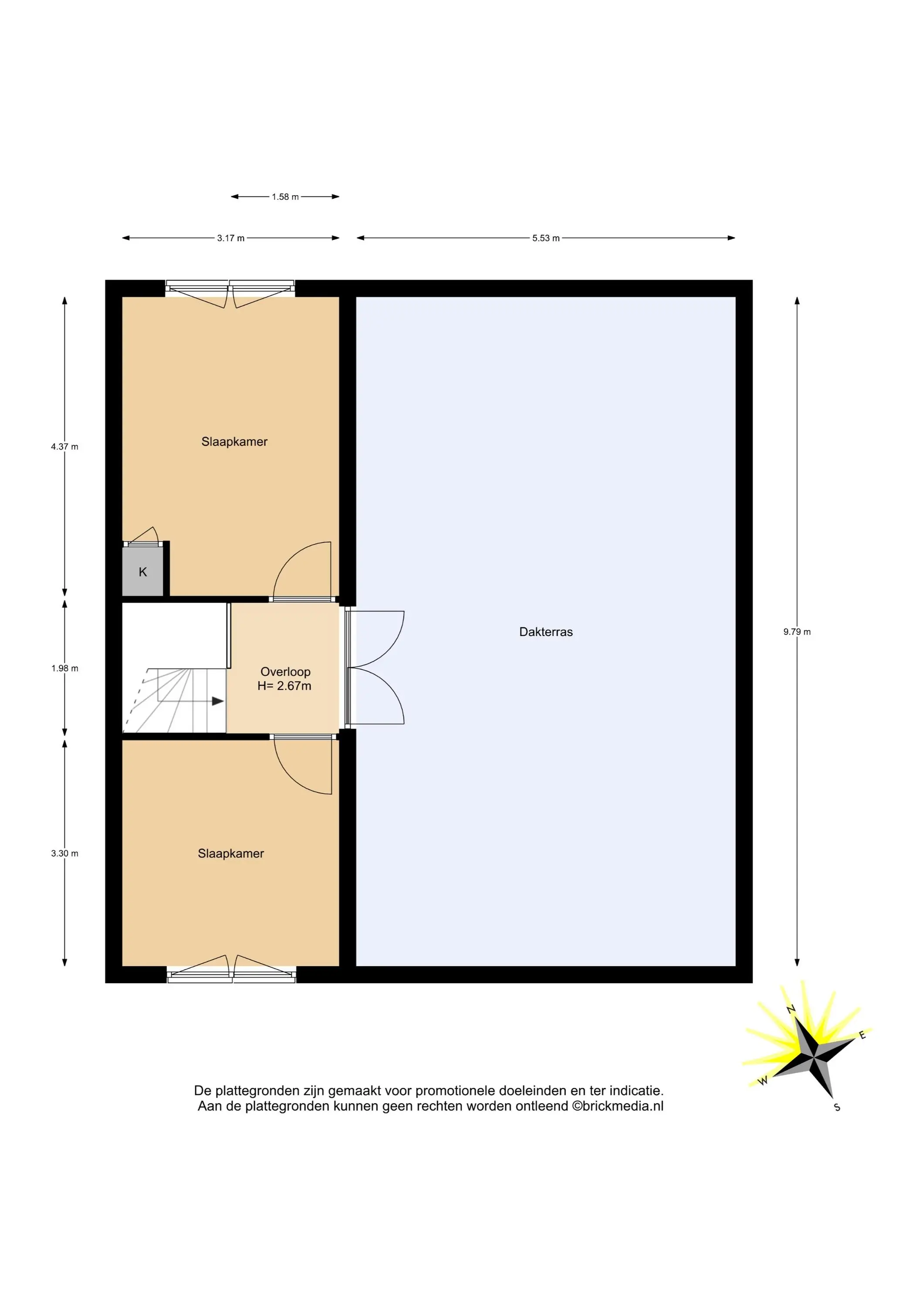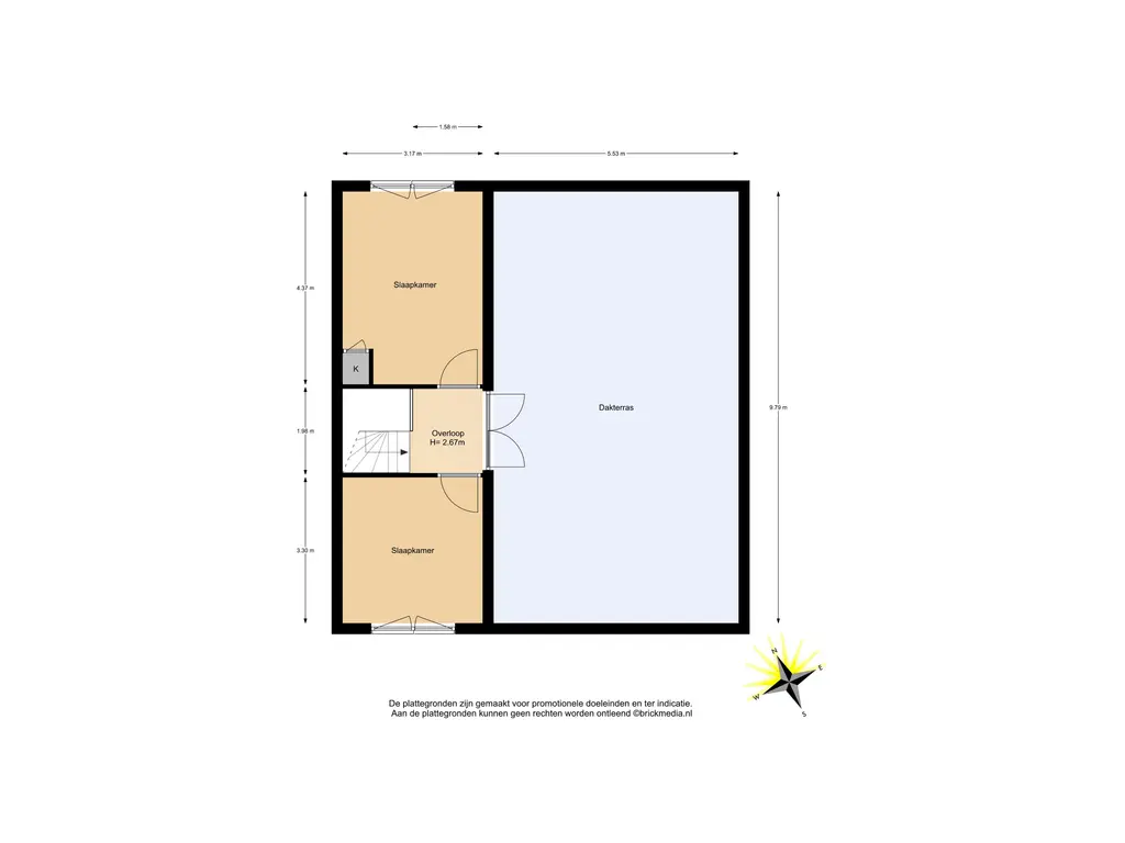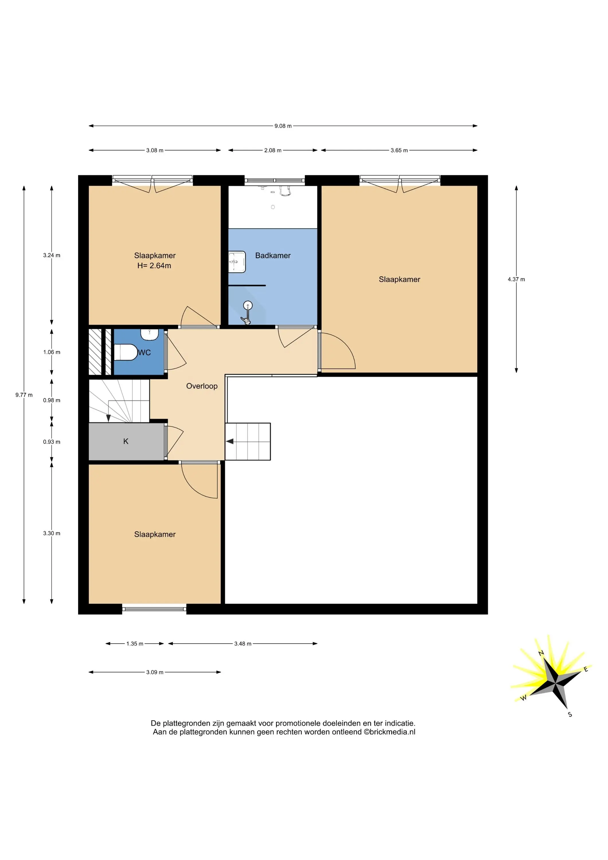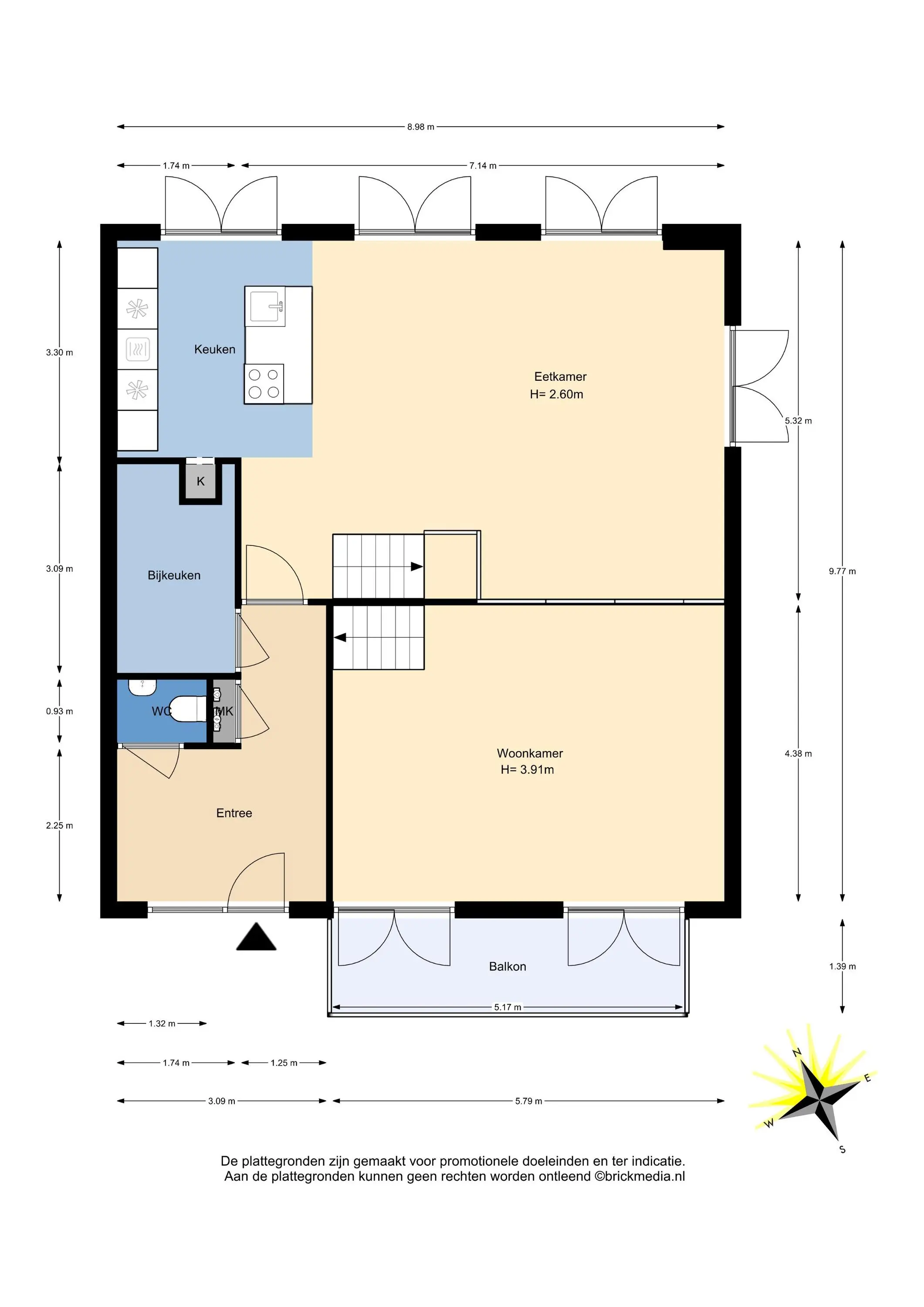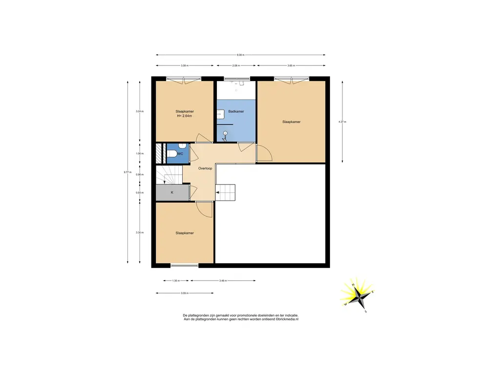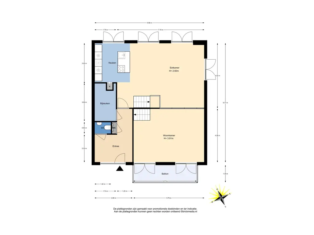 Bovenstaande informatie is door ons met de hoogst nodige zorgvuldigheid samengesteld. Door ons wordt echter geen enkele aansprakelijkheid aanvaard voor enige onvolledigheid, onjuistheid of anderszins, dan wel de gevolgen daarvan. Alle opgegeven maten en oppervlakten zijn indicatief. De woning is gemeten met gebruikmaking van de Meetinstructie, die is gebaseerd op de normen zoals vastgelegd in NEN 2580. De Meetinstructie is bedoeld om een meer eenduidige manier van meten toe te passen voor het geven van een indicatie van gebruiksoppervlakte. De Meetinstructie sluit verschillen in meetuitkomsten niet volledig uit, door bijvoorbeeld interpretatieverschillen, afrondingen of beperkingen bij het uitvoeren van de meting. Hoewel wij de woning zorgvuldig hebben opgemeten, wordt noch door ons kantoor, noch door de verkoper enige aansprakelijkheid aanvaard voor afwijkingen in de opgegeven maten. Koper wordt in de gelegenheid gesteld om de opgegeven maten te (laten) controleren.
