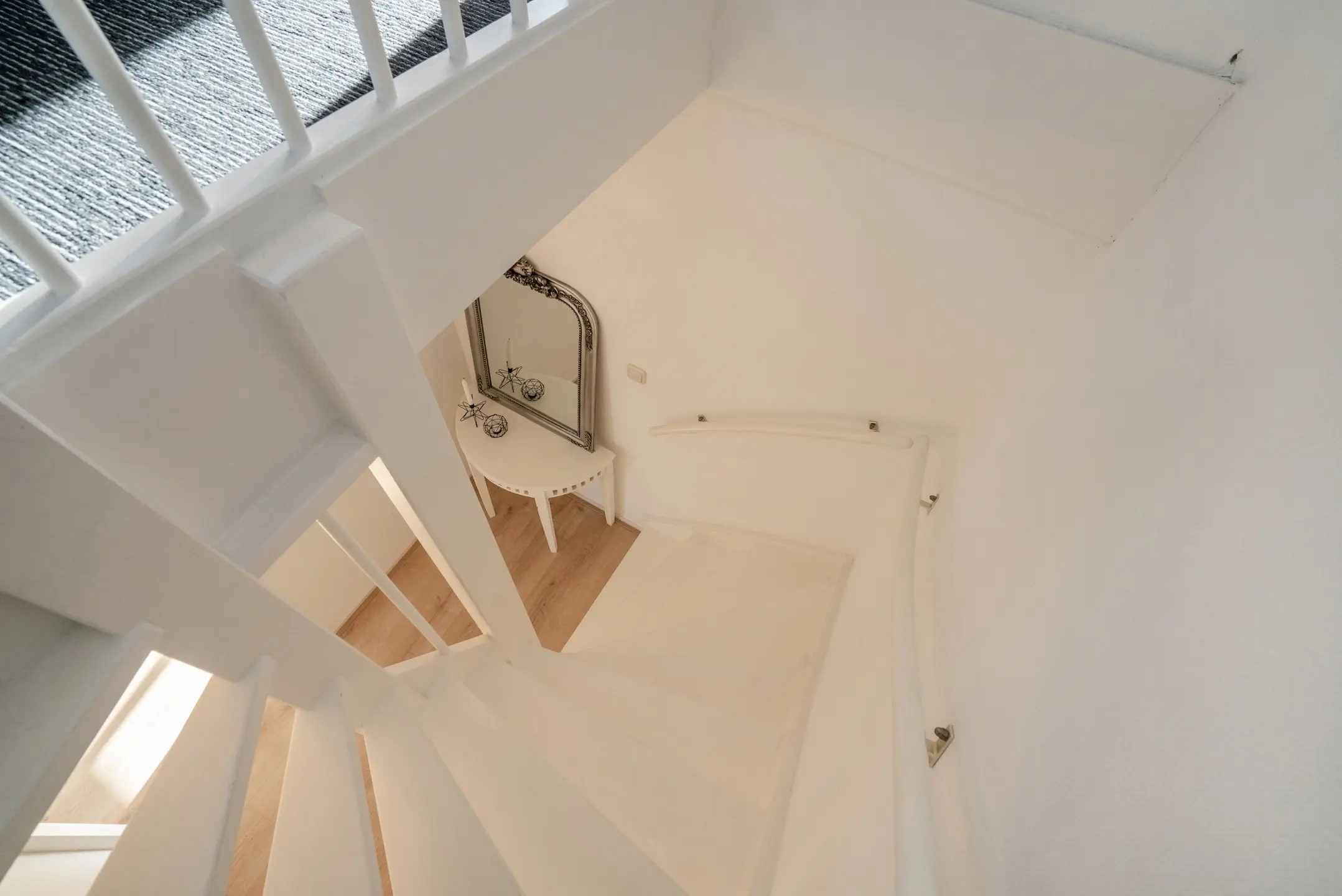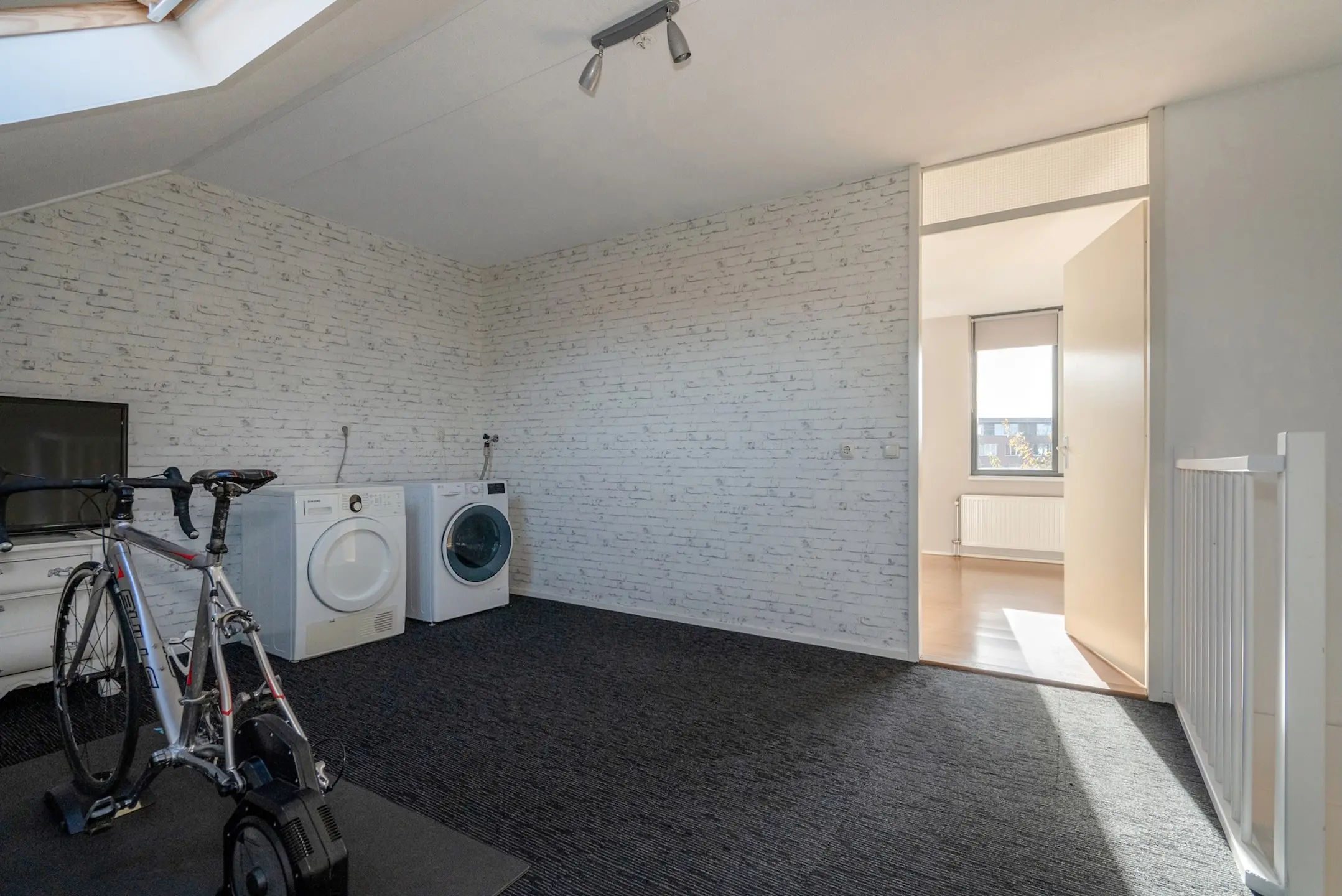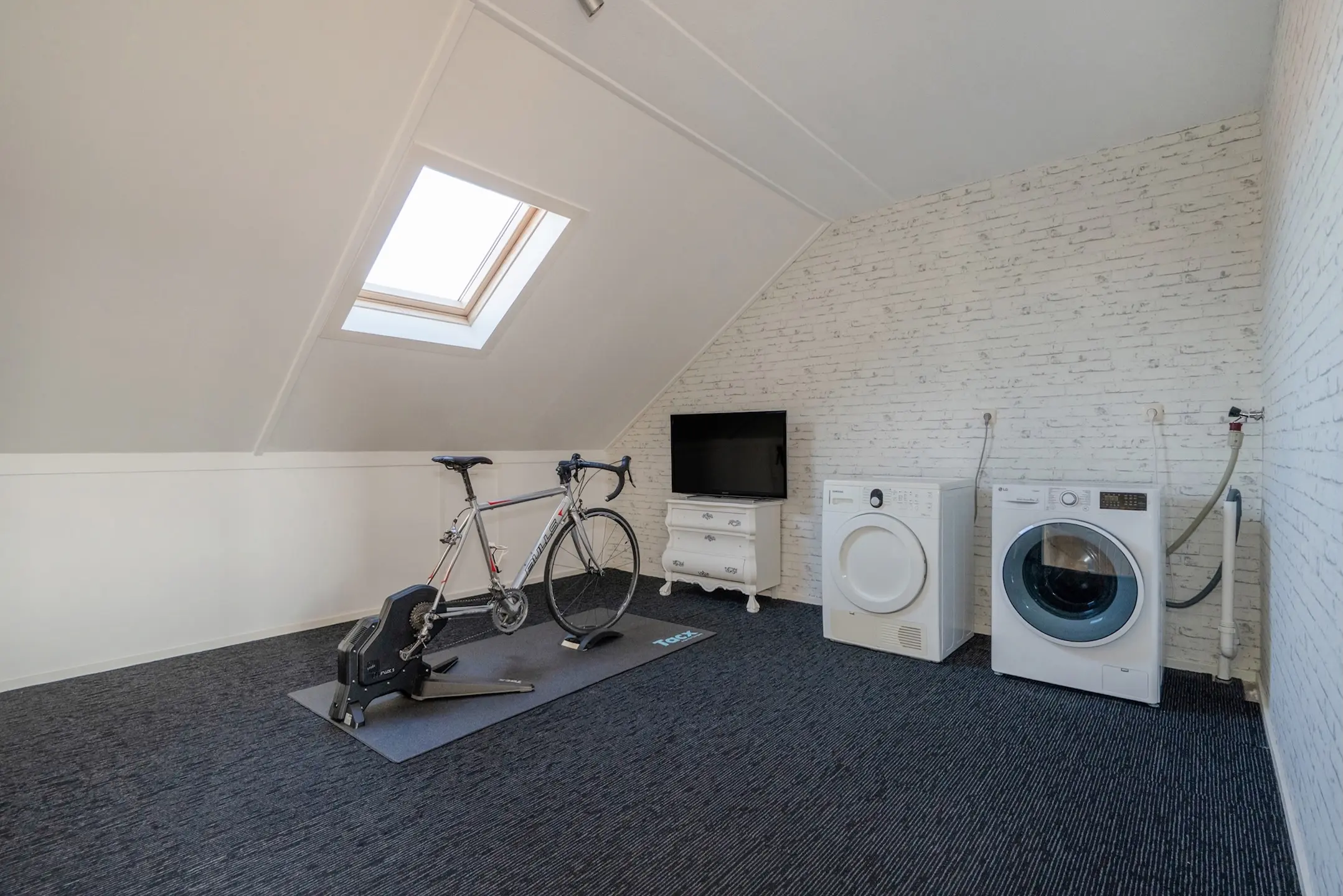 2e verdieping: grote lichte overloop met Velux dakraam, wasmachine opstelplaats en mechanische ventilatie (de overloop is zo groot dat men ook eventueel een studeerruimte kan maken), veel bergruimte achter de knieschotten, 3e grote slaapkamer (volle breedte van de woning) aan de voorkant gelegen voorzien van een laminaatvloer.