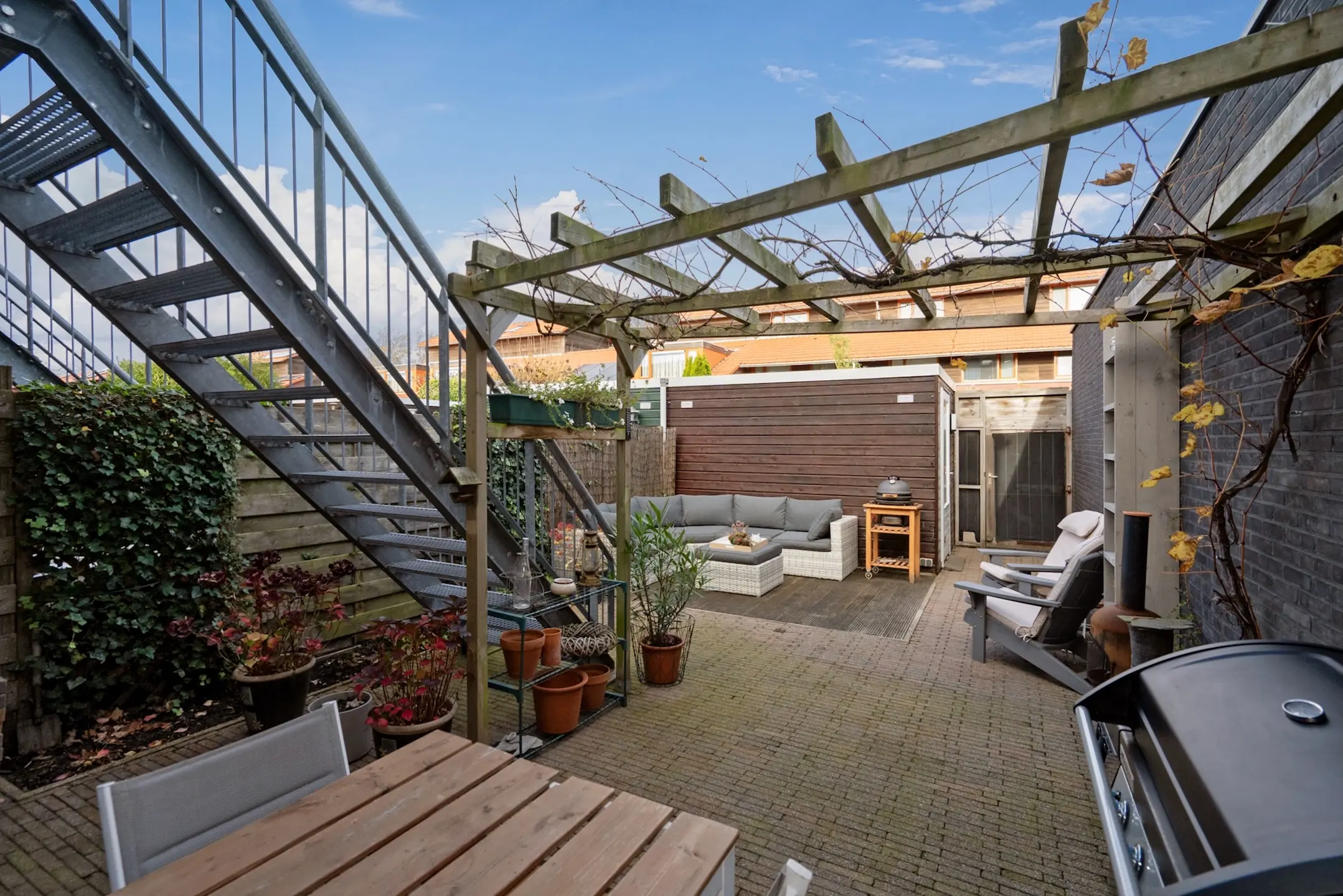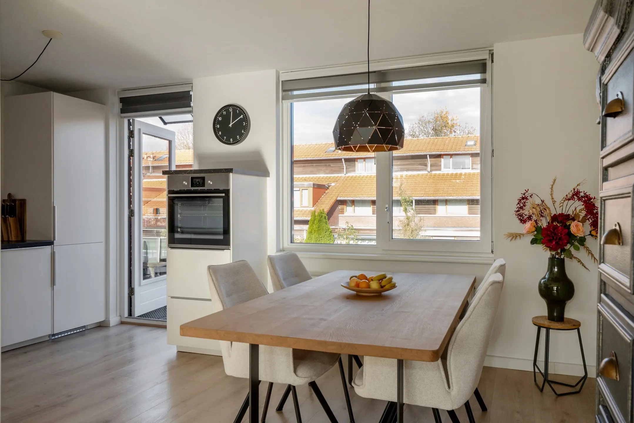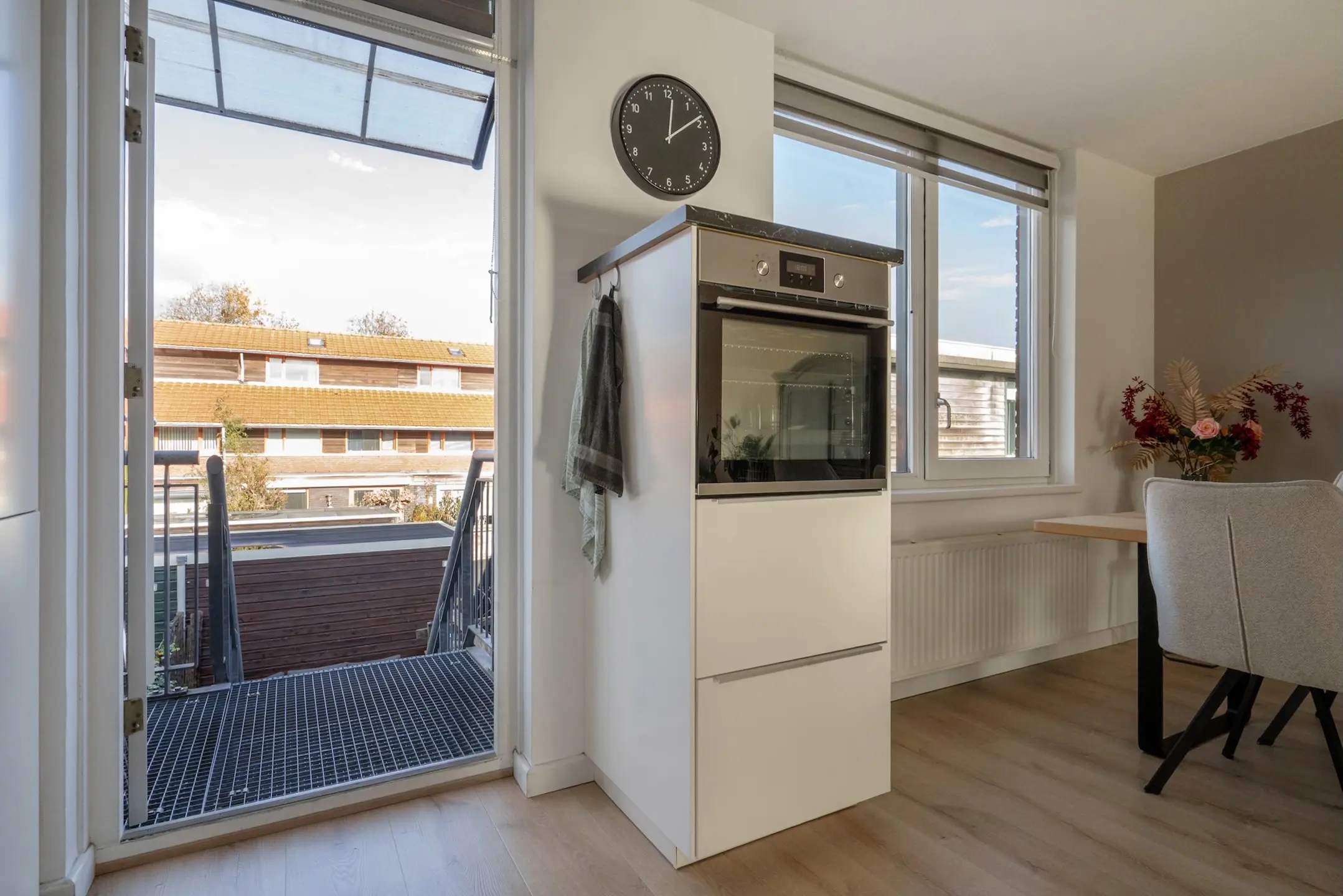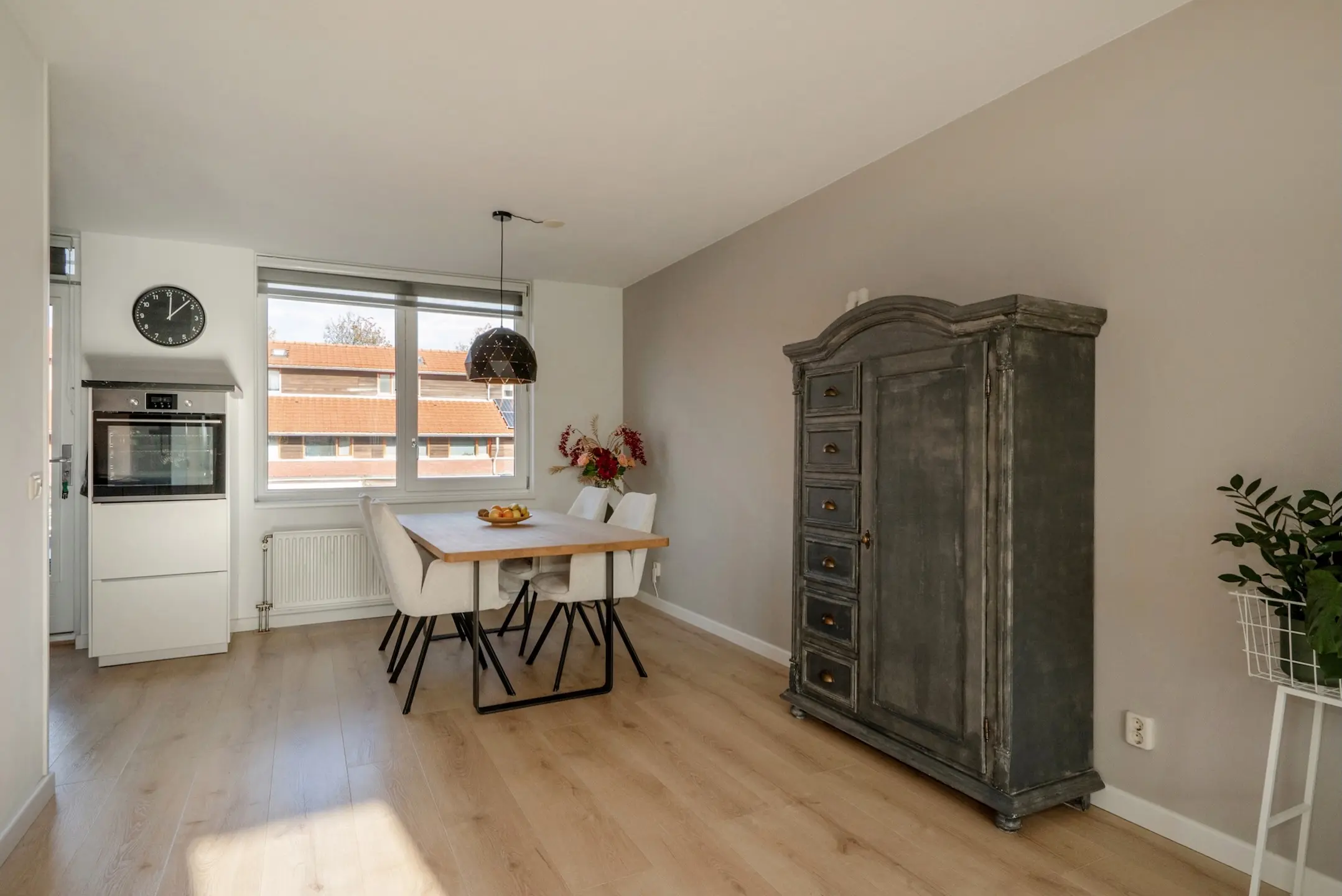 1e verdieping: lichte woon-/eetkamer met voorgelegen living en schuifpui naar het Franse balkon met leuk uitzicht op het kindvriendelijke plantsoen, achtergelegen eetgedeelte met mooie in L-vorm geplaatste keuken voorzien van een carrousel, RVS afzuigkap en diverse inbouwapparatuur w.o. inductie kookplaat, vaatwasser, koelkast, vriezer en combi oven. Via de keuken, middels een buitentrap, bereikt men de achtertuin met berging en achterom. De gehele verdieping beschikt over een mooie laminaat vloer.