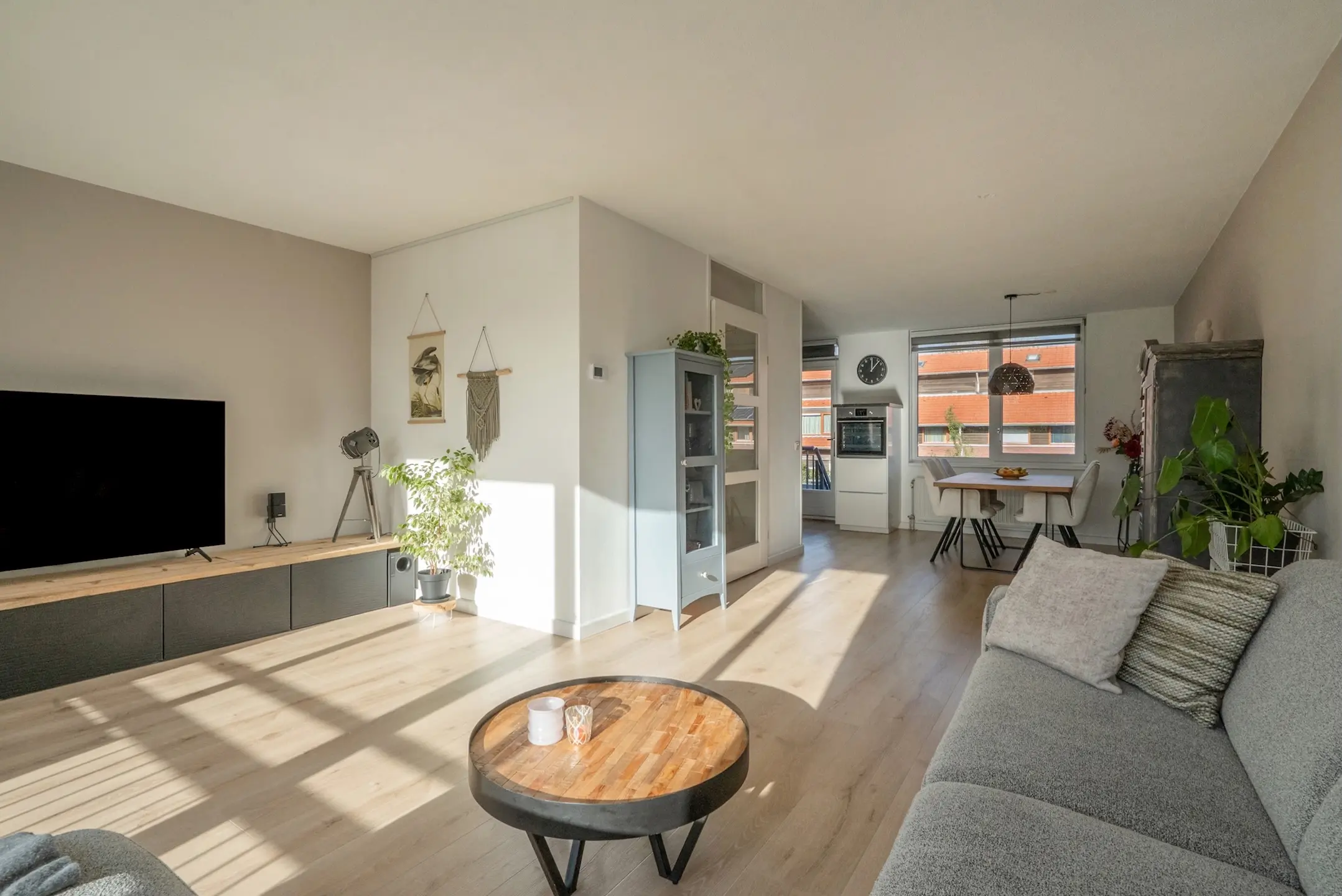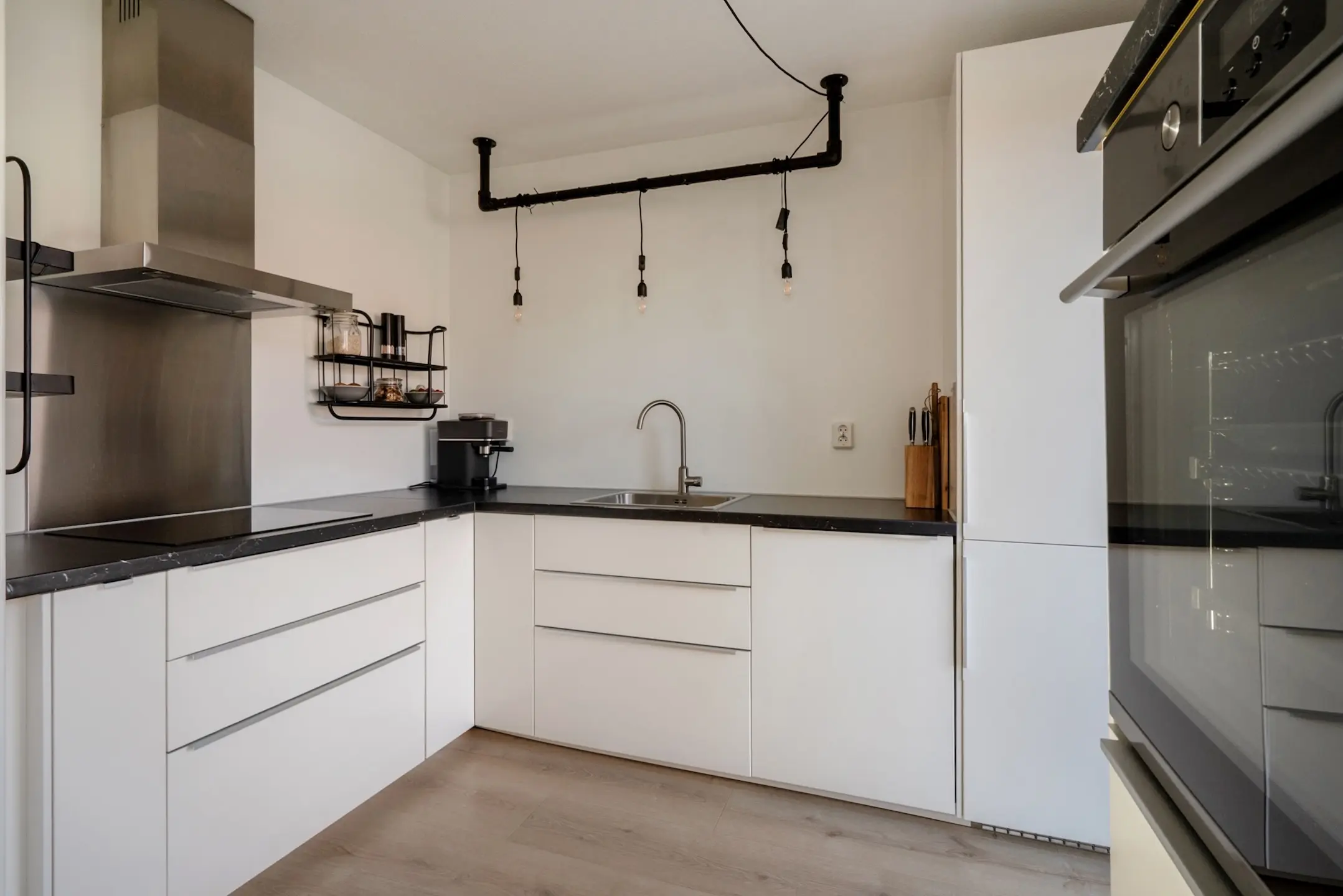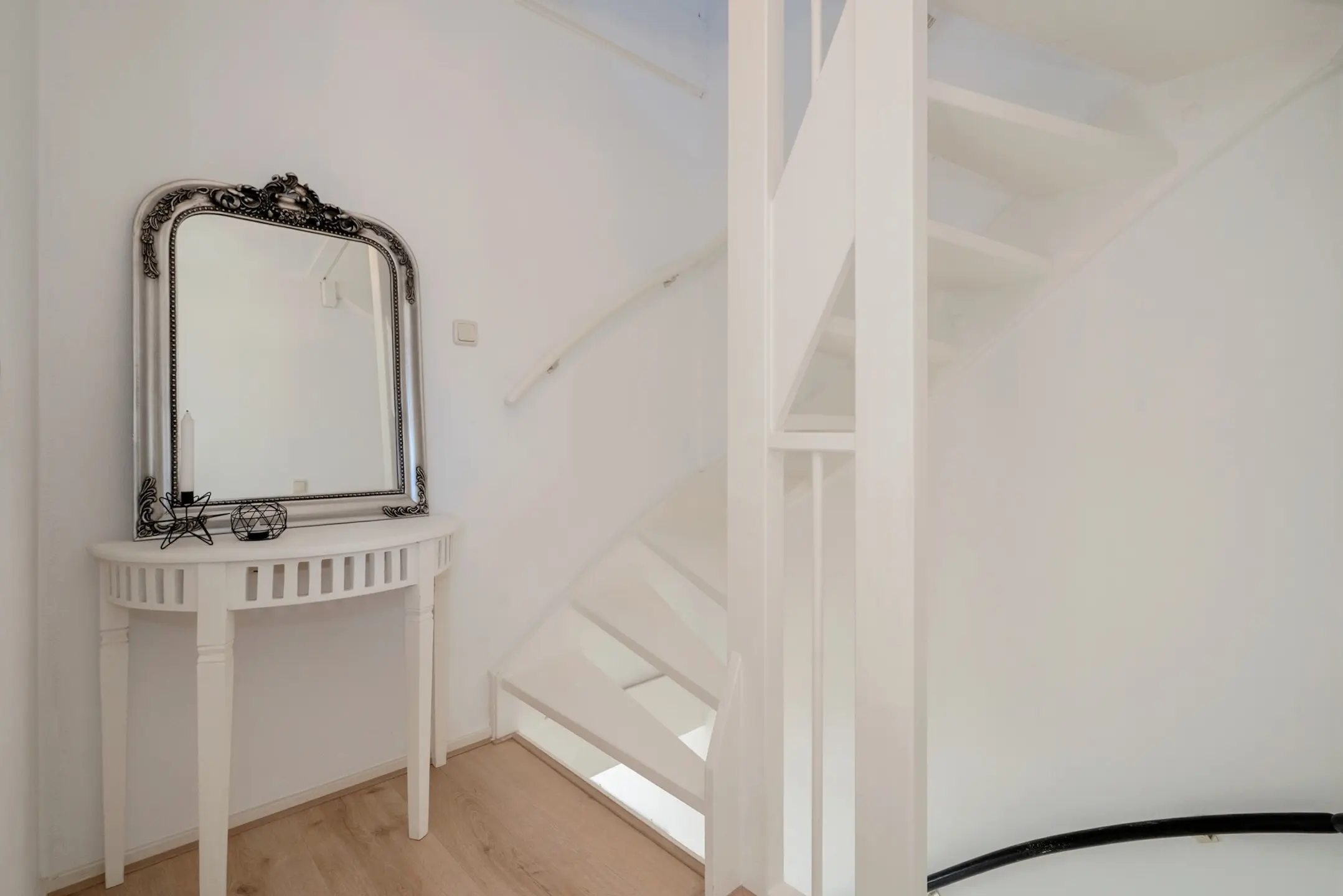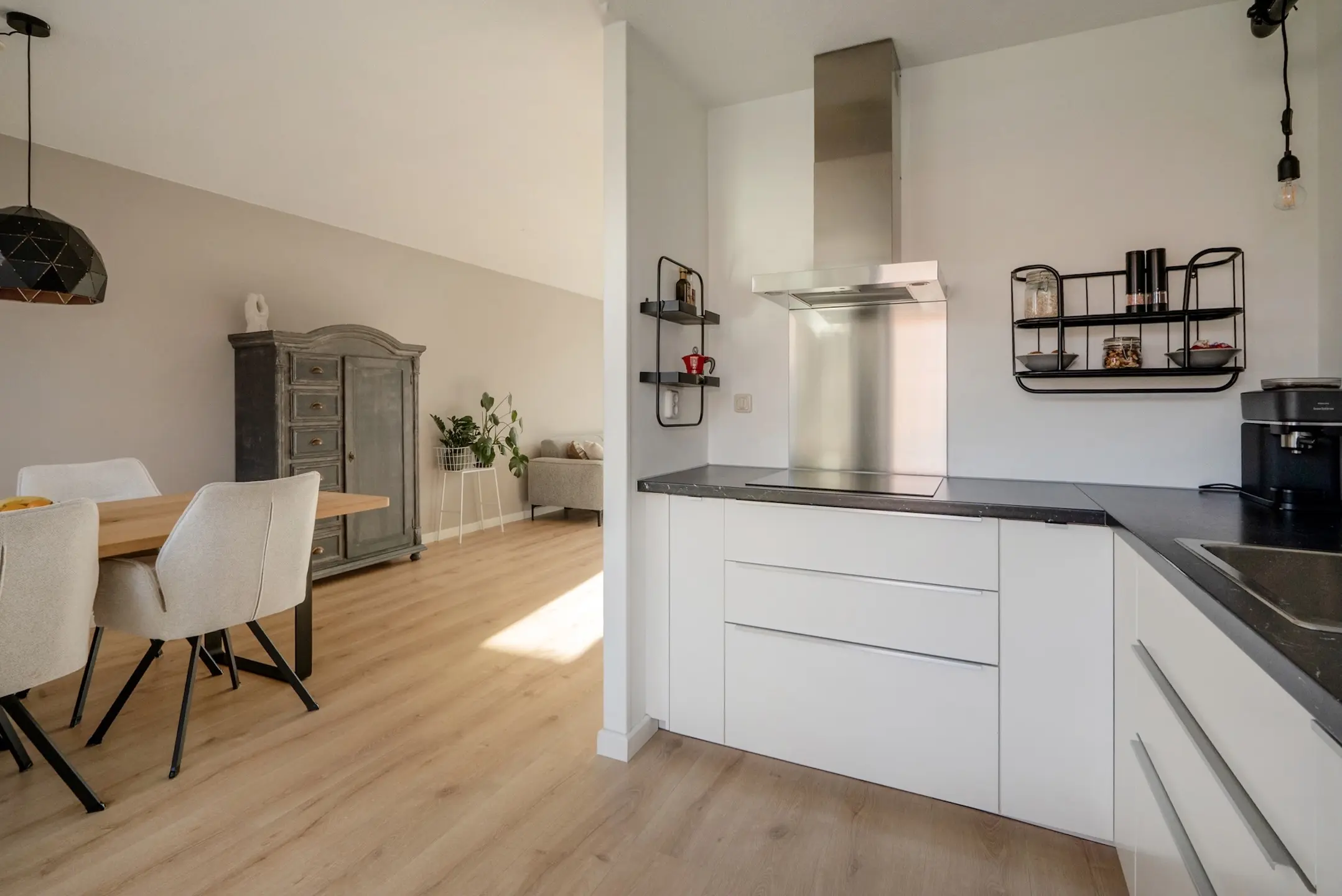 1e verdieping: lichte woon-/eetkamer met voorgelegen living en schuifpui naar het Franse balkon met leuk uitzicht op het kindvriendelijke plantsoen, achtergelegen eetgedeelte met mooie in L-vorm geplaatste keuken voorzien van een carrousel, RVS afzuigkap en diverse inbouwapparatuur w.o. inductie kookplaat, vaatwasser, koelkast, vriezer en combi oven. Via de keuken, middels een buitentrap, bereikt men de achtertuin met berging en achterom. De gehele verdieping beschikt over een mooie laminaat vloer.