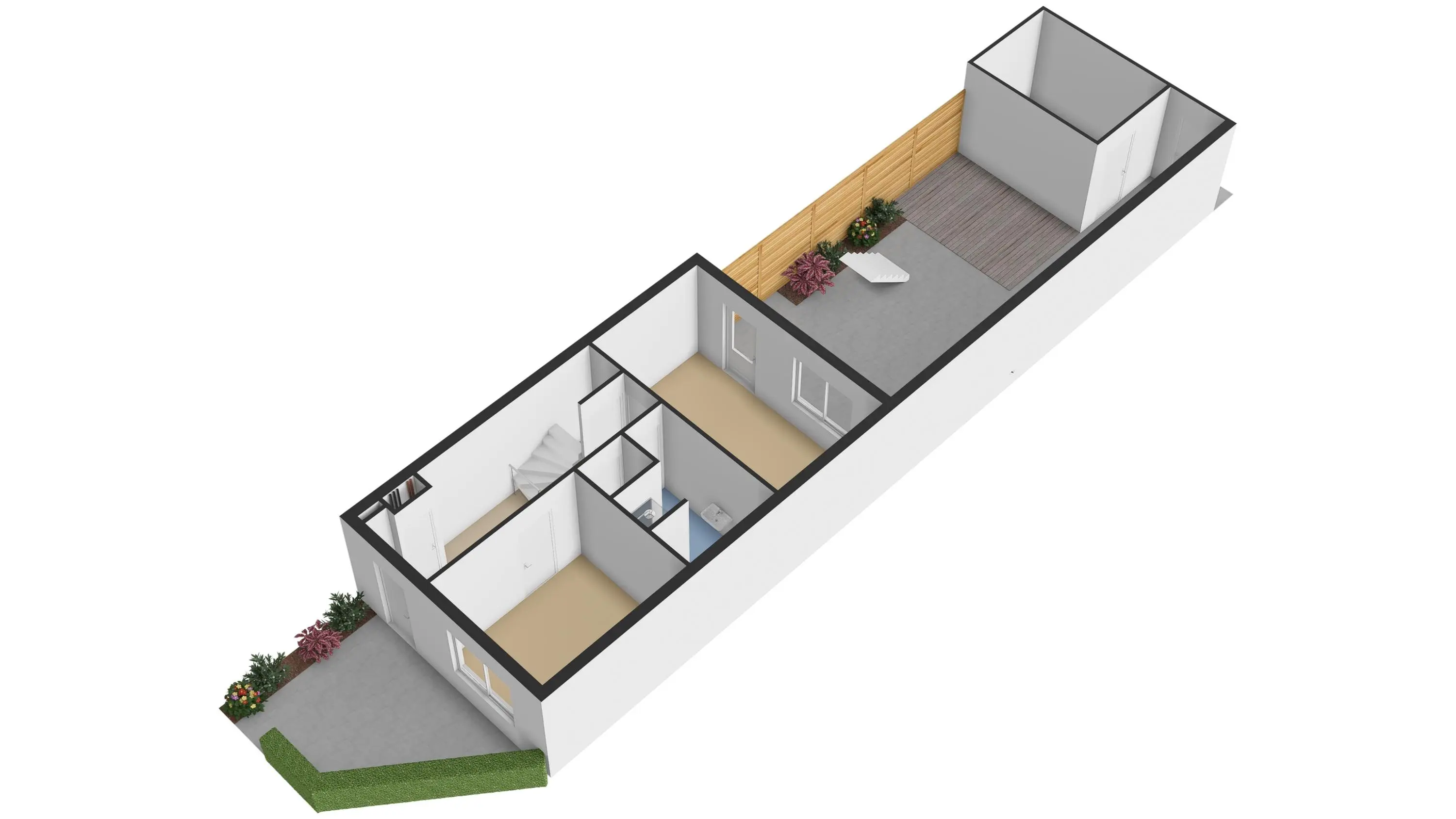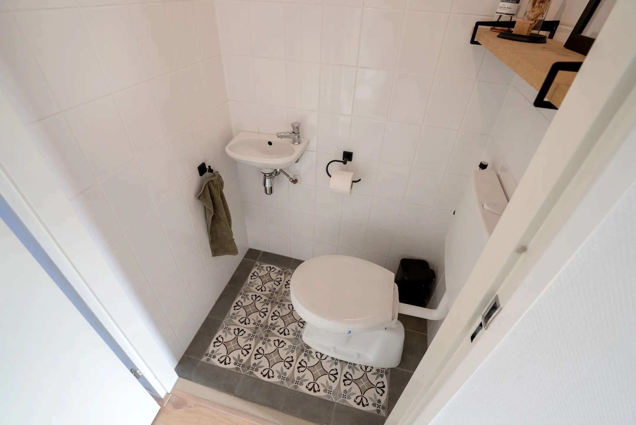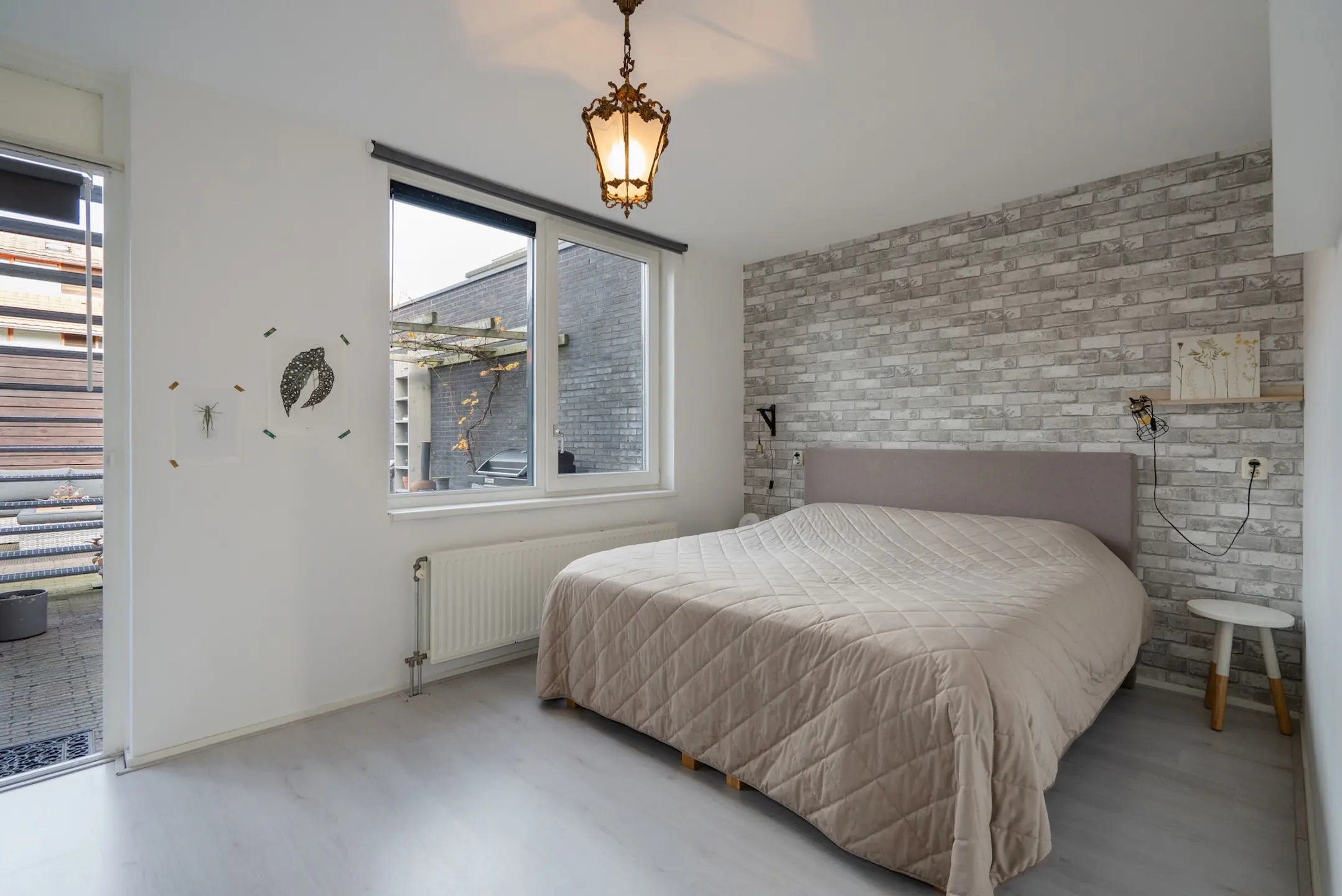 Indeling: entree woning, hal, garderoberuimte, meterkast (incl. glasvezelaansluiting), trapkast, net toilet met fontein, voorgelegen slaapkamer, keurige badkamer (geheel betegeld) met ligbad, separate douche en wastafelmeubel, achtergelegen hoofdslaapkamer (over de volle breedte van de woning) met toegang tot de zonnige achtertuin met houten berging en achterom. De gehele begane grond is voorzien van een mooie laminaat vloer.