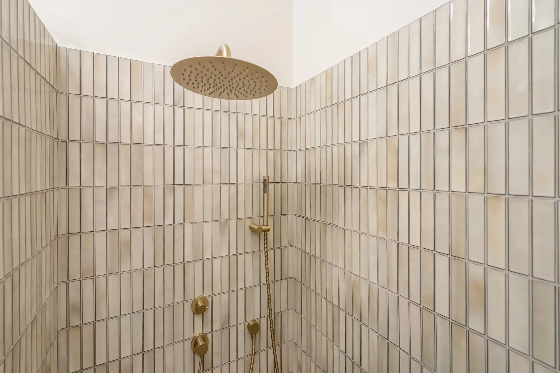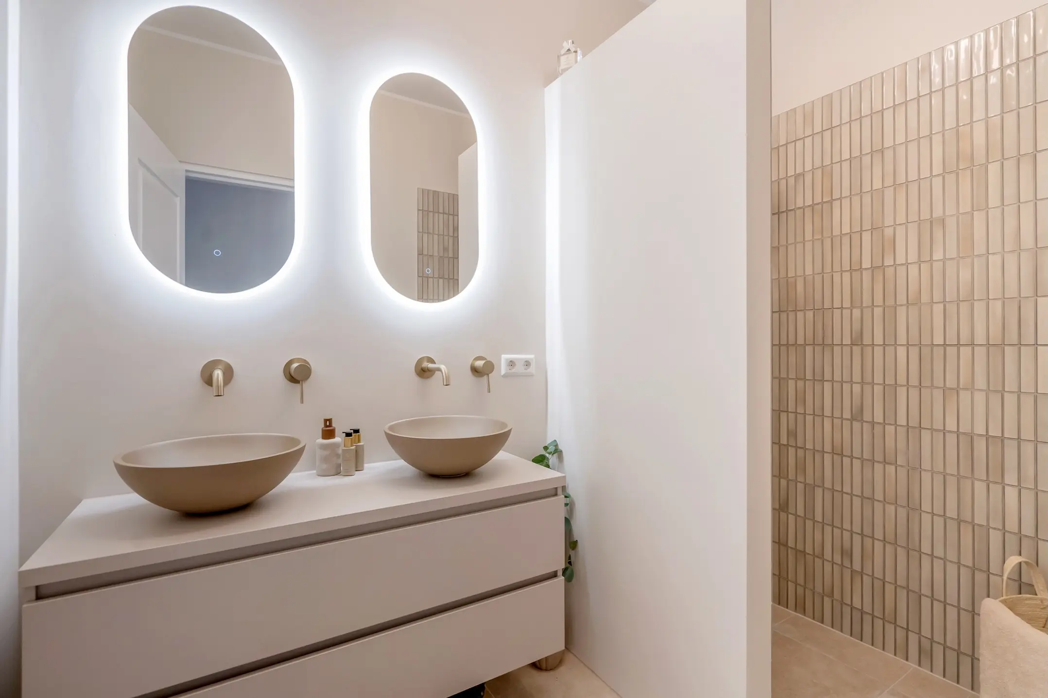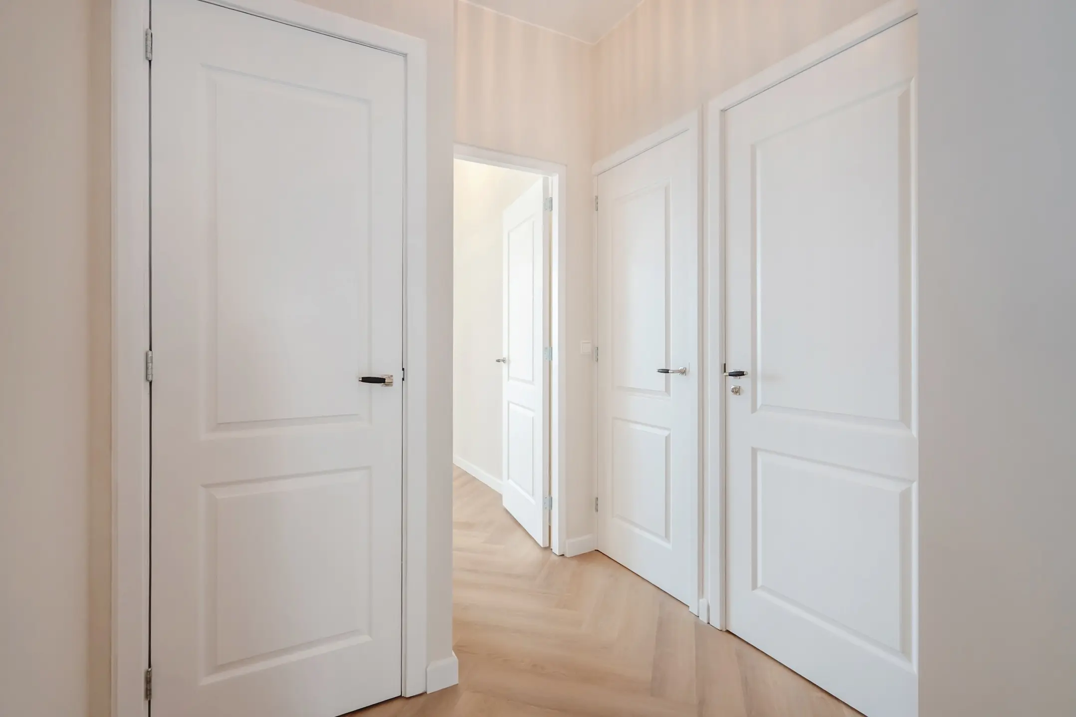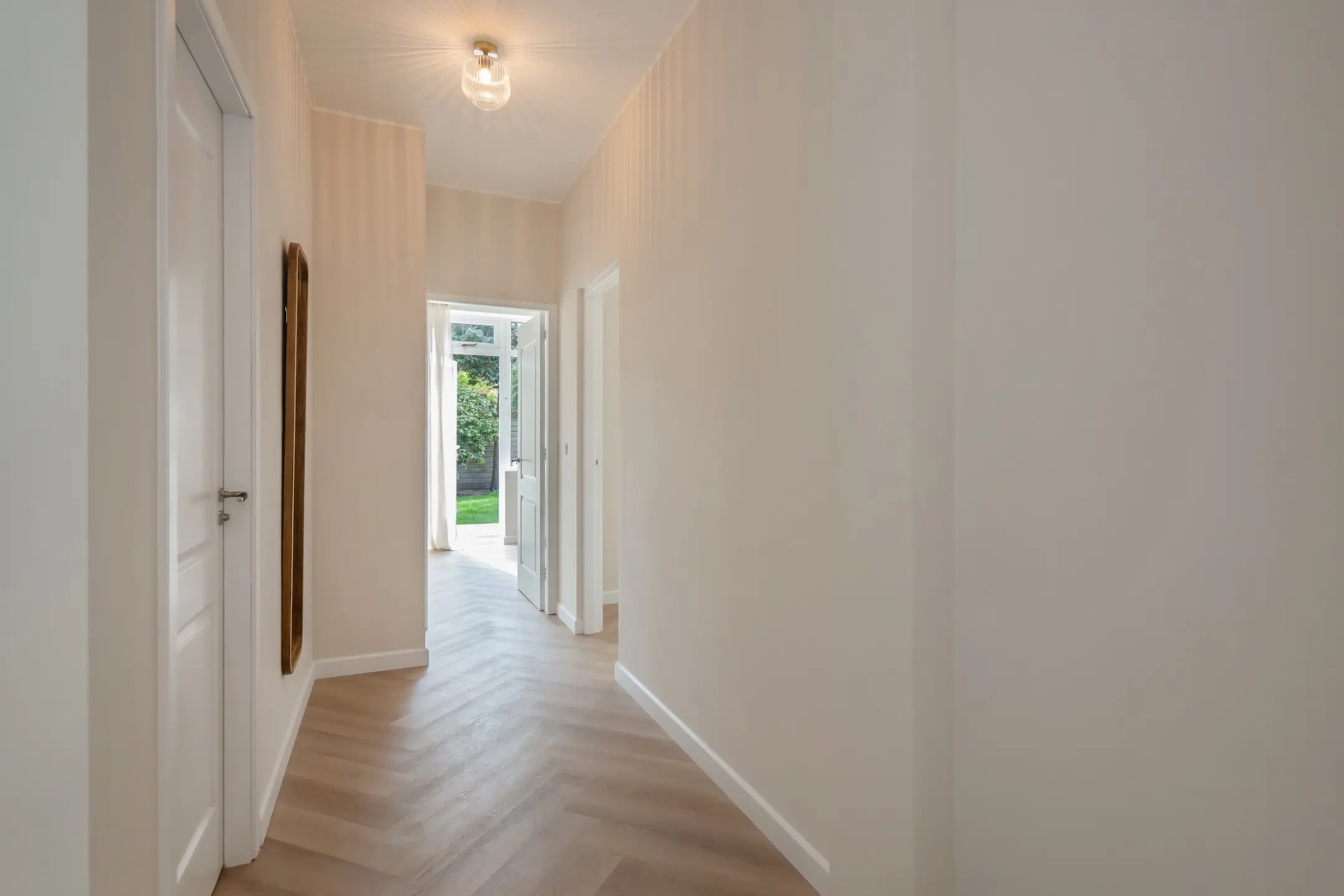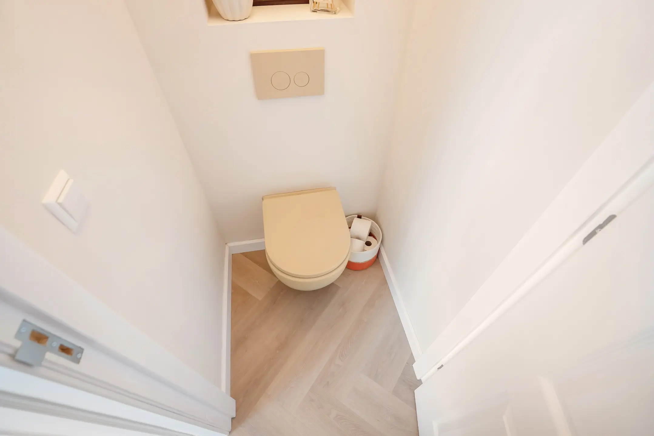 Vanuit de woonkamer bereik je de hal, waar je praktische voorzieningen vindt zoals een vaste kast met de opstelplaats van de cv-ketel (Intergas, 2026) en een royale trapkast met aansluiting voor de wasmachine. Daarnaast is er een separaat toilet en een luxe afgewerkte badkamer, voorzien van een ruime inloopdouche en een stijlvol dubbel wastafelmeubel.