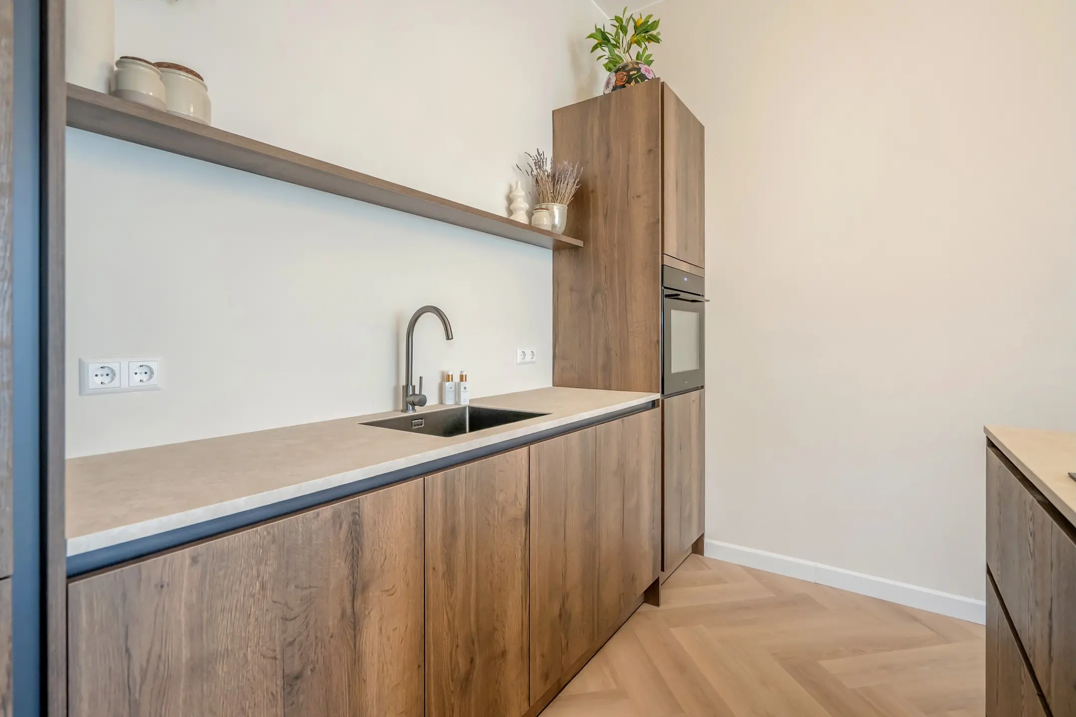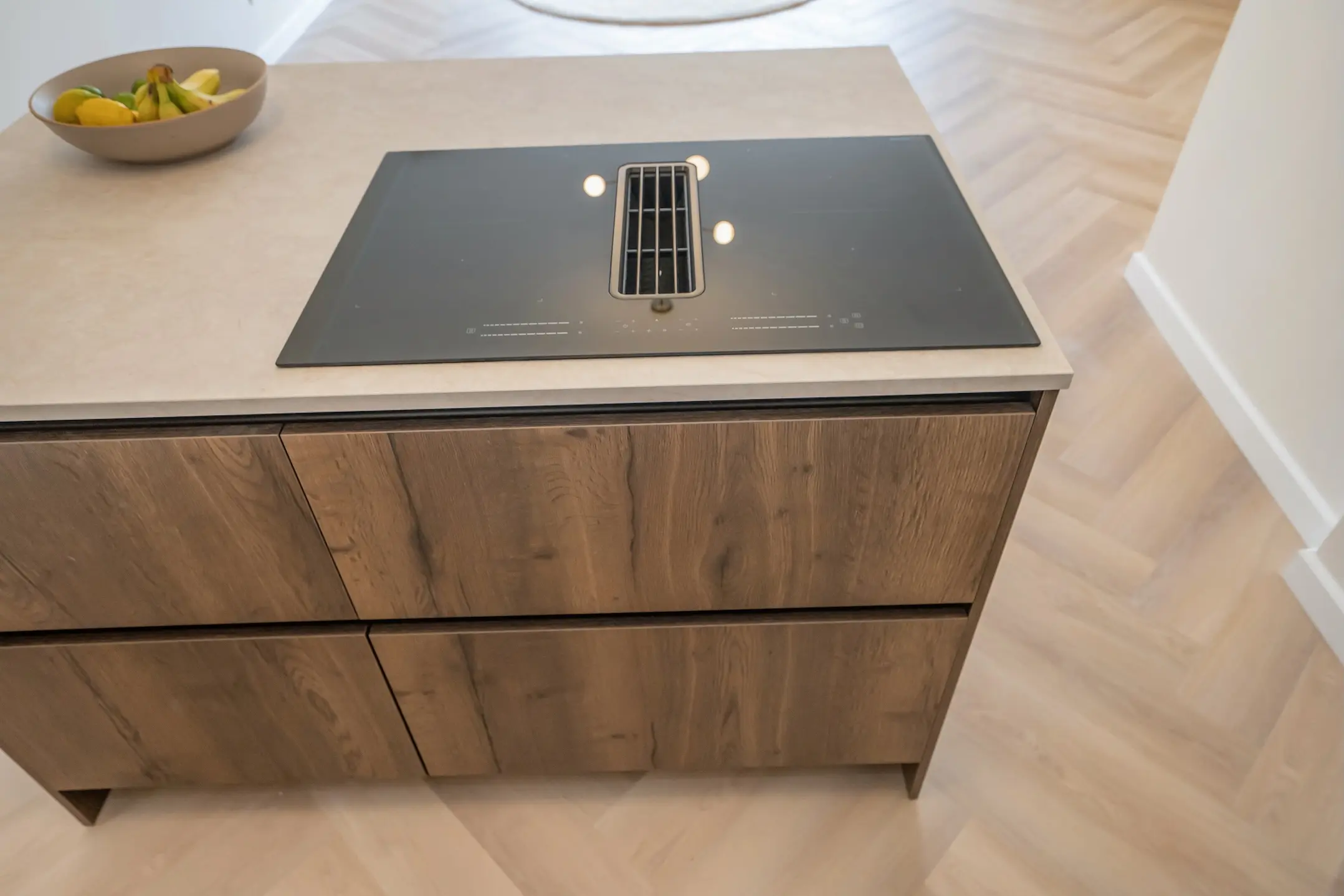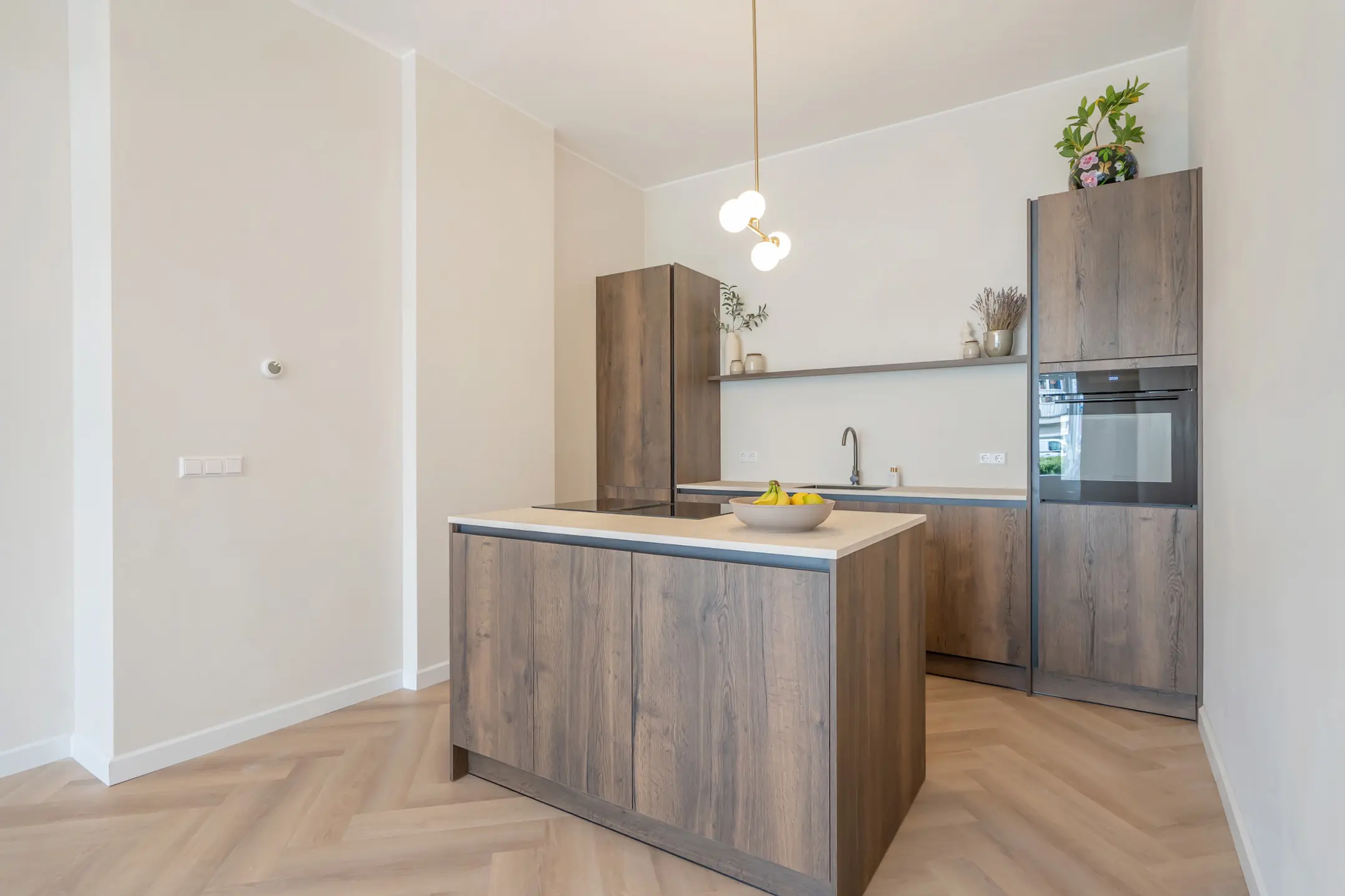 Aan de achterzijde bevindt zich de luxe woonkeuken, uitgevoerd in een warme walnootkleur. Deze moderne keuken is van alle gemakken voorzien, met onder andere een koel-/vriescombinatie, combi-oven en vaatwasser. Het kookeiland met inductiekookplaat en geïntegreerde afzuiging vormt het kloppend hart van de ruimte – dé plek waar koken en gezelligheid samenkomen.