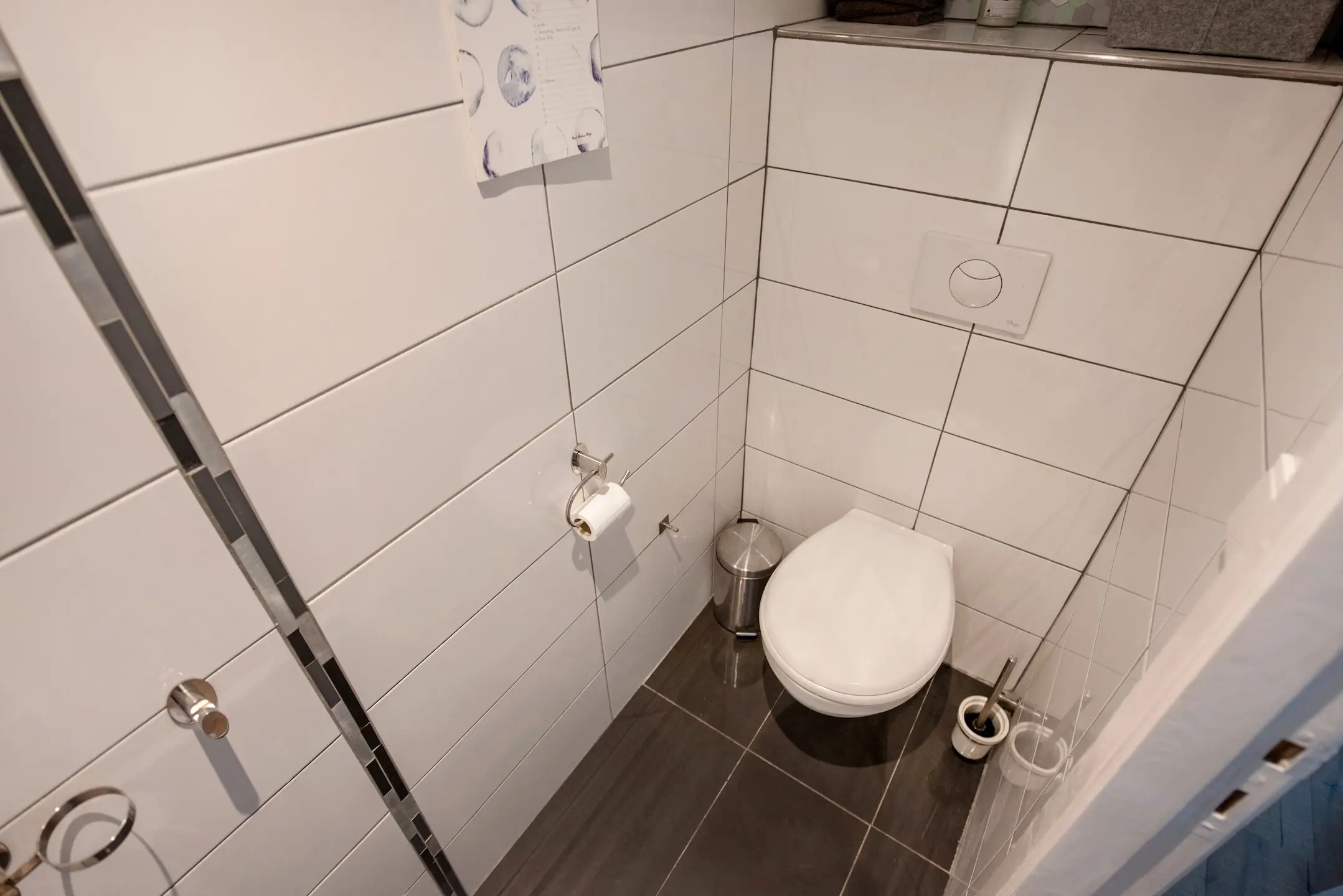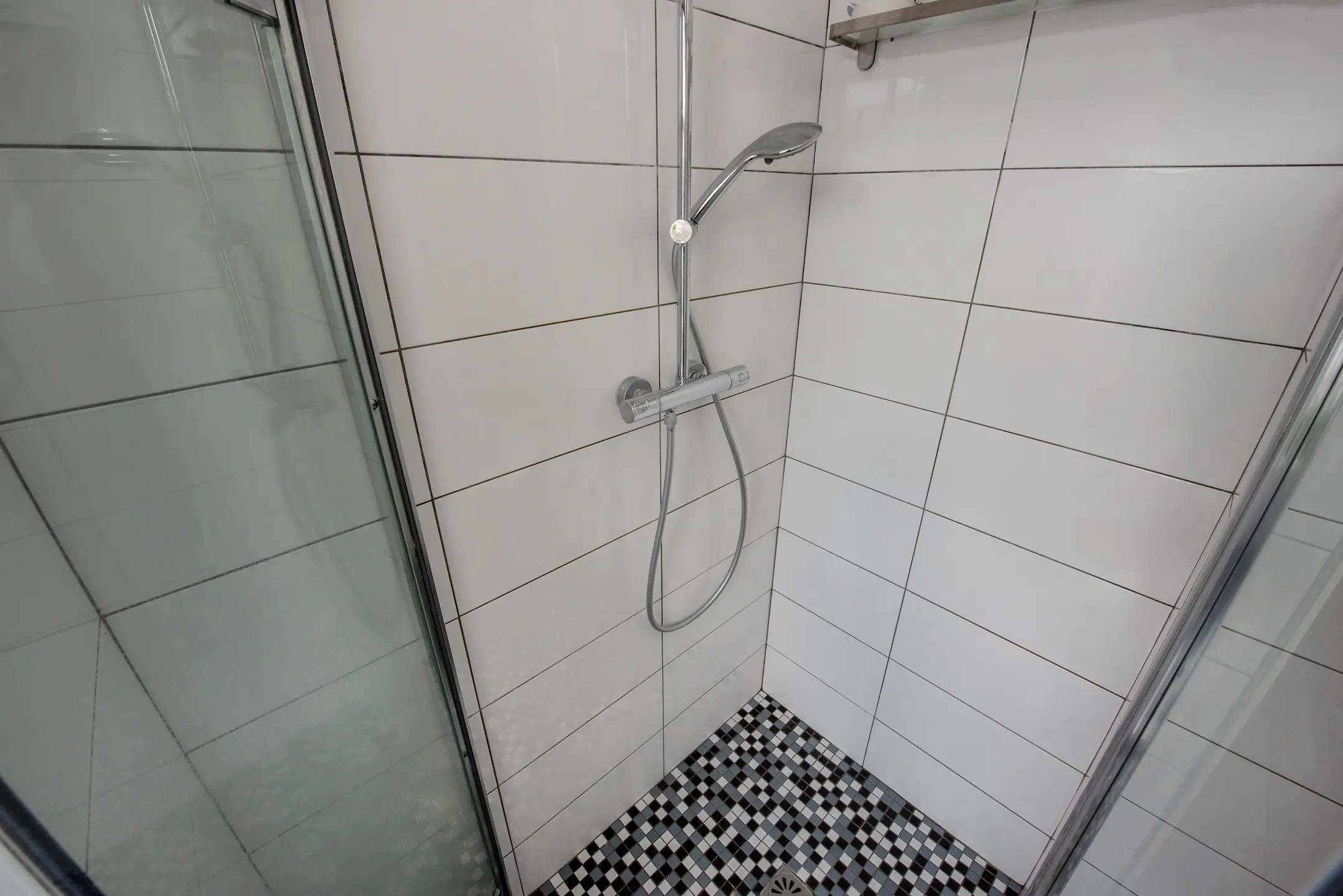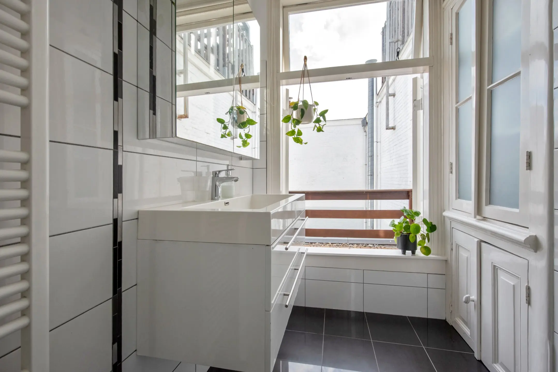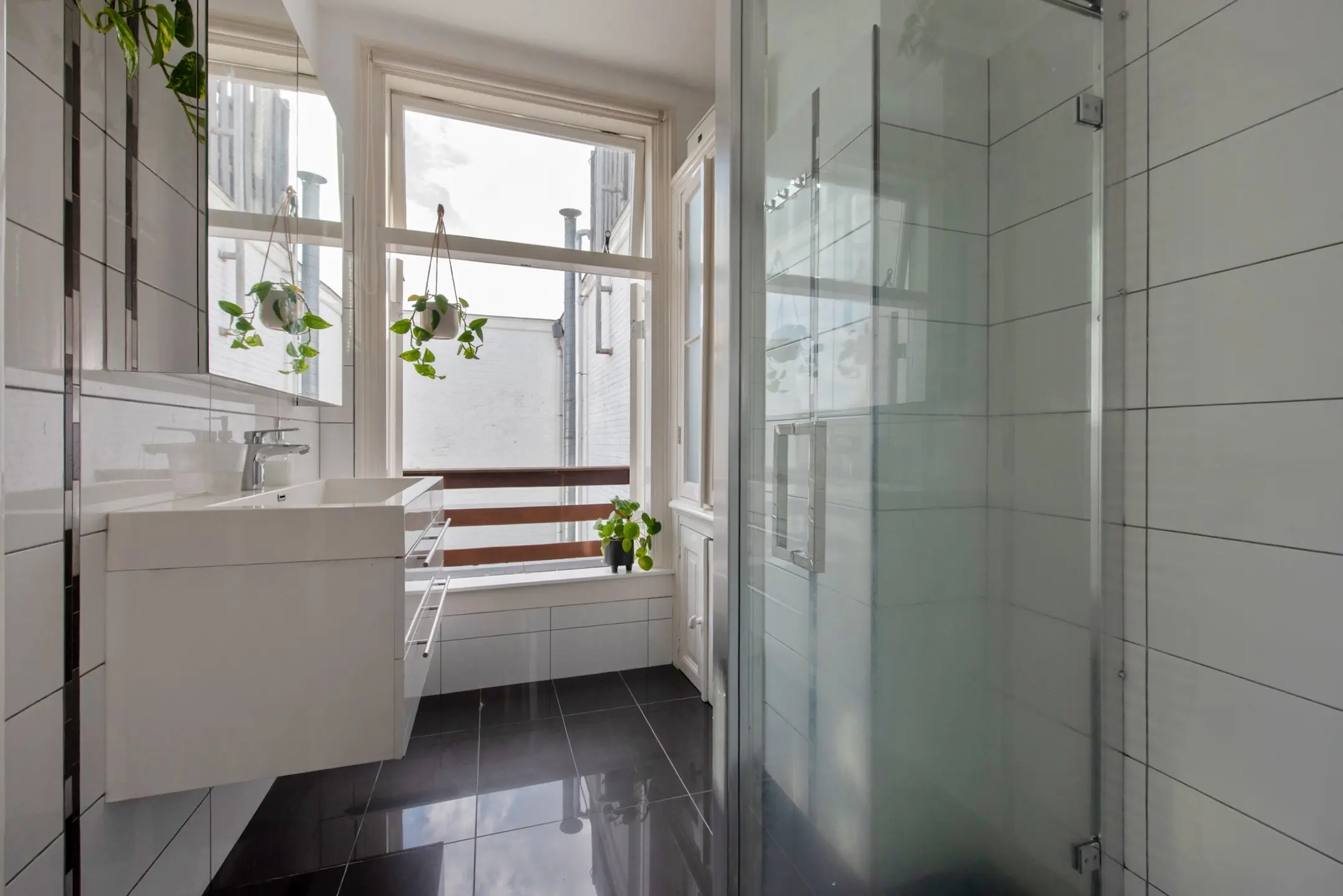 Badkamer met doucheruimte voorzien van glazen spatschermen, thermostaatkraan en Rainshower. Wastafelmeubel met spiegelkast en vaste badkamerkast. Via openslaande ramen toegang tot het balkon aan de achterzijde.