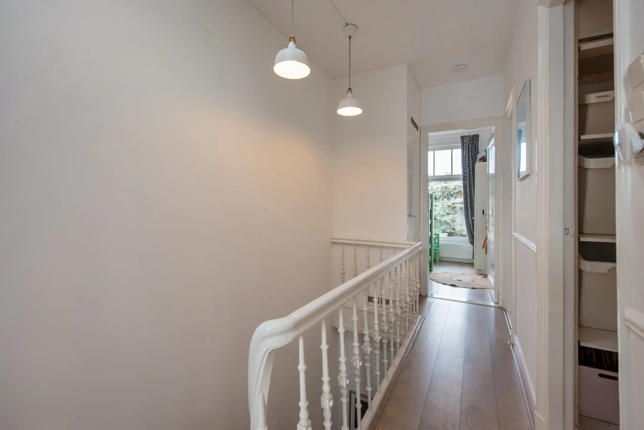 Tweede verdieping: overloop met een dakraam, vaste kast met de opstelplaats van de cv-combi ketel (Intergas Kompakt HRE) en de wasmachine. Royale slaapkamer aan de voorzijde met draai-/kantelramen, eveneens royale slaapkamer aan de achterzijde, thans in gebruik als hoofdslaapkamer, de voorzijkamer is de derde slaapkamer op deze verdieping, is evt. ideaal om als walk-in closet te gebruiken.
