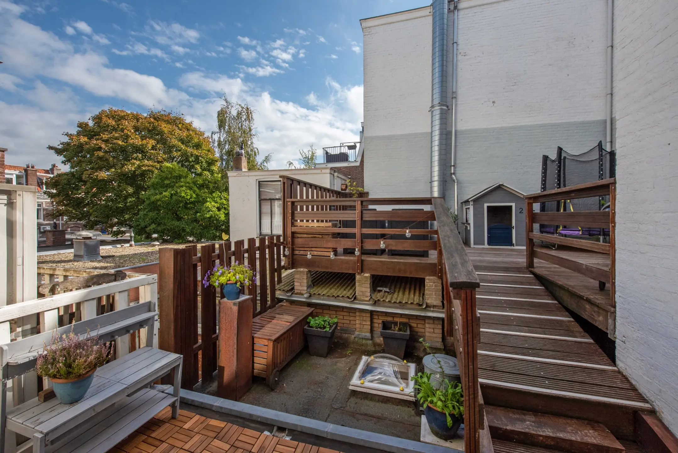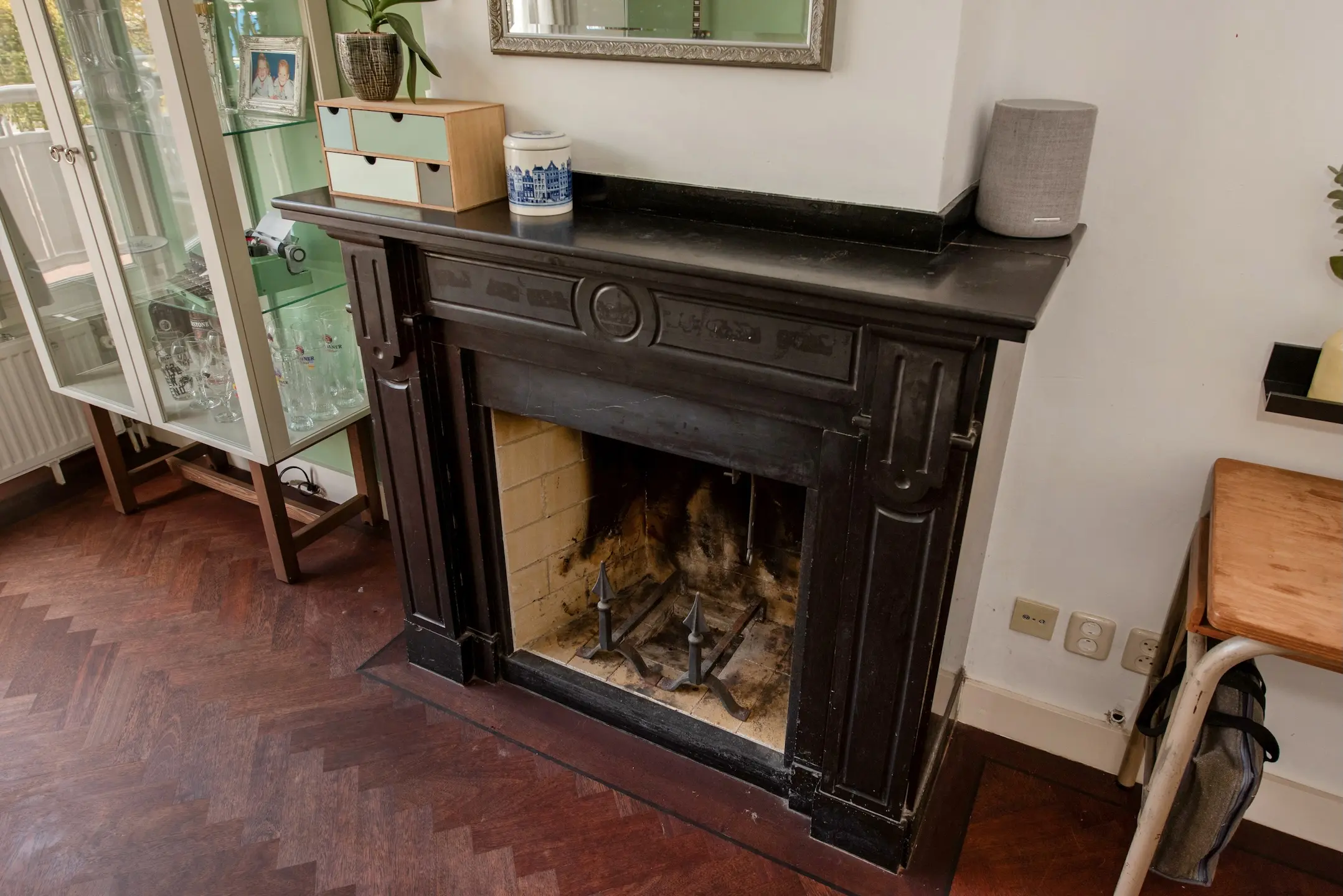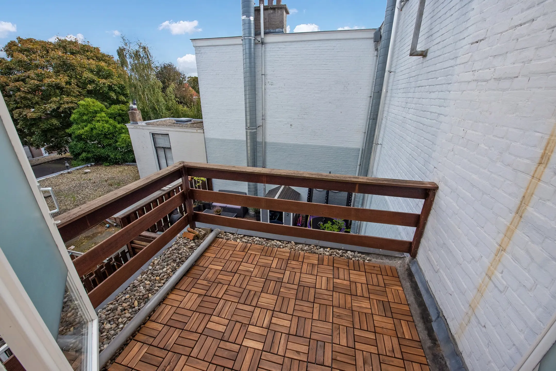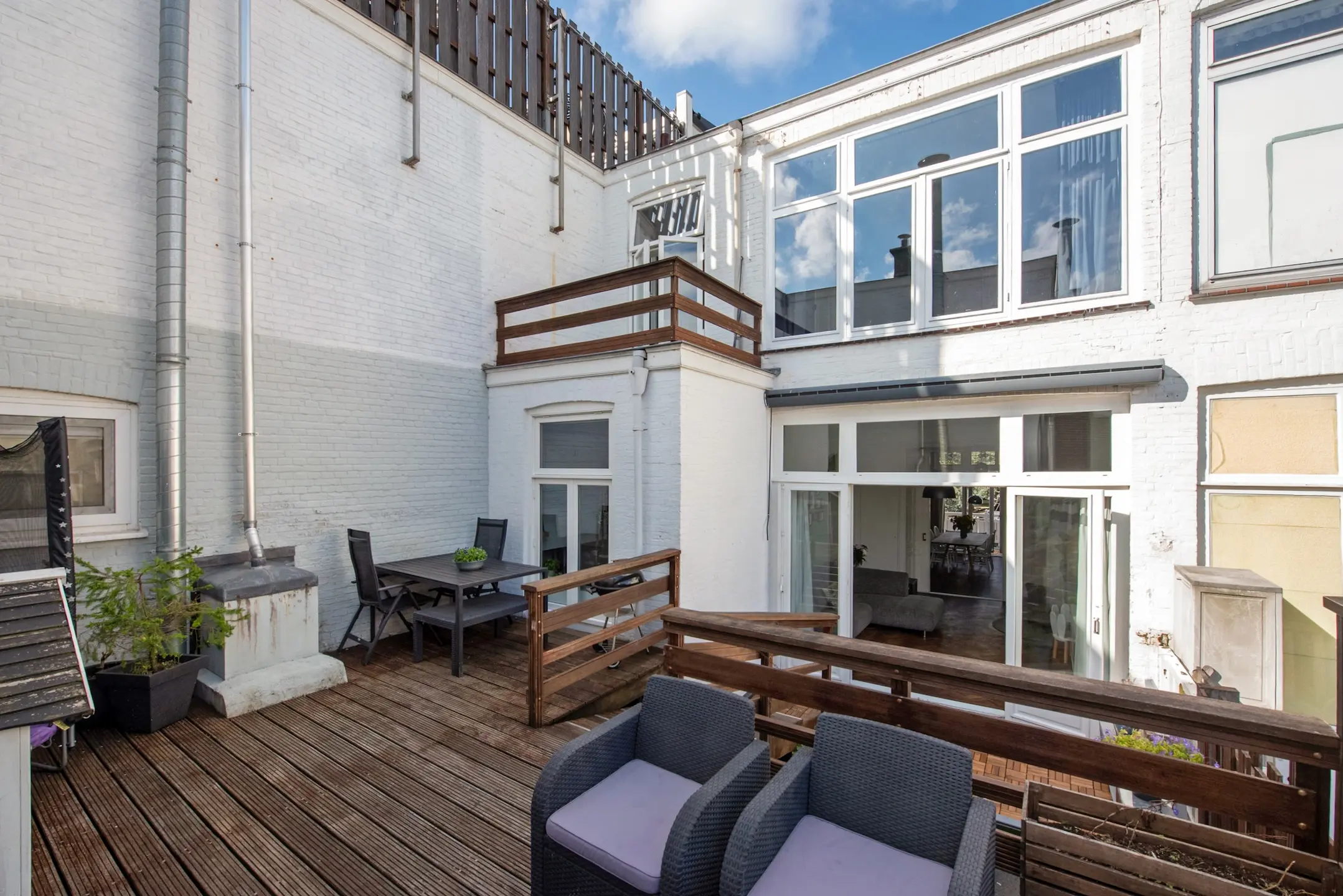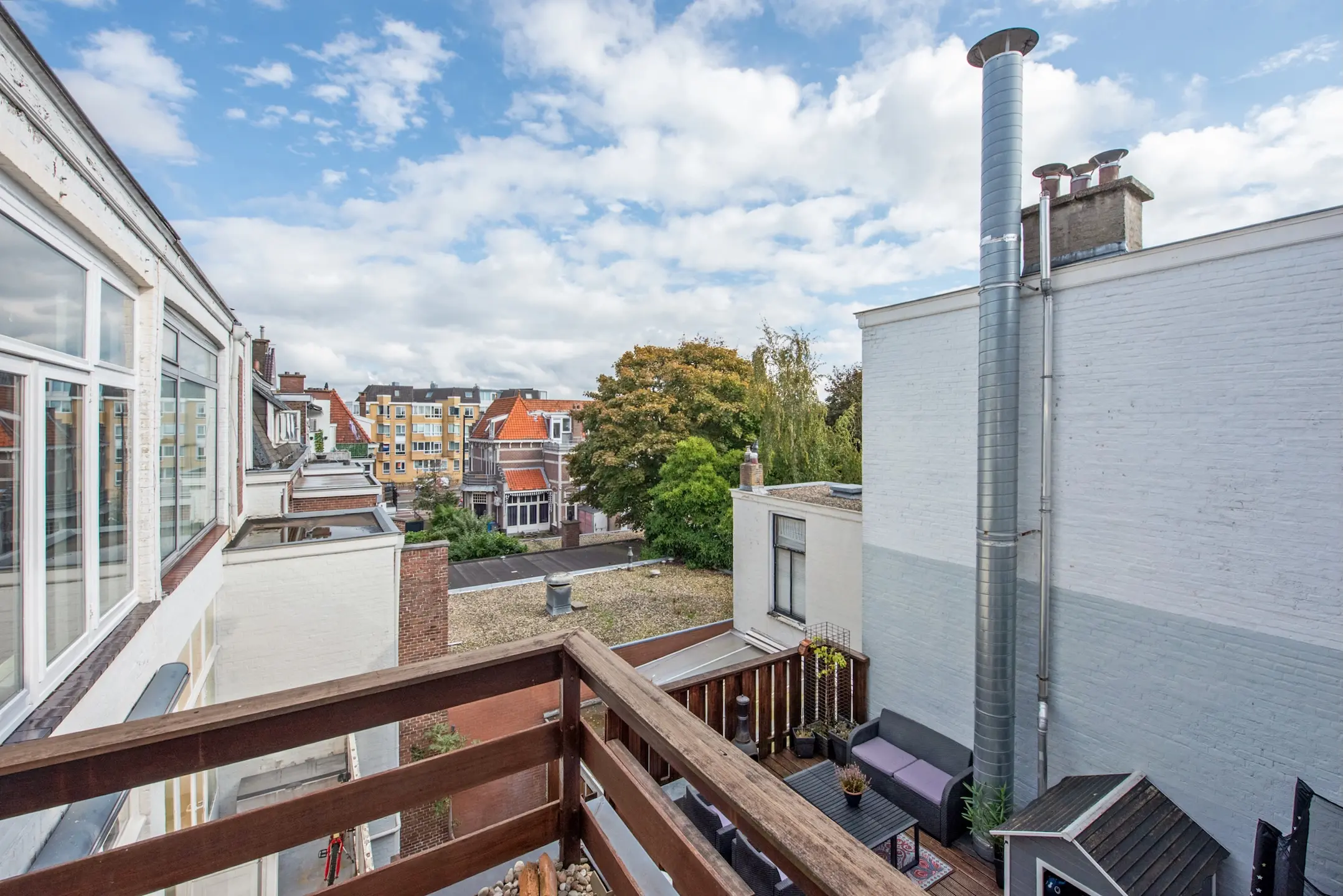 Eerste verdieping: overloop met een royale toiletruimte voorzien van een wandcloset, de voorzijkamer is bij uitstek te gebruiken als thuiskantoor, schitterende kamer en suite met een in visgraatmotief gelegde parketvloer, marmeren schouwen, schuifseparatie met vaste kasten en dubbele deuren naar het ruime balkon aan de voorzijde alsmede dubbele deuren naar het balkon aan de achterzijde. Vanaf dit balkon toegang tot het grote en beschut gelegen dakterras (kadastraal niet meegesplitst).