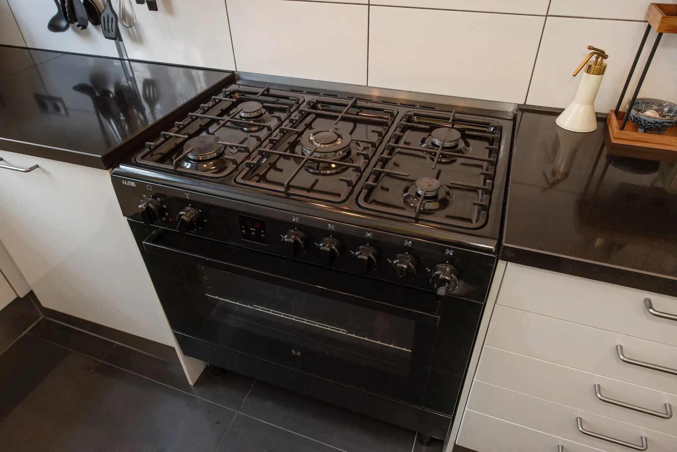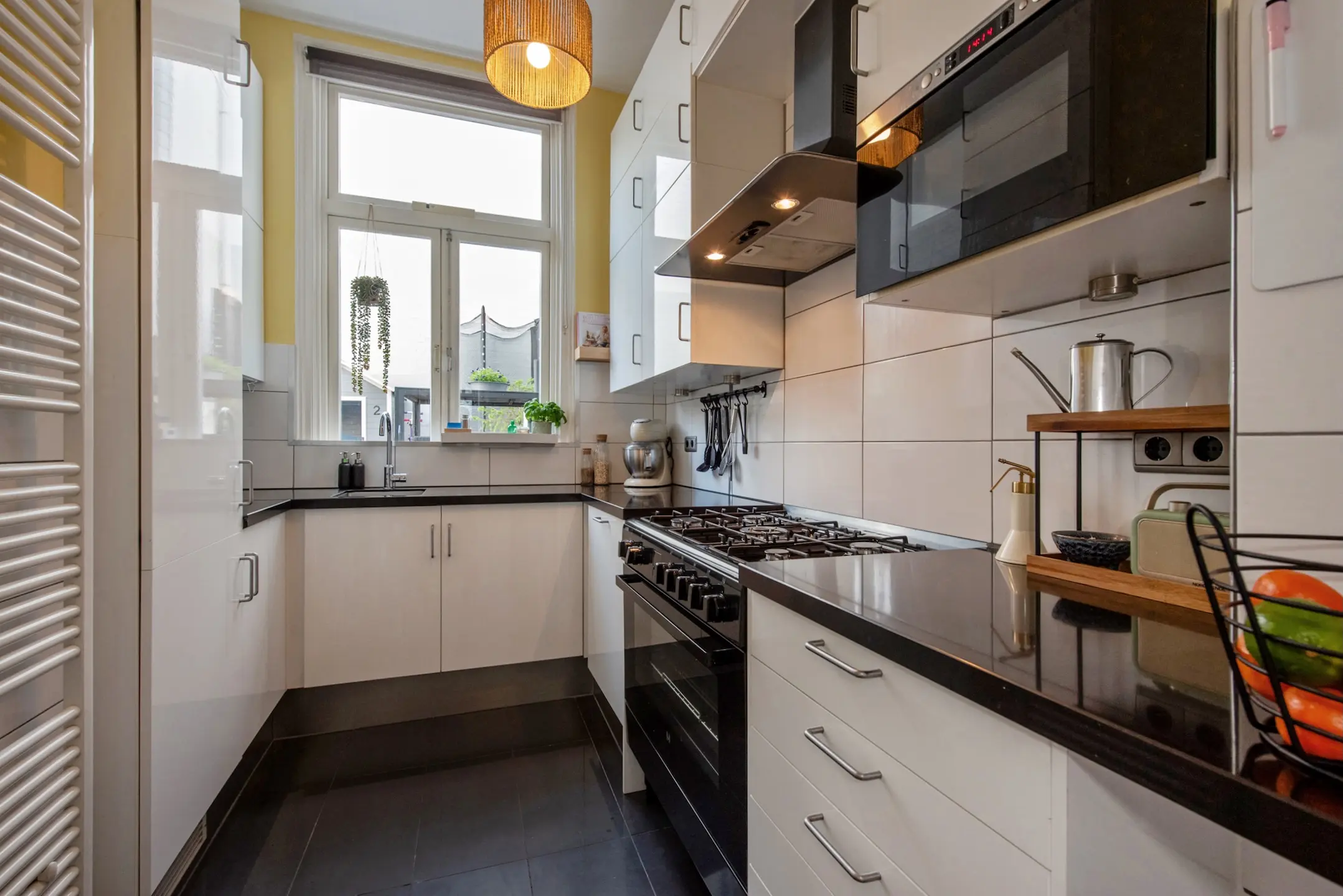 Afgesloten keuken in een eigentijdse uitvoering met witte keukenkasten en een zwart composiet werkblad. U-vormige keukenopstelling met een geïntegreerde koel-/vriescombinatie, fornuis met 5 branders, een hete lucht oven, afzonderlijke magnetron, vaatwasser en een afzuigkap. Verder in de keuken een praktische handdoekenradiator.