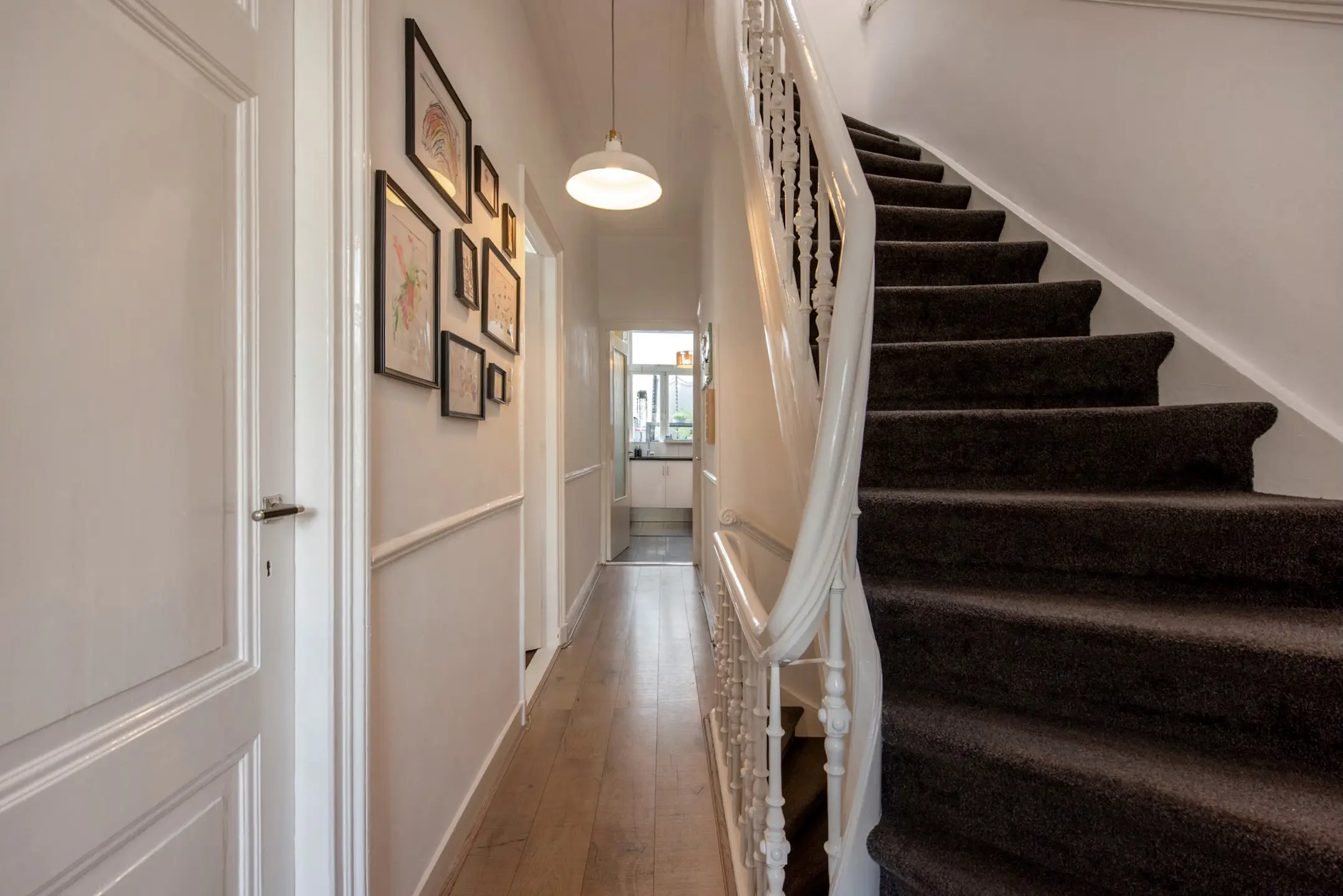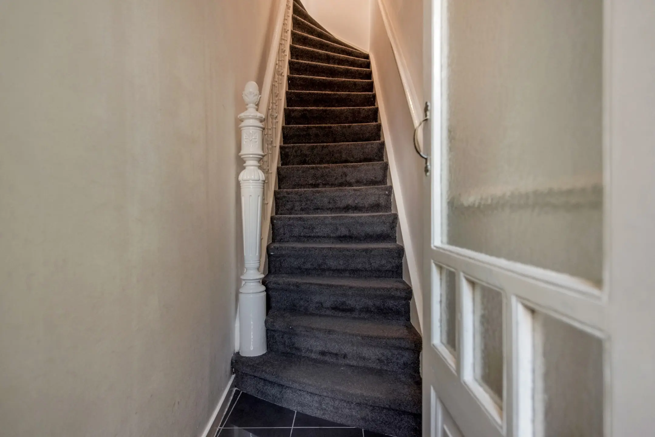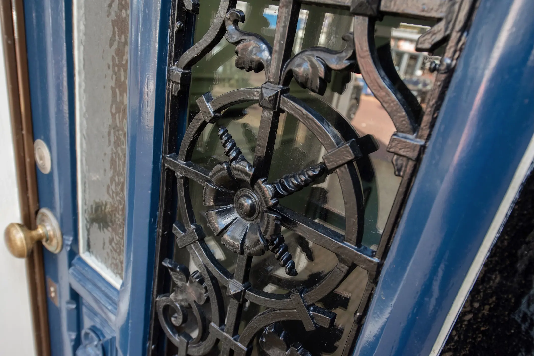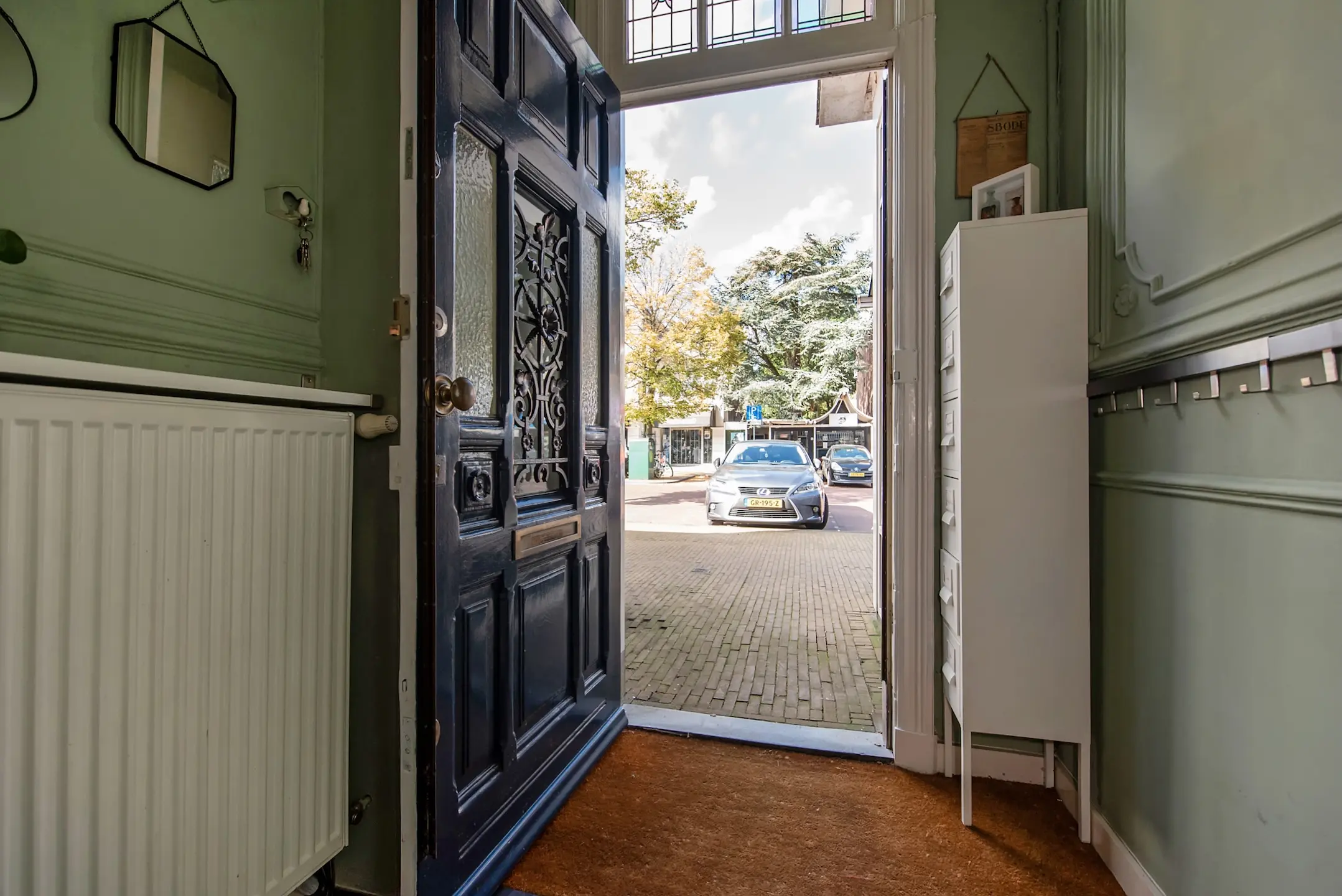 Begane grond: toegang tot de woning middels fraaie voordeur met smeedijzeren traliewerk en raampje, verrassend ruime hal met originele wand- en plafondlijsten, voldoende ruimte om fietsen te plaatsen, trapopgang naar de eerste verdieping.