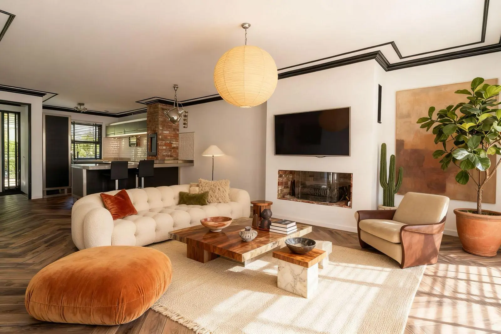 Woon-/eetkamer met tegelvloer voorzien van vloerverwarming in walvisgraatmotief, diepe bergkast, open haard (gas én hout) en openslaande deuren naar de achtertuin.