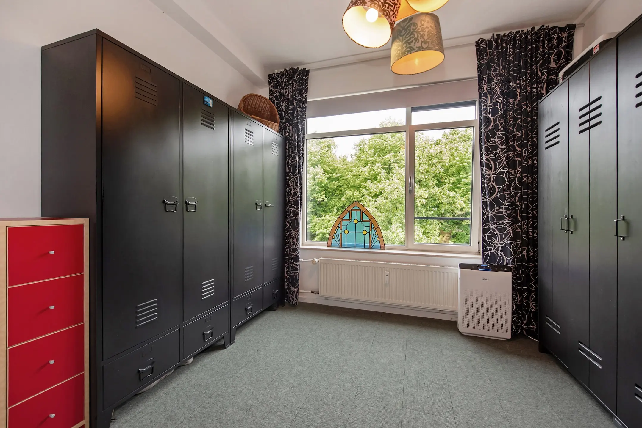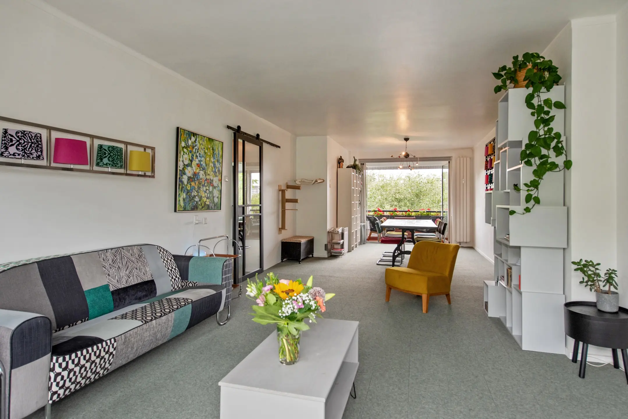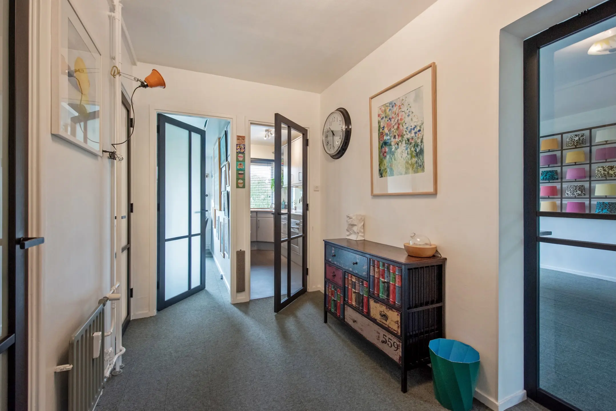 In de woning vernieuwde binnendeuren met een Industriële look en glazen/melkglazen panelen.