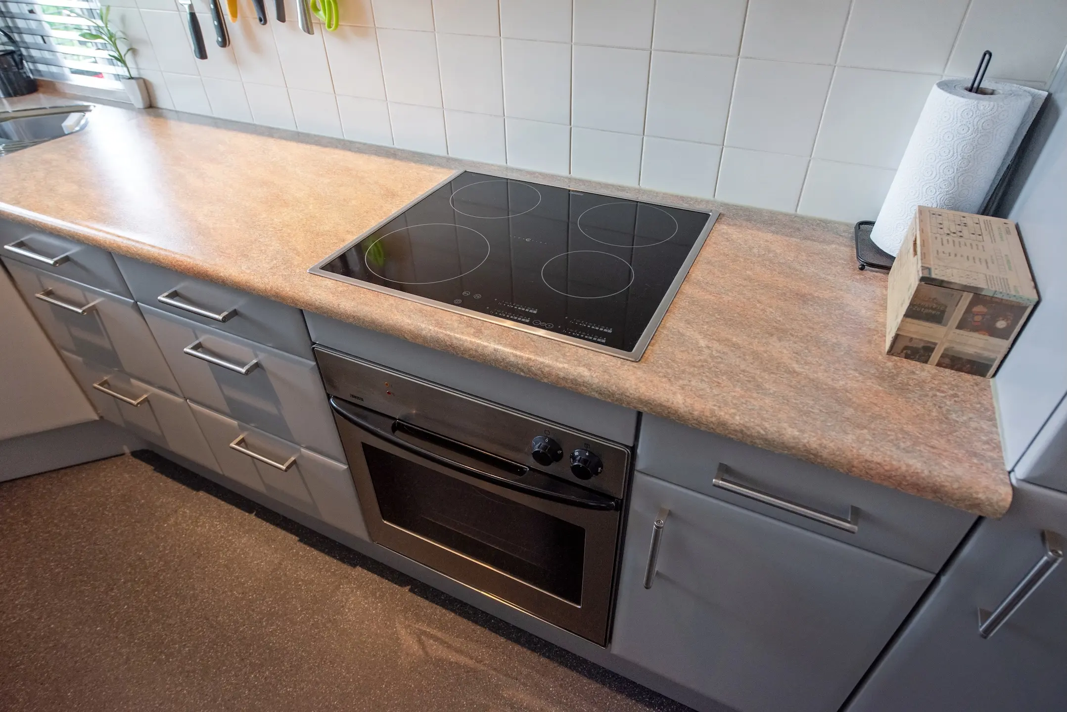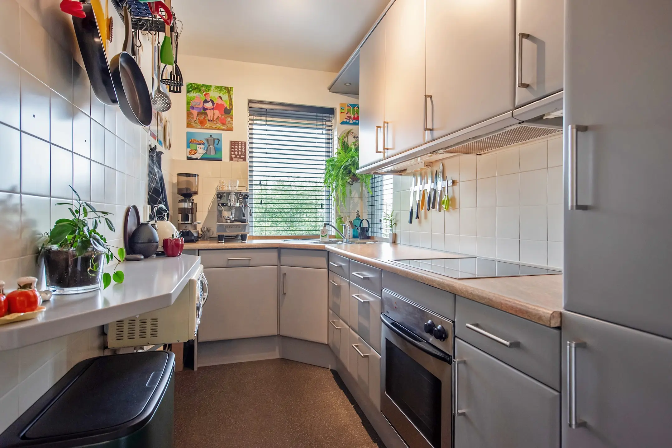 De keukenkastjes zijn in 2021 nieuw gespoten en heeft door de opstelling in een L-vorm veel kast en werkruimte. Door het keukenraam veel licht. Geïntegreerde vaatwasser, inductiekookplaat met vlakscherm afzuigkap, oven en koel-/vriescombinatie.