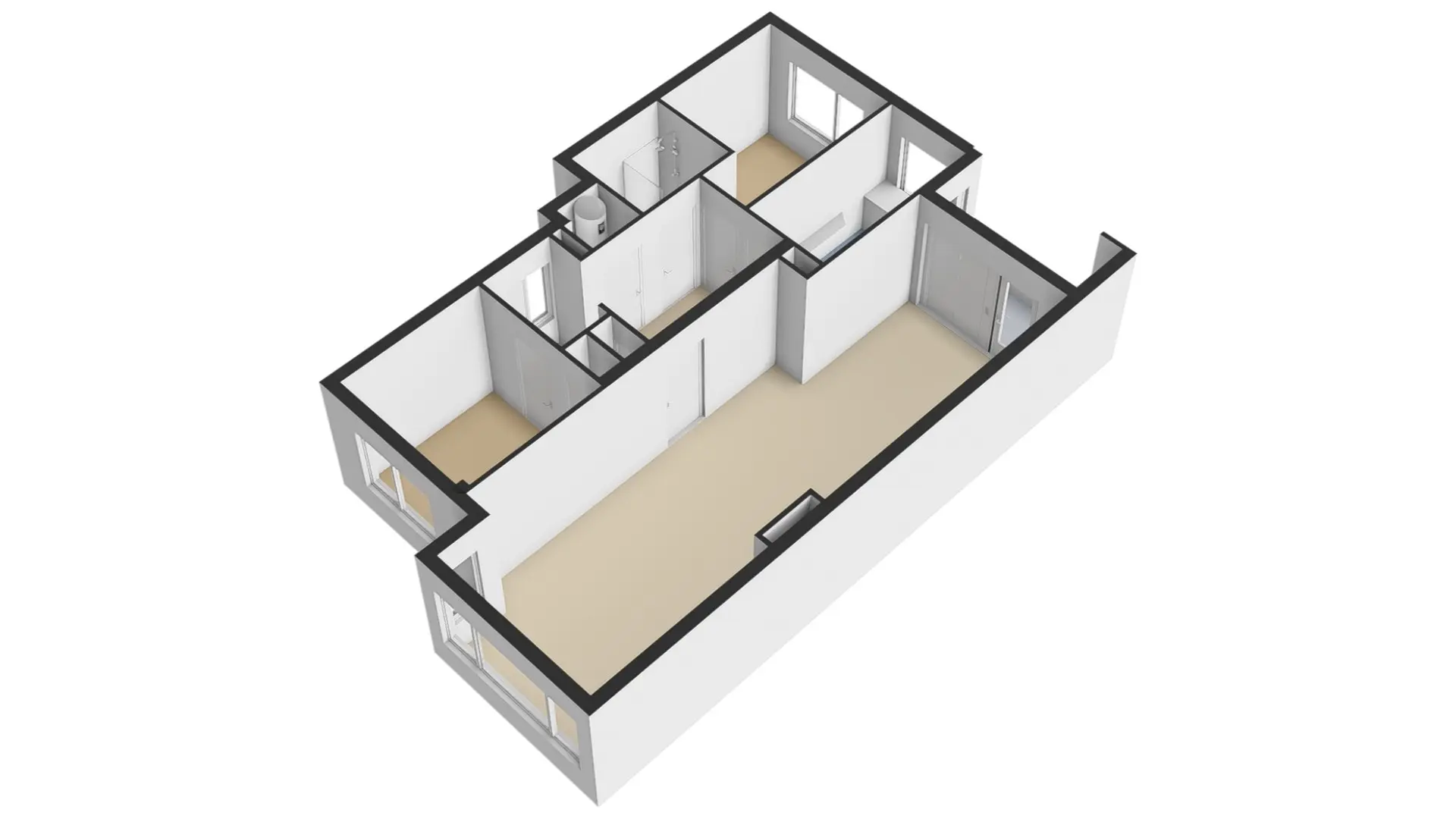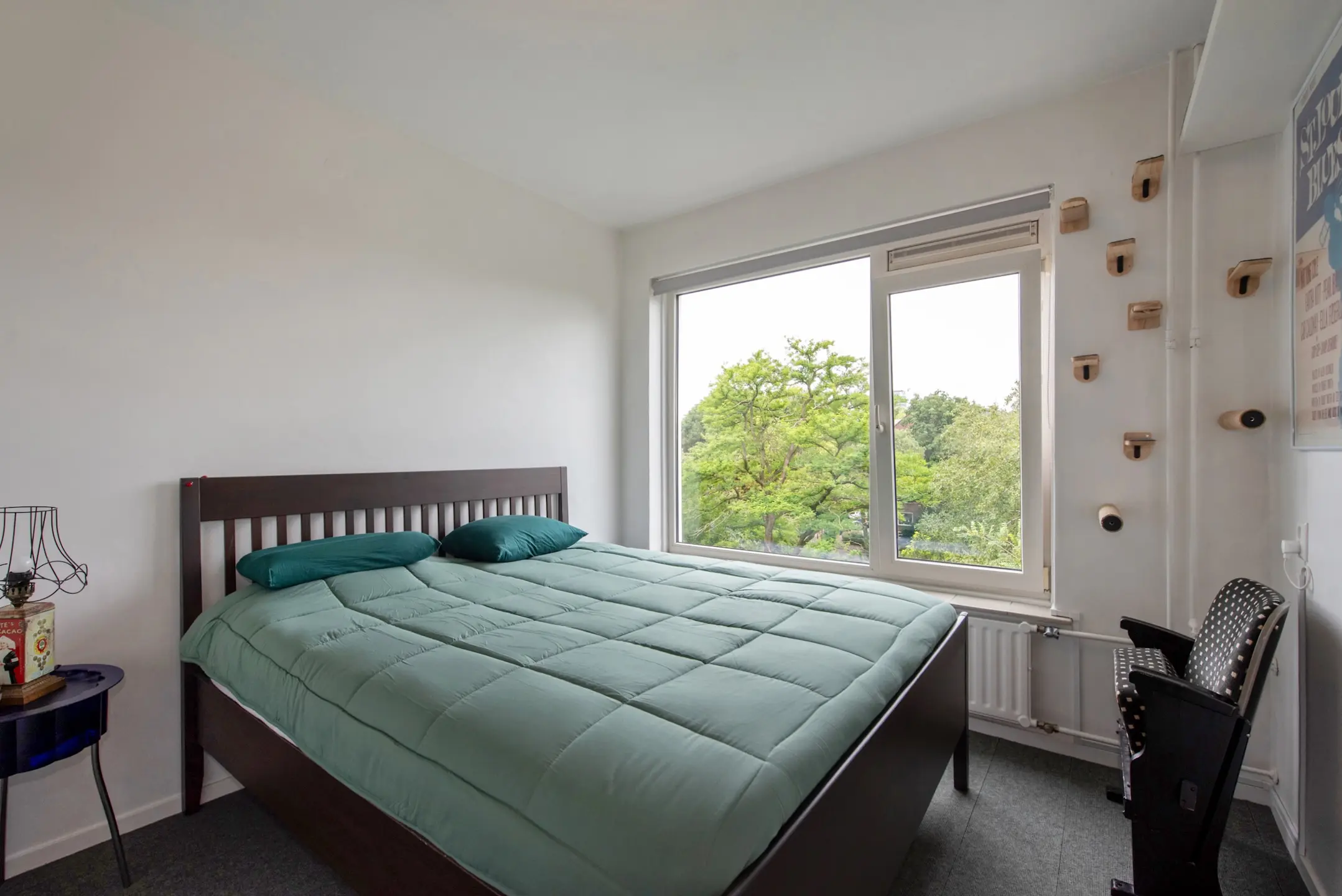 Aan de voorzijde bevind zich een slaap- of werkkamer met vaste kast. De hoofdslaapkamer bevindt zich aan de rustige achterzijde.