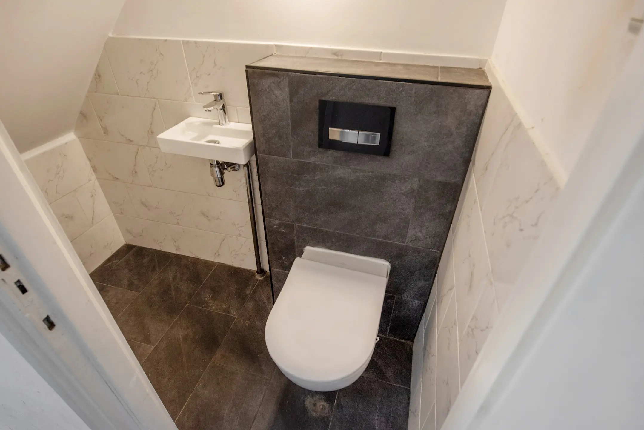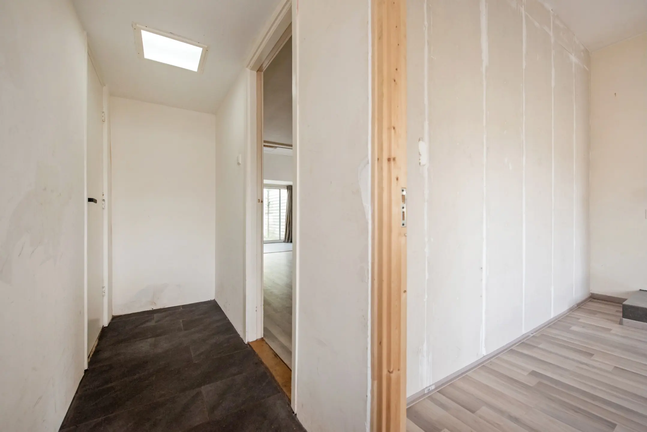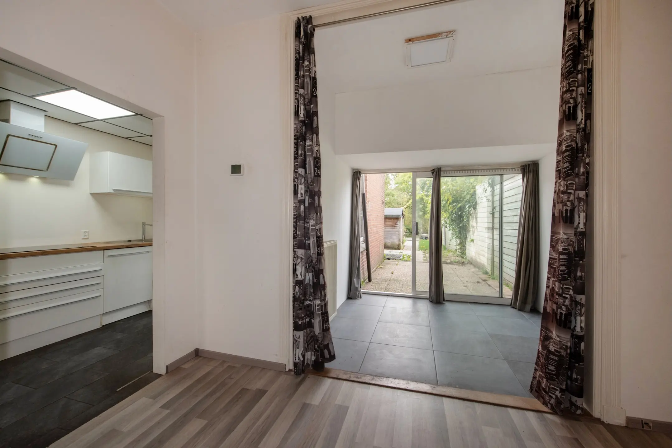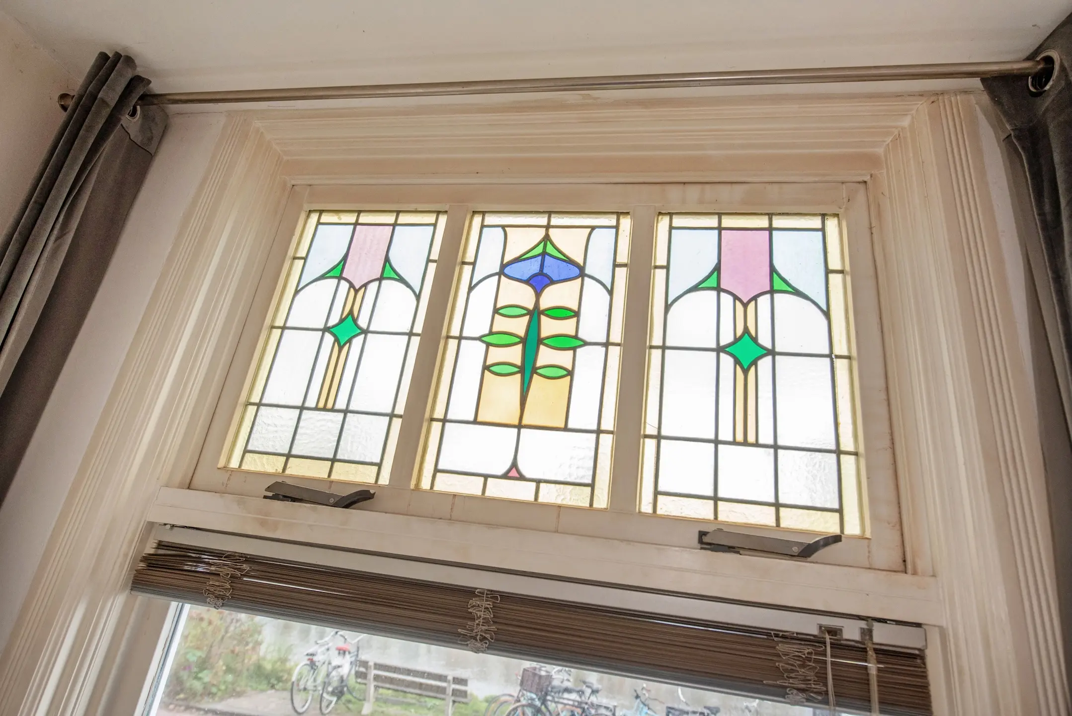 Bij aankomst valt direct het glas-in-lood in de kozijnen op. De hal is deels betegeld en heeft hoge plafonds, wat de woning een ruimtelijk gevoel geeft. Hier bevindt zich ook het separate toilet met fontein.