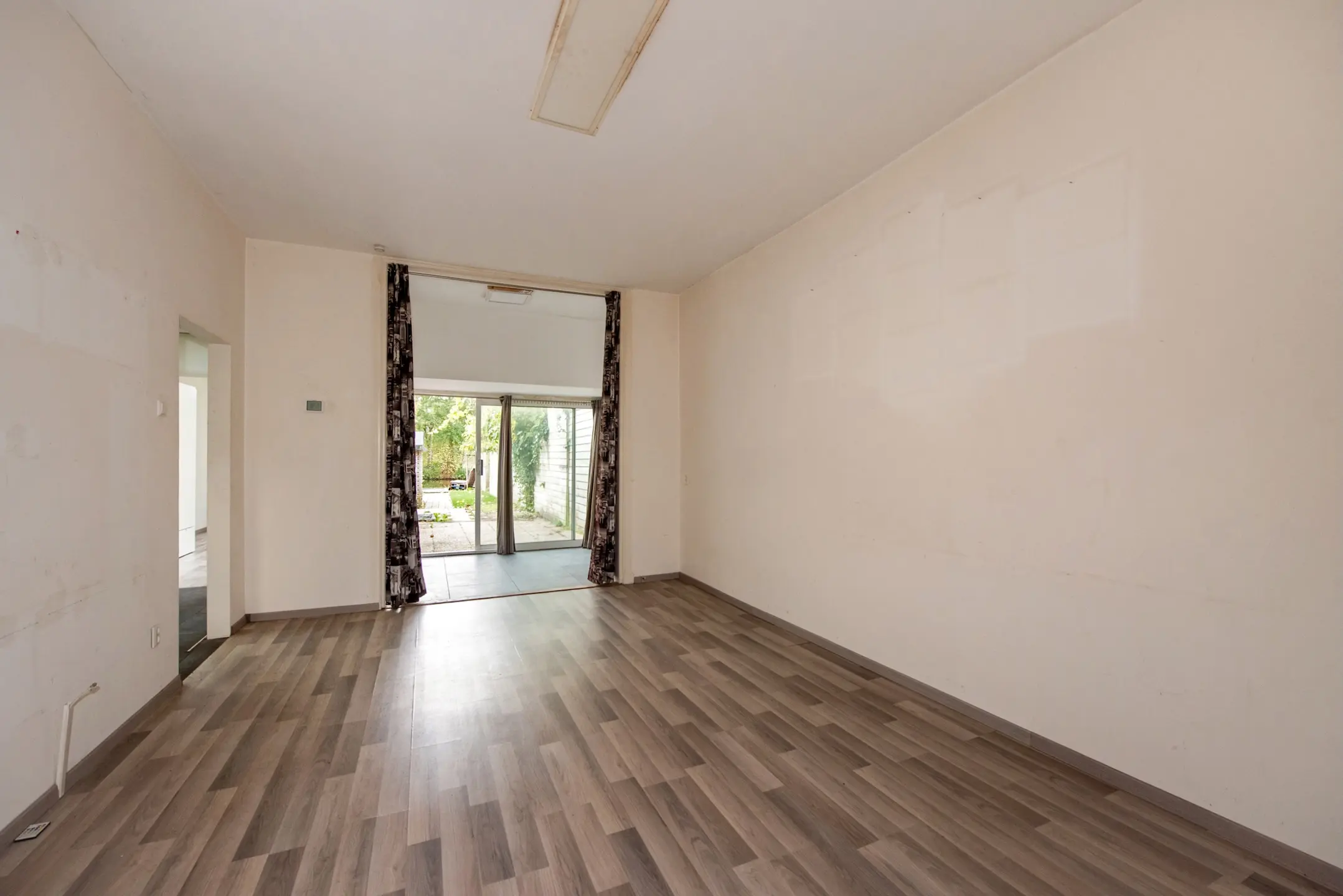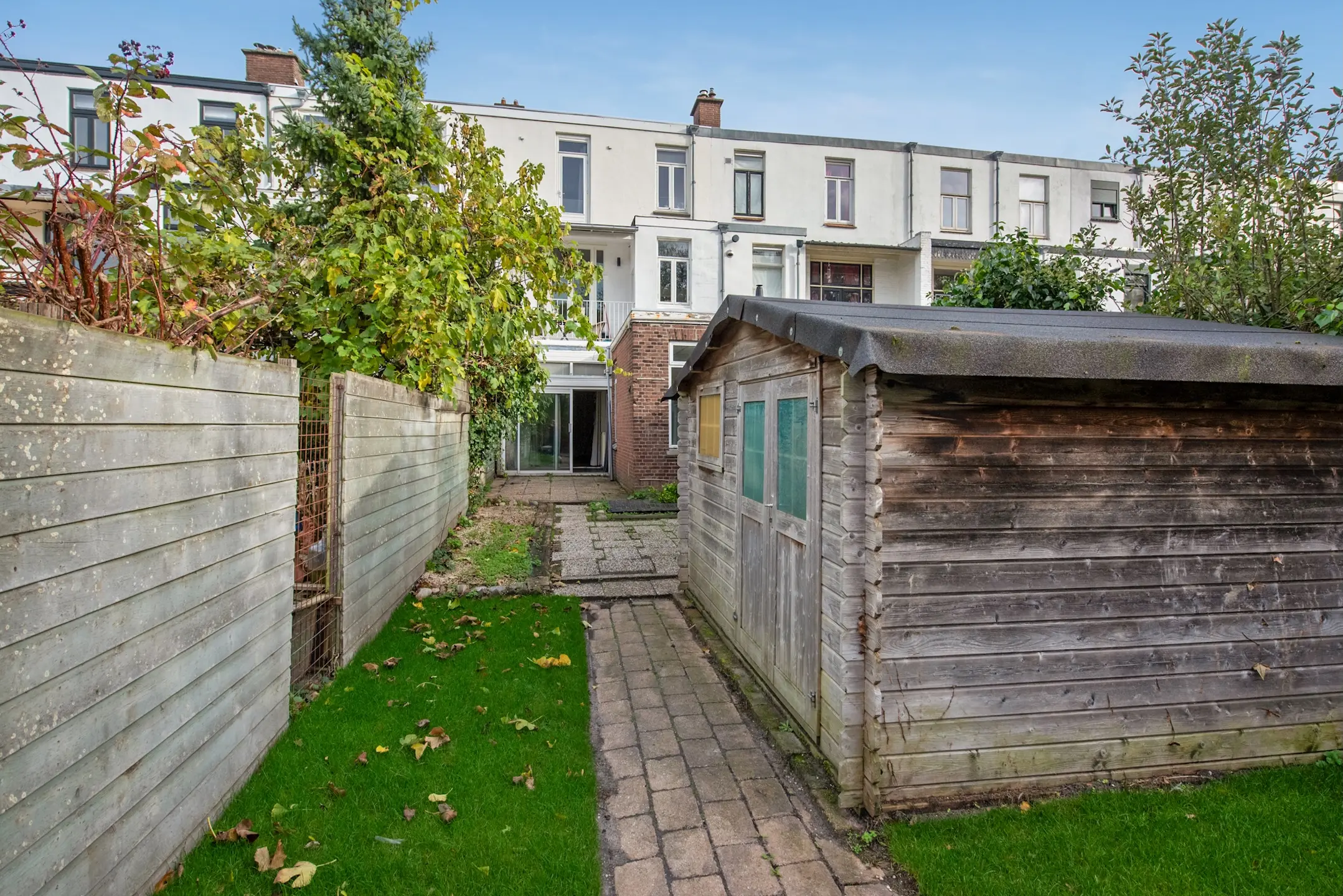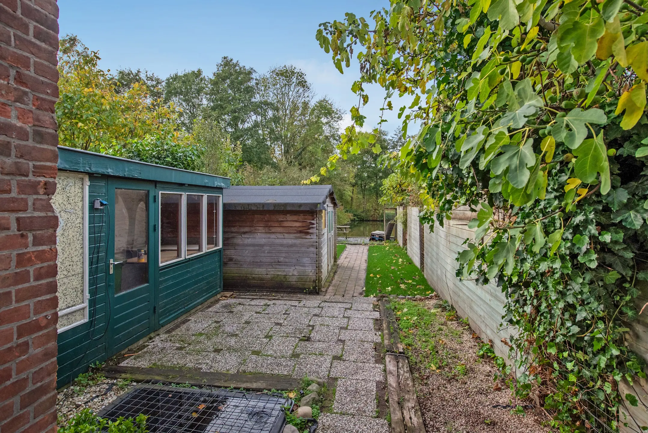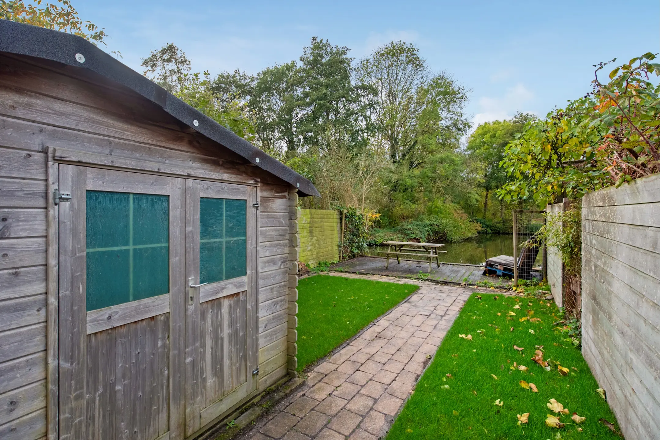 Via de woonkamer bereikt u de uitbouw met openslaande deuren naar de diepe achtertuin. De tuin is verzorgd en biedt veel privacy, met een vrijstaande houten schuur en een aangebouwde houten schuur met aansluiting voor wasmachine, cv-ketel (Remeha Avanta, 2019) en elektra.