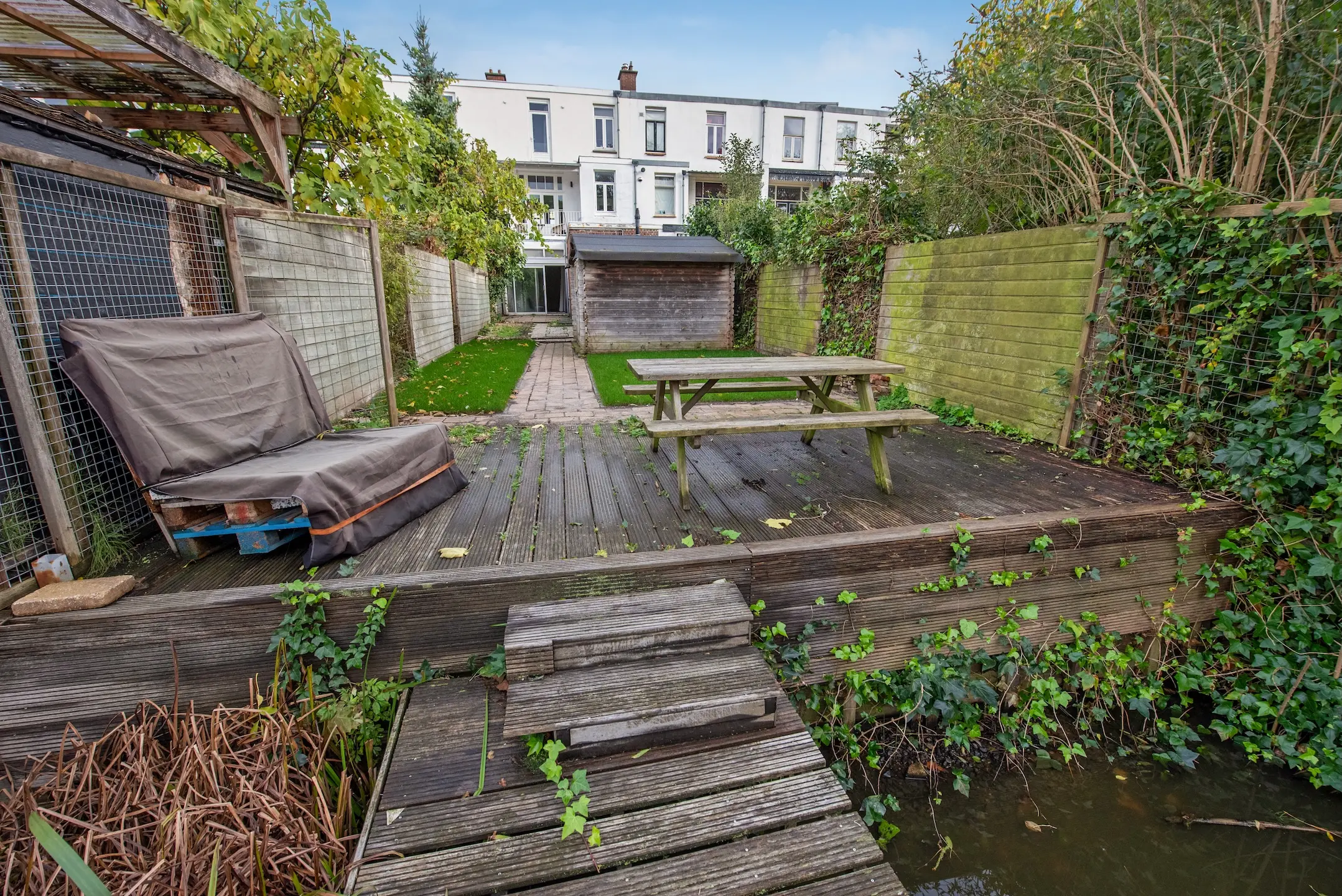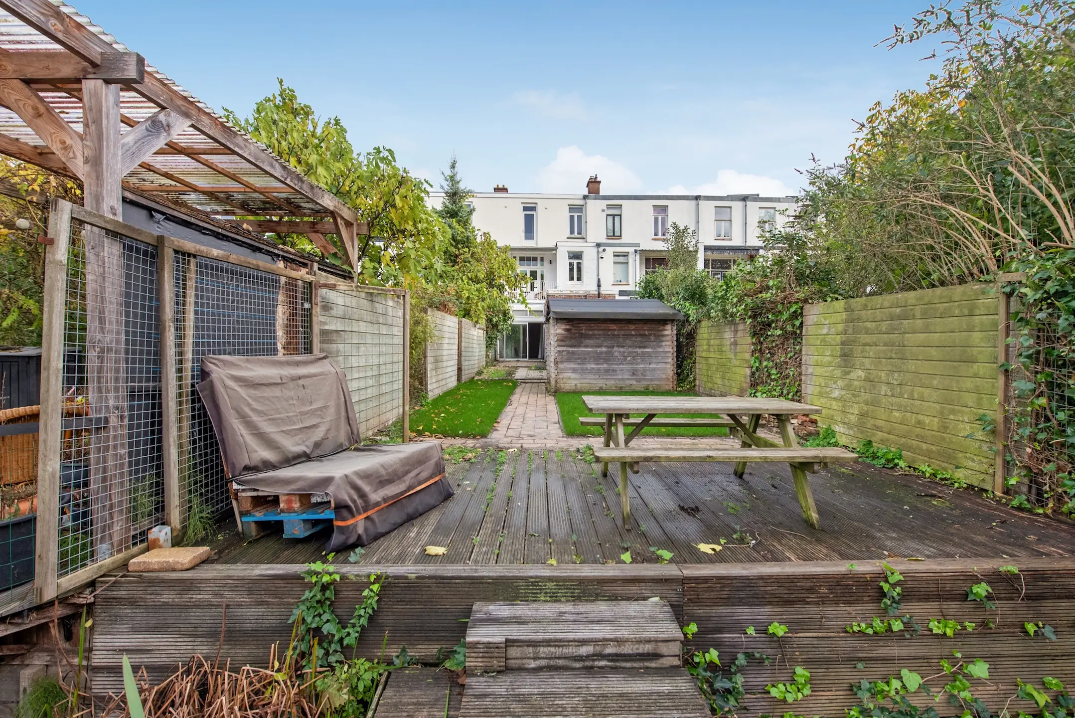 Achterin de tuin bevindt zich een houten vlonder — een heerlijke plek om te ontspannen of te borrelen in de zon, met uitzicht op het groen achter de woning.