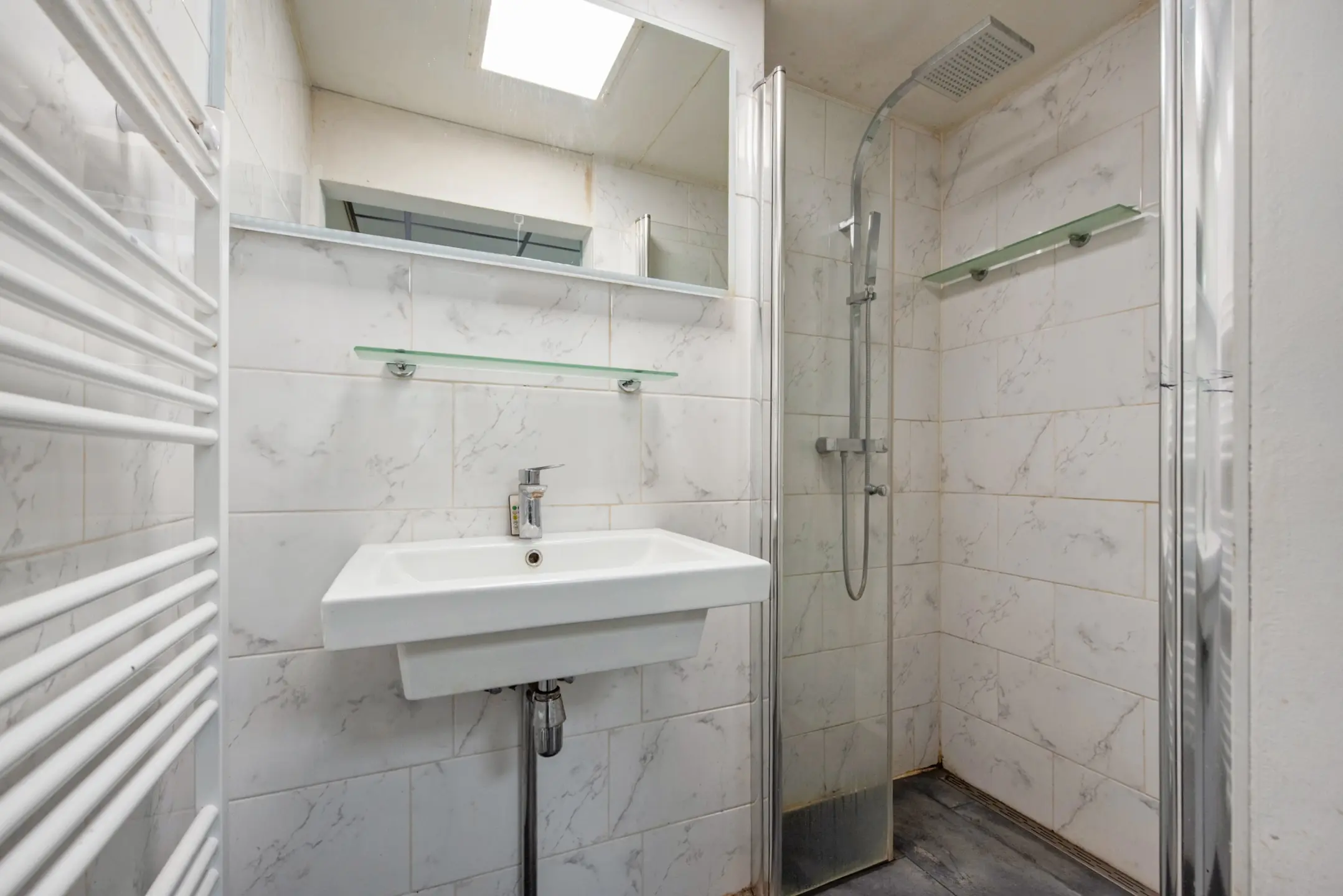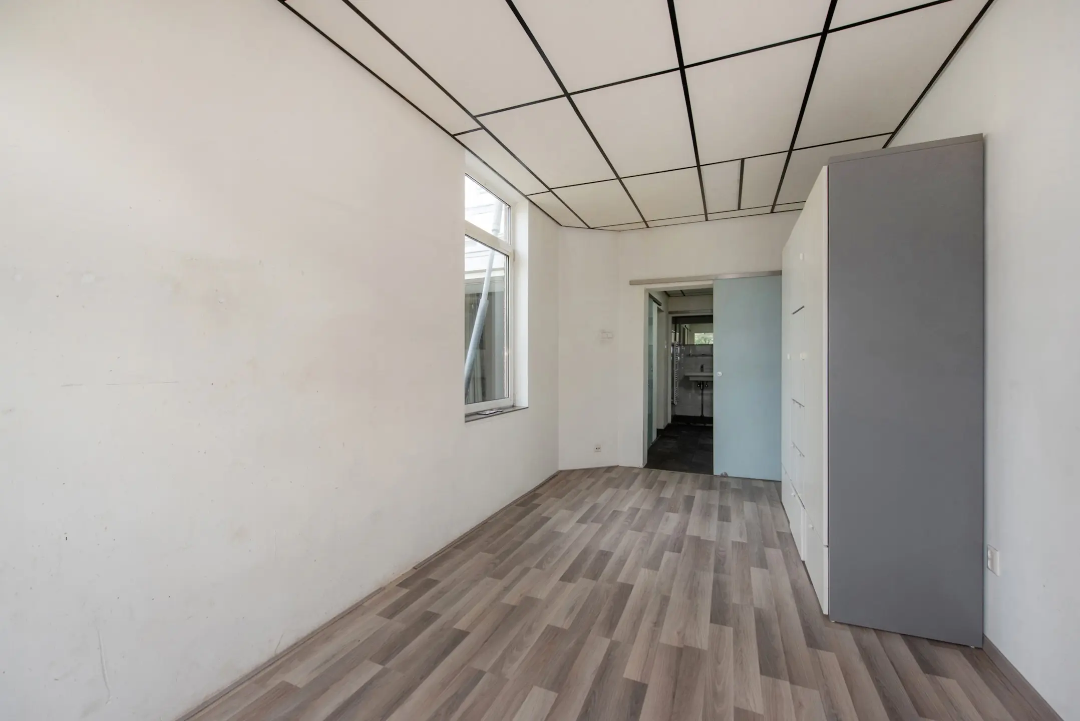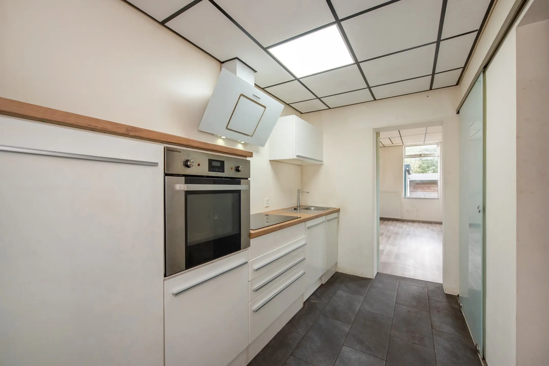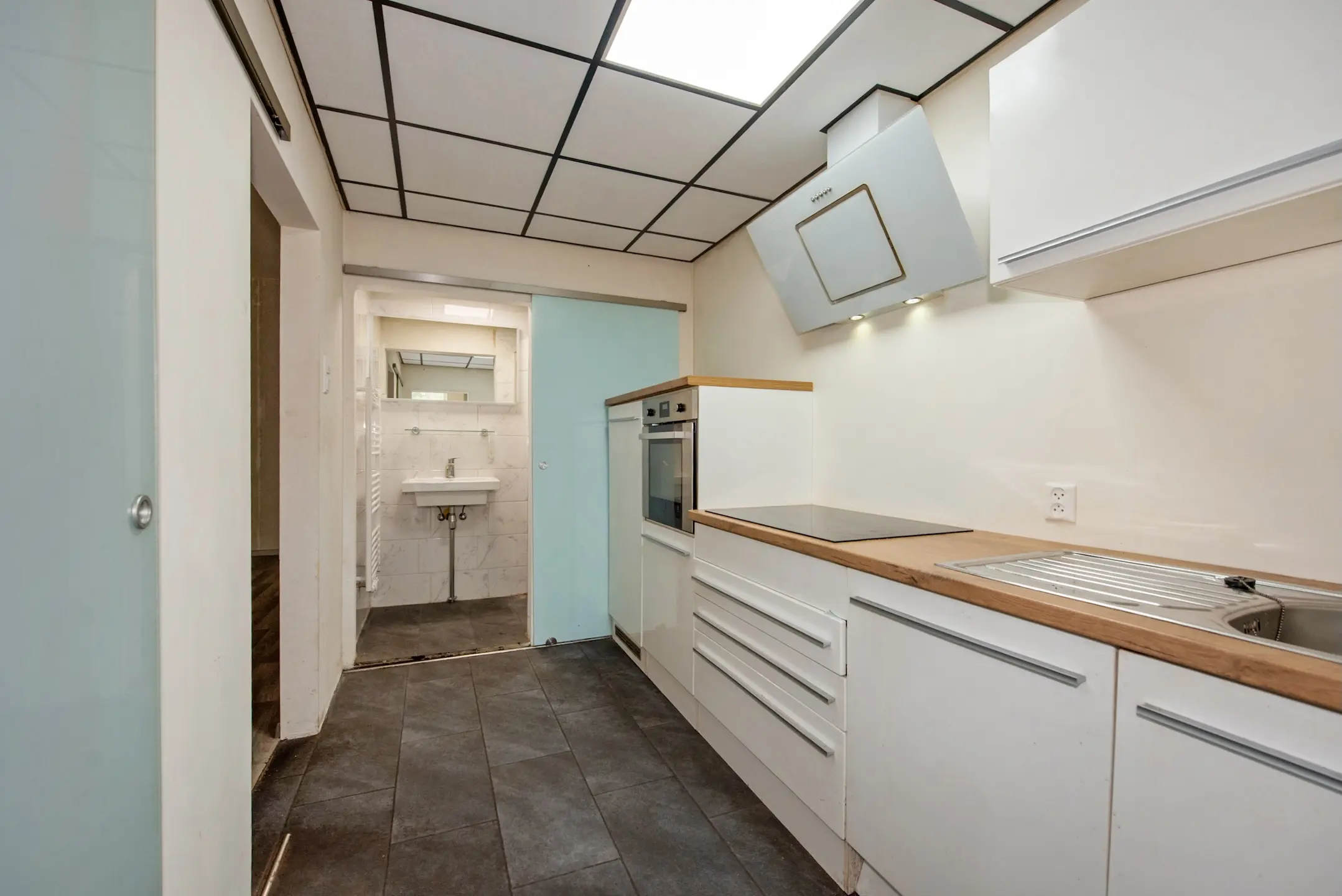 De woonkamer is ruim en licht, met voldoende ruimte voor zowel een zit- als eetgedeelte. De aangrenzende keuken is netjes uitgevoerd en voorzien van inductiekookplaat, oven, vaatwasser, kraan en inbouwkoelkast. Vanuit de keuken is via een schuifdeur toegang tot een praktische berging. Aan de andere zijde bevindt zich de badkamer, voorzien van wastafel, radiator en inloopdouche met regendouchekop.
