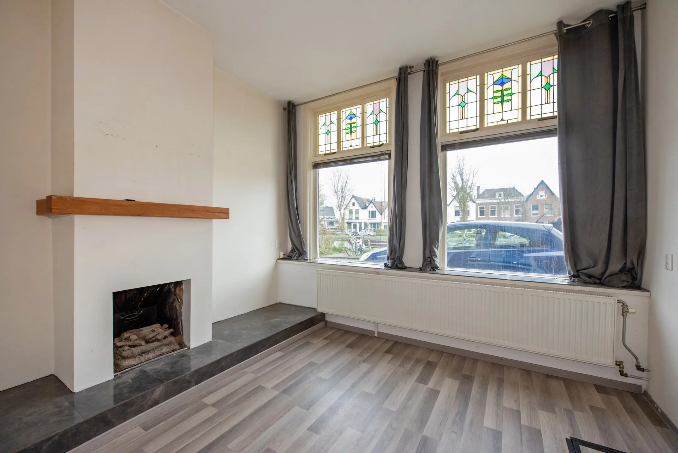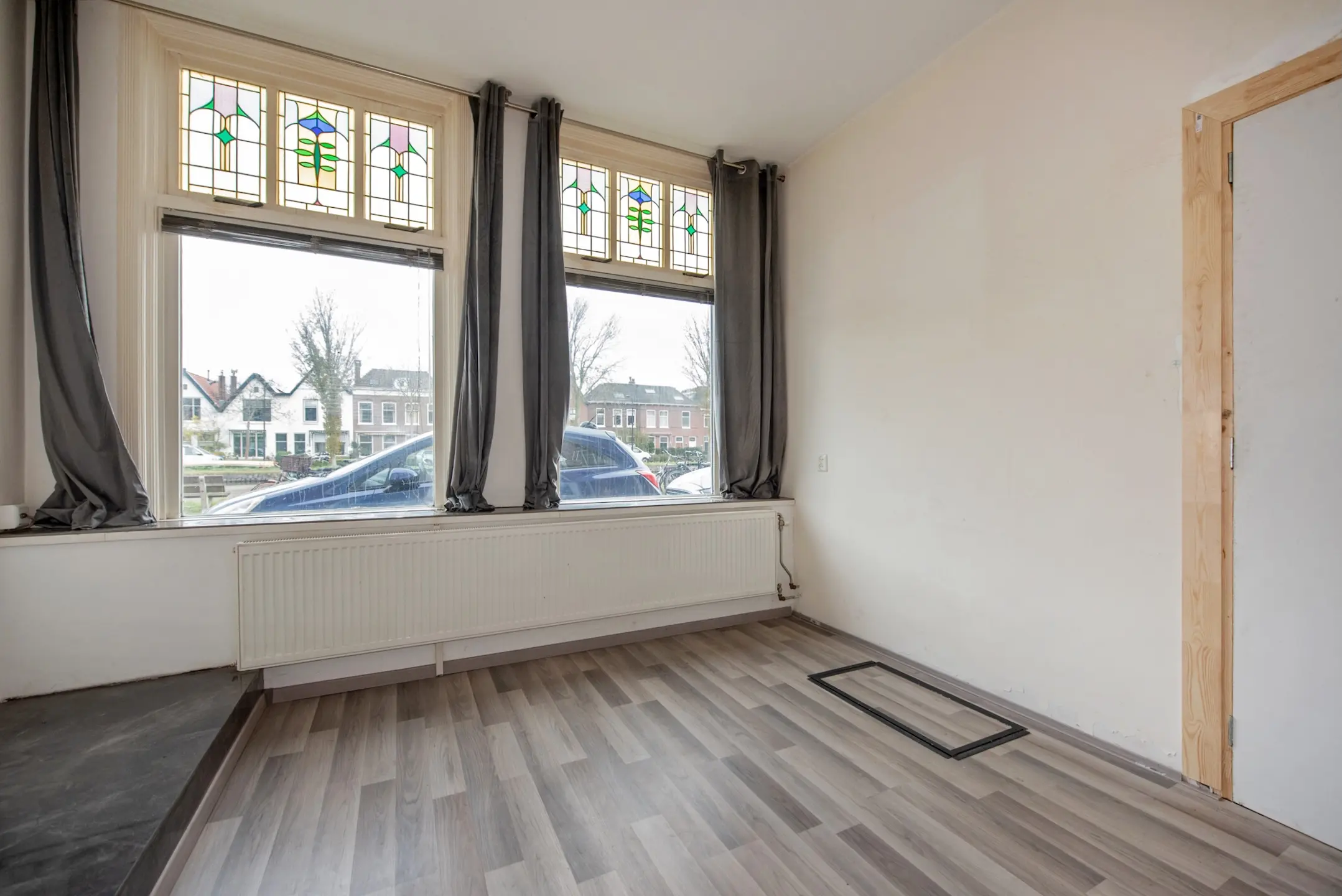 Aan de voorzijde ligt een lichte slaapkamer met uitzicht over het water van de Vliet. De kamer heeft een sfeervolle uitstraling met een haard en grote raampartijen die zorgen voor veel daglicht. Ook hier is het glas-in-lood terug te vinden.