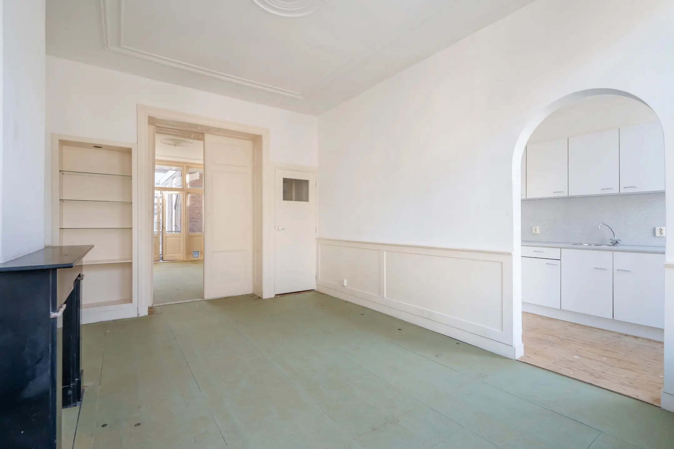 Toegang op straatniveau. Gezamenlijke opgang met meterkast (3 groepen + aardlekschakelaar) en trap naar de 1e verdieping. Entree appartement, hal toilet met fontein. Royale woon-/eetkamer met gaskachel schuifseparatie met schouw en vaste kast. Achterslaapkamer met schouw en openslaande deuren naar achterbalkon. Eenvoudige keuken met onder- en bovenkasten zonder inbouwapparatuur. Achtergelegen badkamer met douche, wastafel en kamer 2/werkkamer/kastruimte.