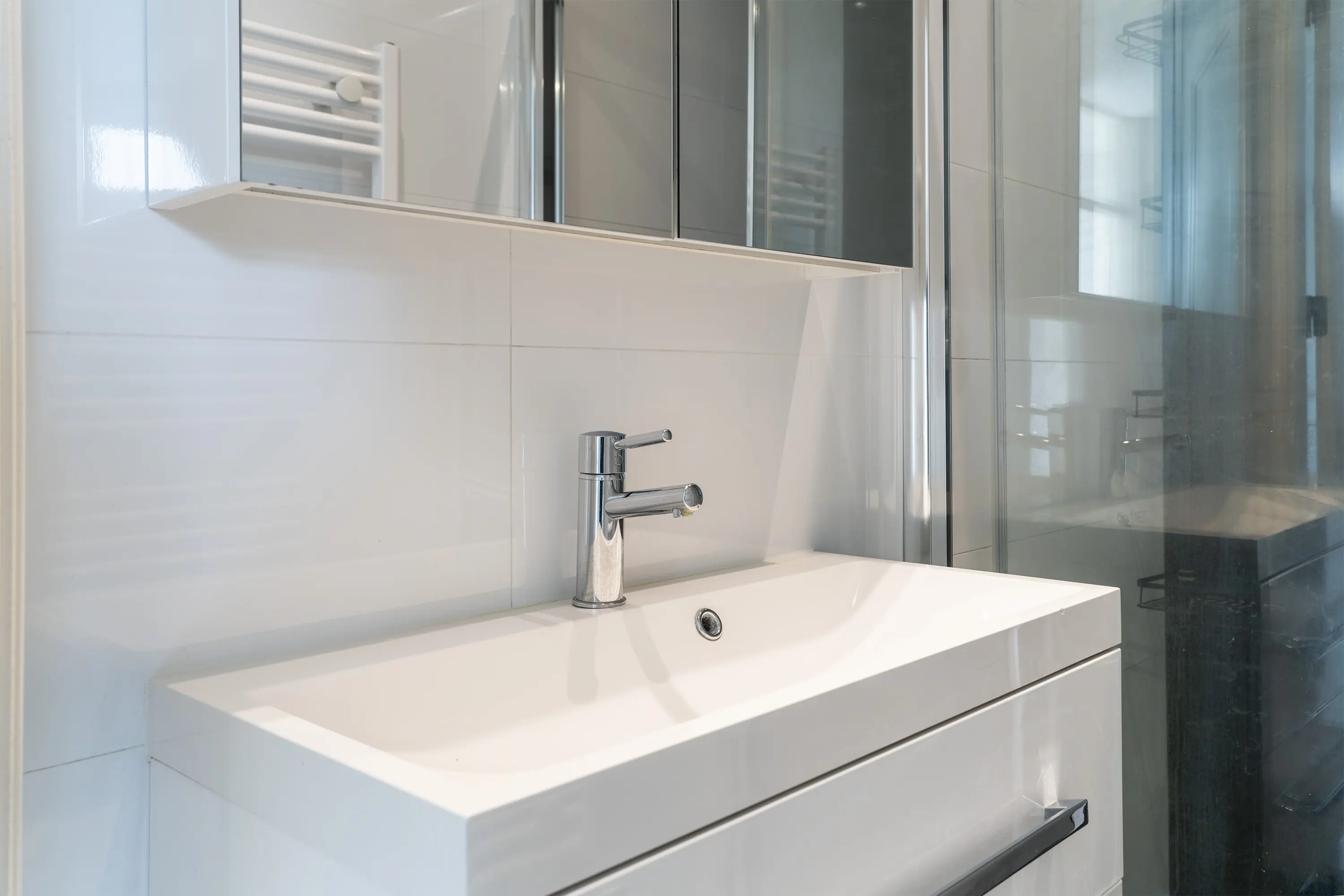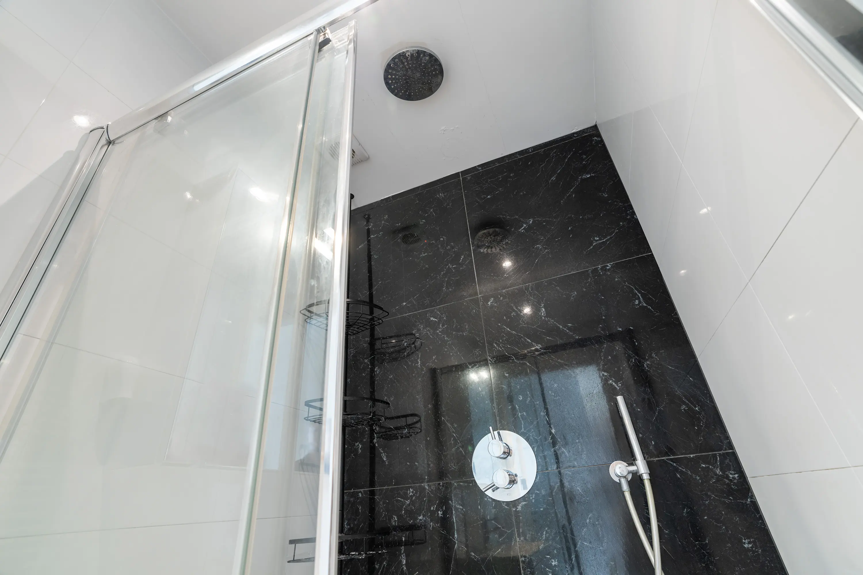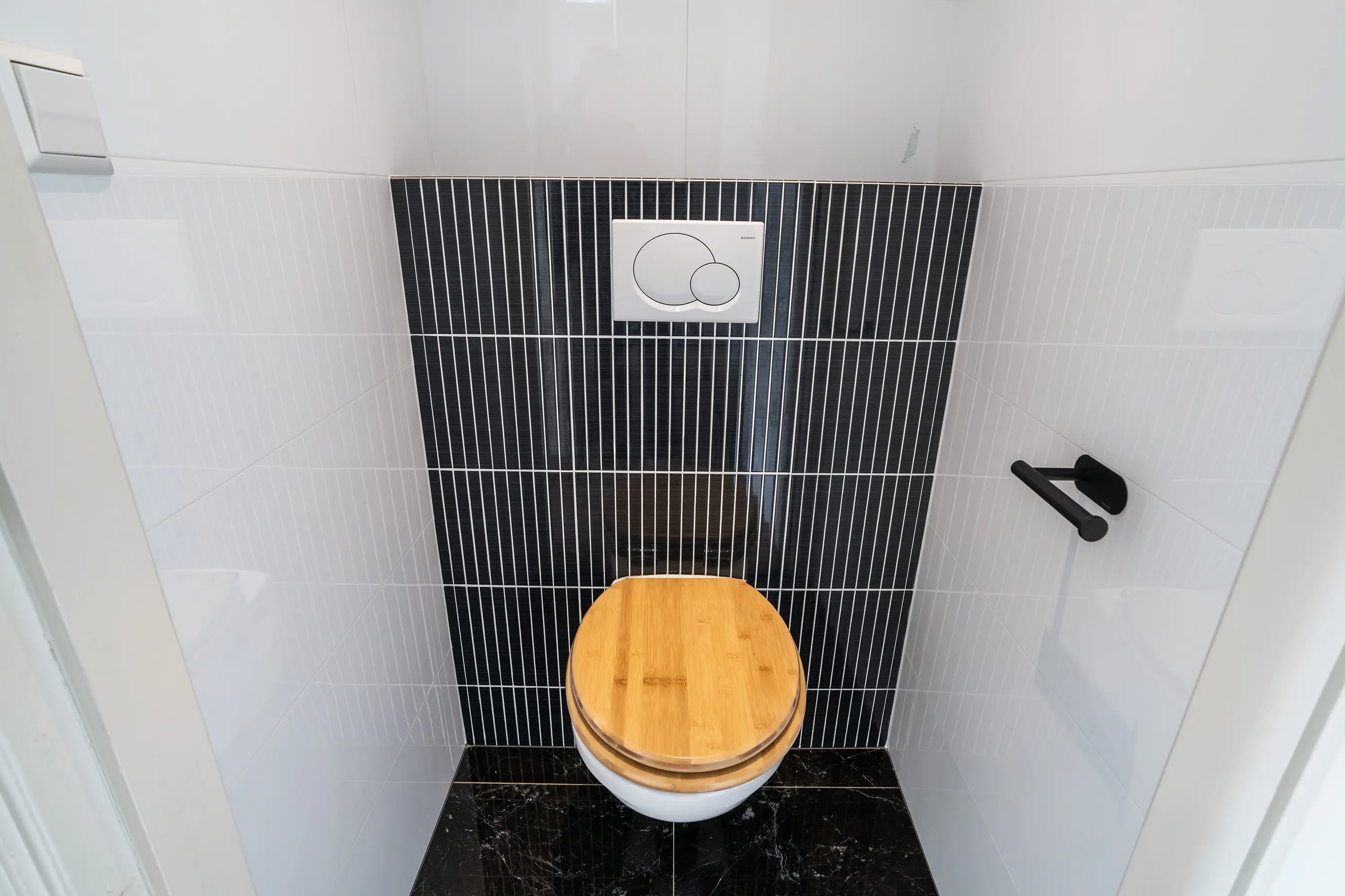 De badkamer is modern uitgevoerd en voorzien van stijlvolle witte en zwarte grootformaat wandtegels, een handdoekradiator, een wastafel met spiegelkast en een riante inloopdouche met regendouche en handdouche. De separate toiletruimte is voorzien van een modern wandcloset.