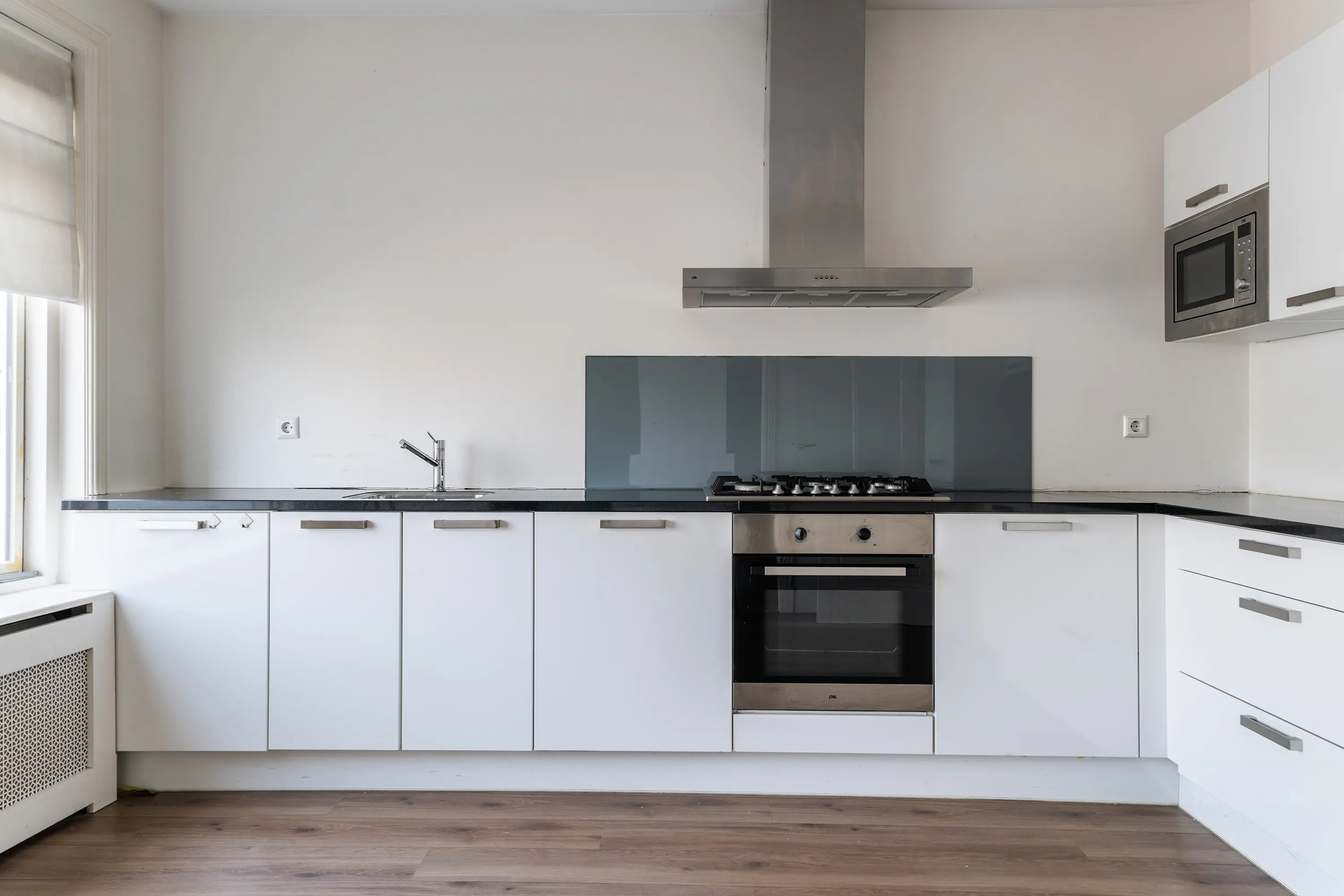 Zeer lichte, doorgebroken woon-/eetkamer met een luxe open keuken in L-vorm, voorzien van hoogglans gelakte kasten en alle moderne gemakken. De keuken beschikt over een natuurstenen aanrechtblad, een 5-pits gasfornuis met bijbehorende afzuigkap, koelkast, vriezer, vaatwasser, oven en magnetron.