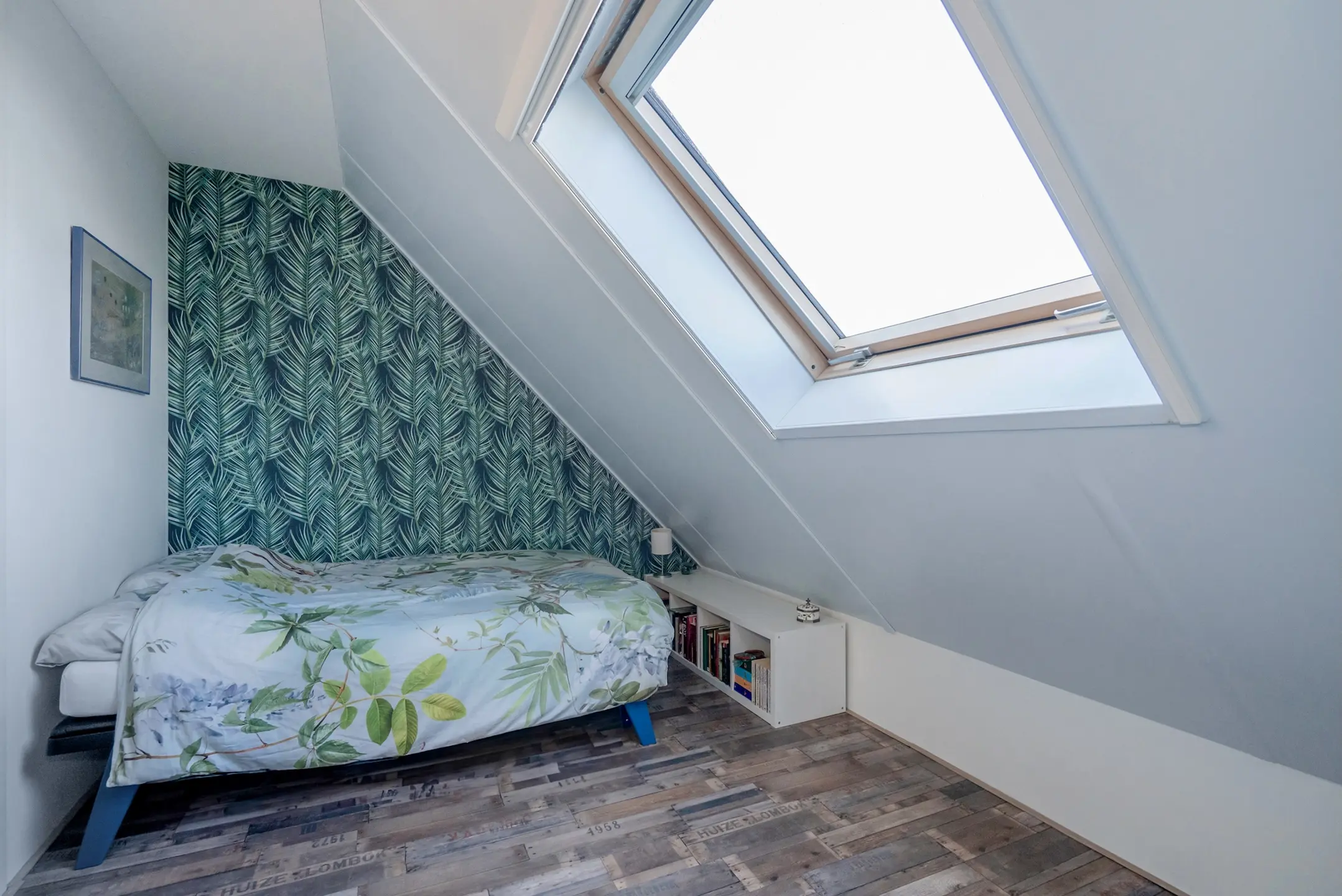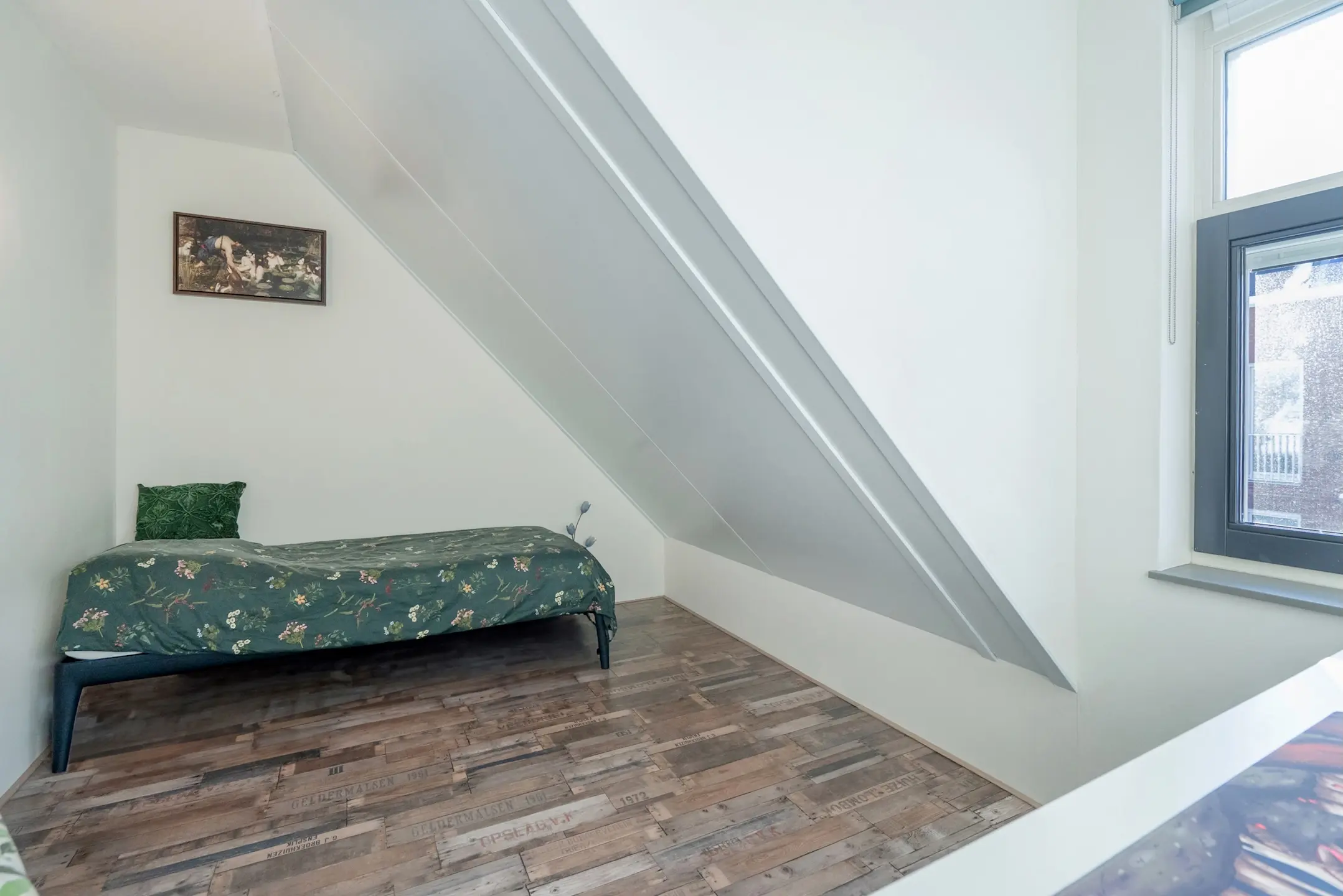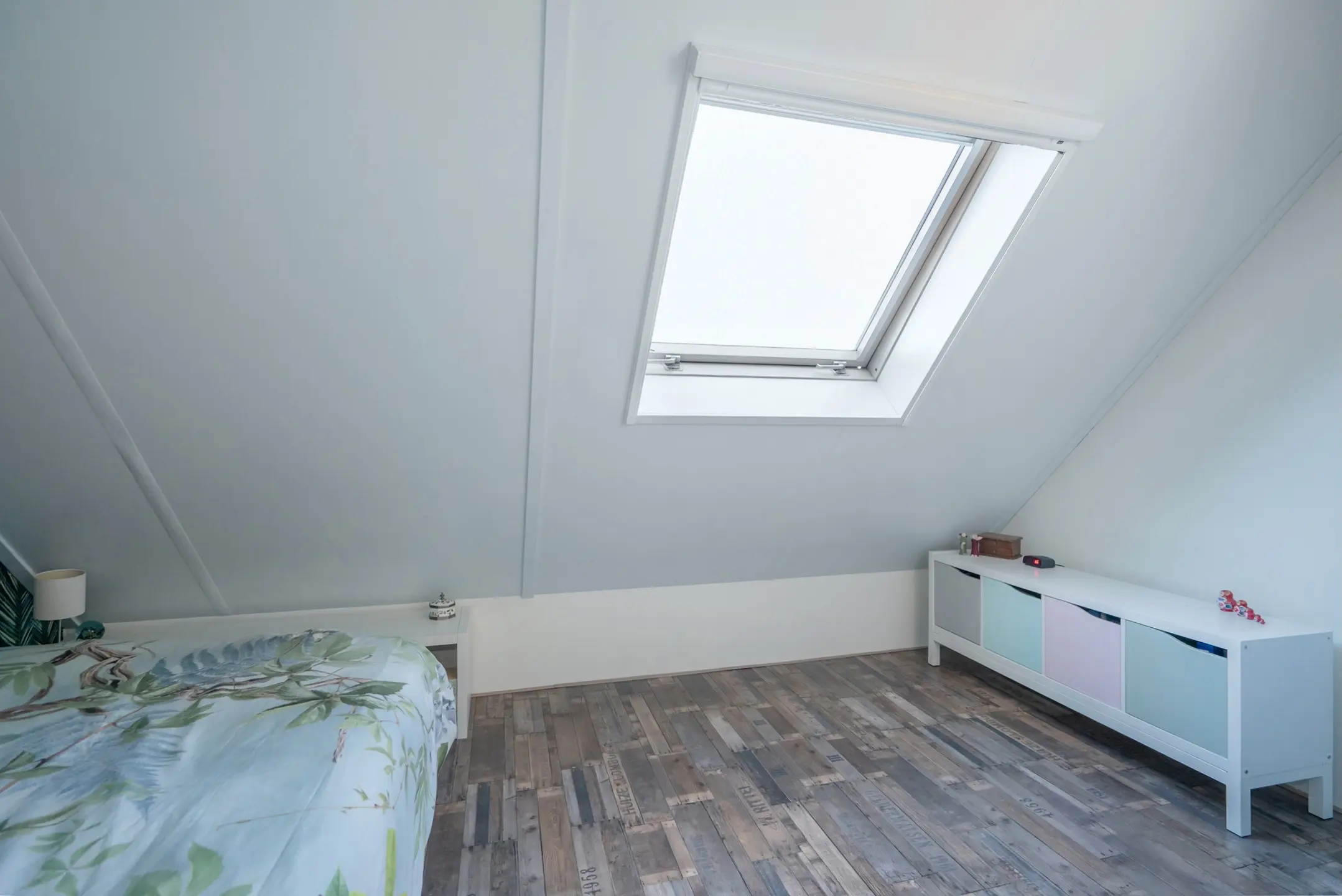 1e verdieping: overloop, voorgelegen slaapkamer met dakkapel, achtergelegen slaapkamer met groot Velux dakraam, keurige tussengelegen badkamer met inloopdouche, wastafel, en opstelplaats voor wasmachine en droger. De gehele verdieping is voorzien van een laminaat vloer en vloerverwarming.