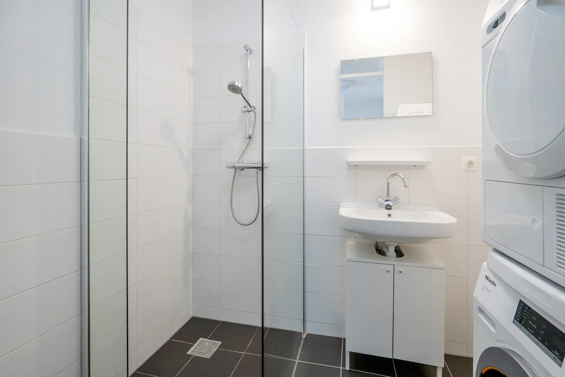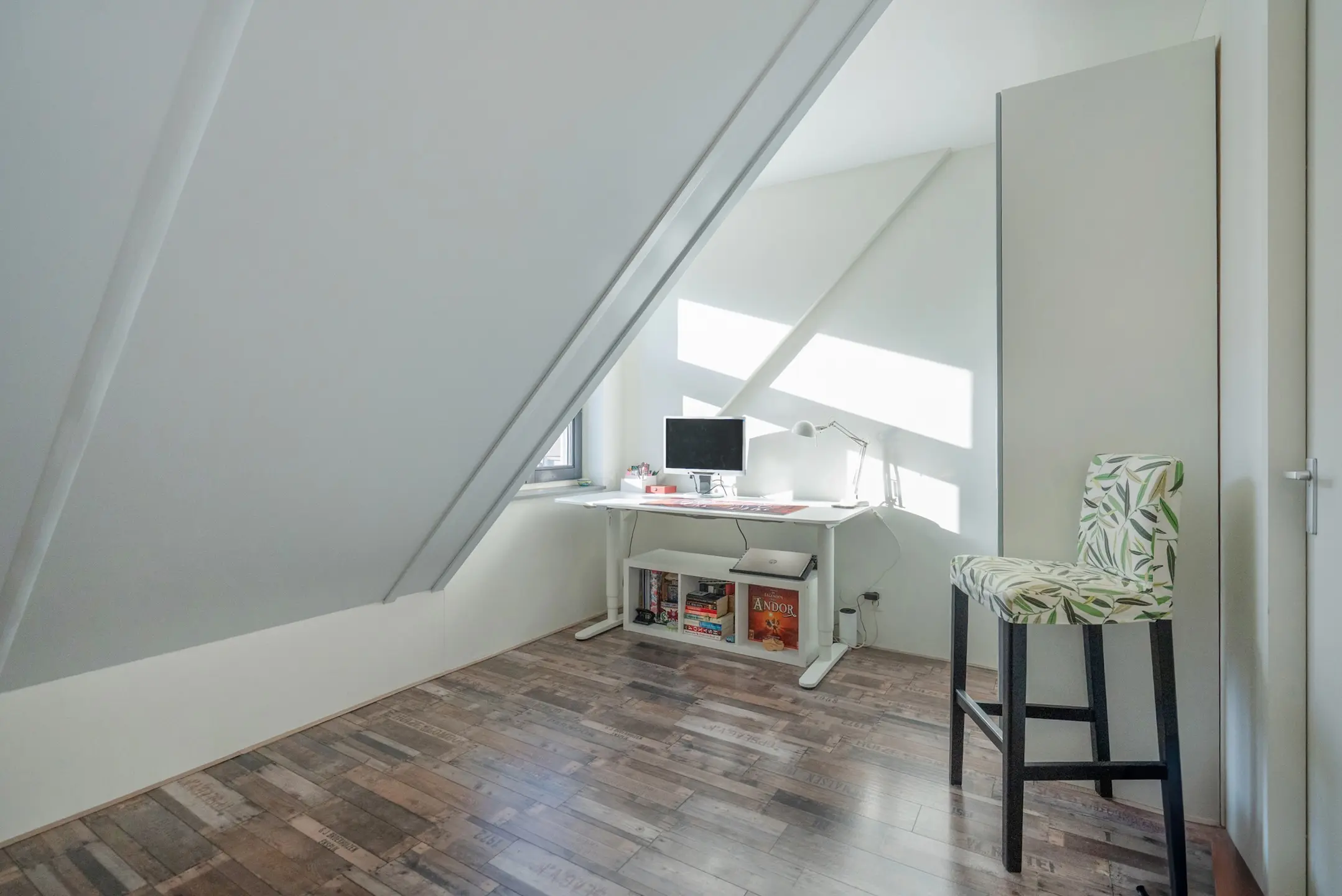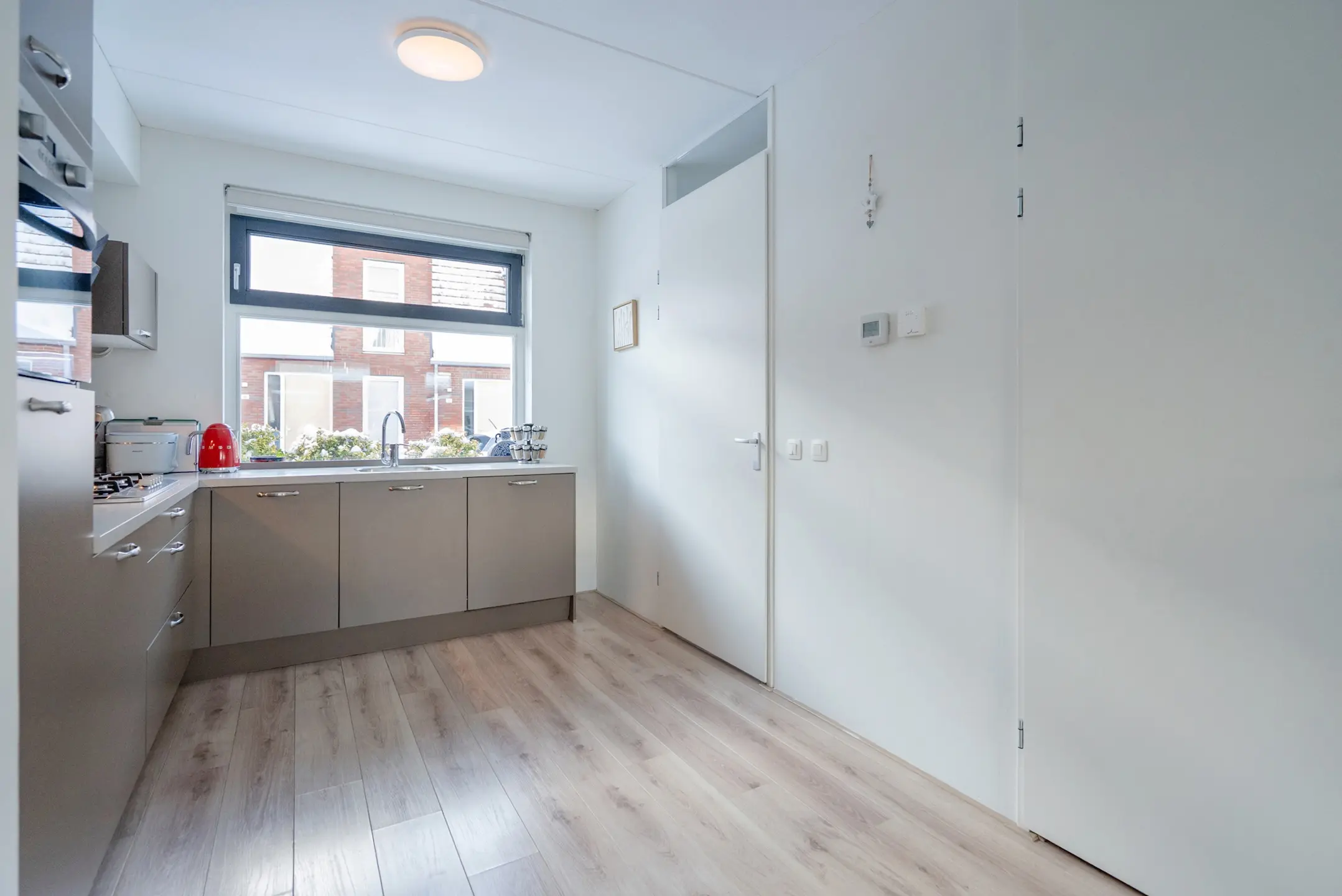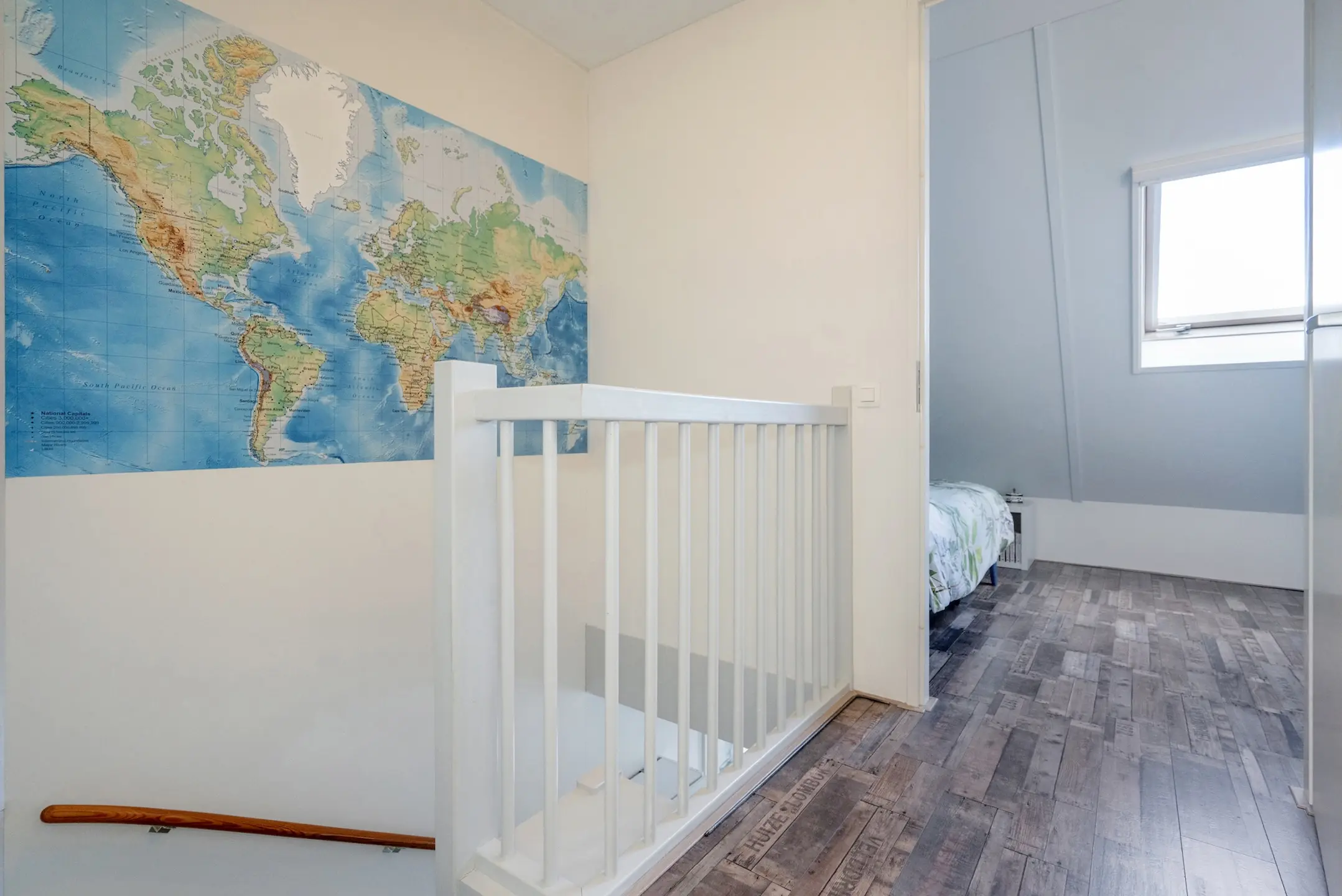 1e verdieping: overloop, voorgelegen slaapkamer met dakkapel, achtergelegen slaapkamer met groot Velux dakraam, keurige tussengelegen badkamer met inloopdouche, wastafel, en opstelplaats voor wasmachine en droger. De gehele verdieping is voorzien van een laminaat vloer en vloerverwarming.