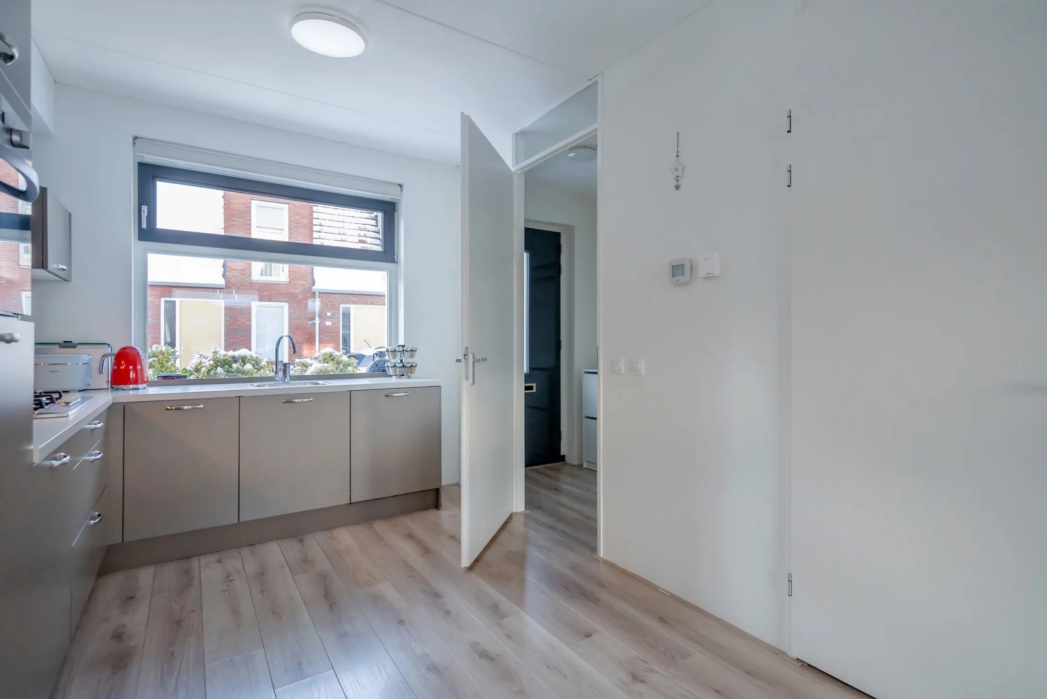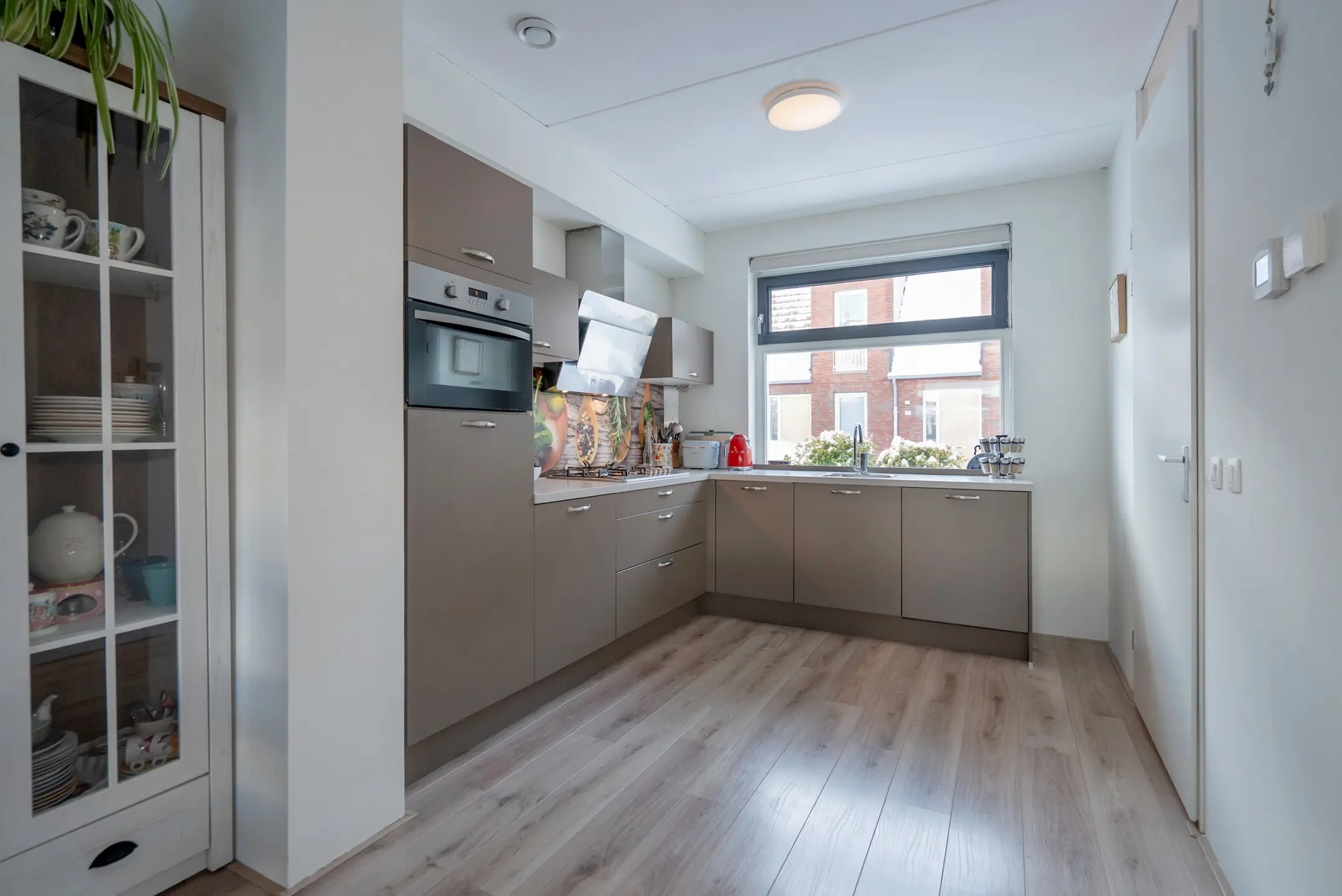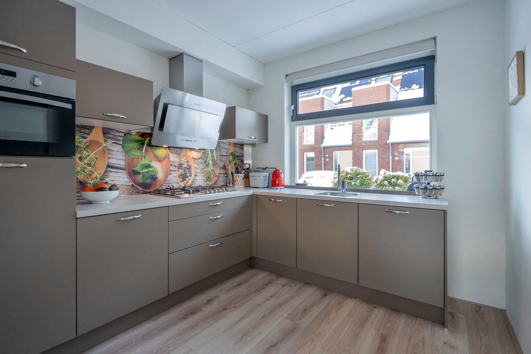Indeling: voortuin, entree met meterkast, net toilet met fontein, entree naar de sfeervolle woon-/eetkamer met voorraadkast/trapkast, moderne open keuken aan de voorzijde met afzuigkap, carrousel en diverse inbouwapparatuur w.o. 5-pits kookcomfort, vaatwasmachine, combimagnetron, koelkast en vriezer, tuingerichte living met deur naar de zonnige diepe achtertuin met houten berging en achterom. Gehele begane grond heeft een mooie laminaat vloer met vloerverwarming.