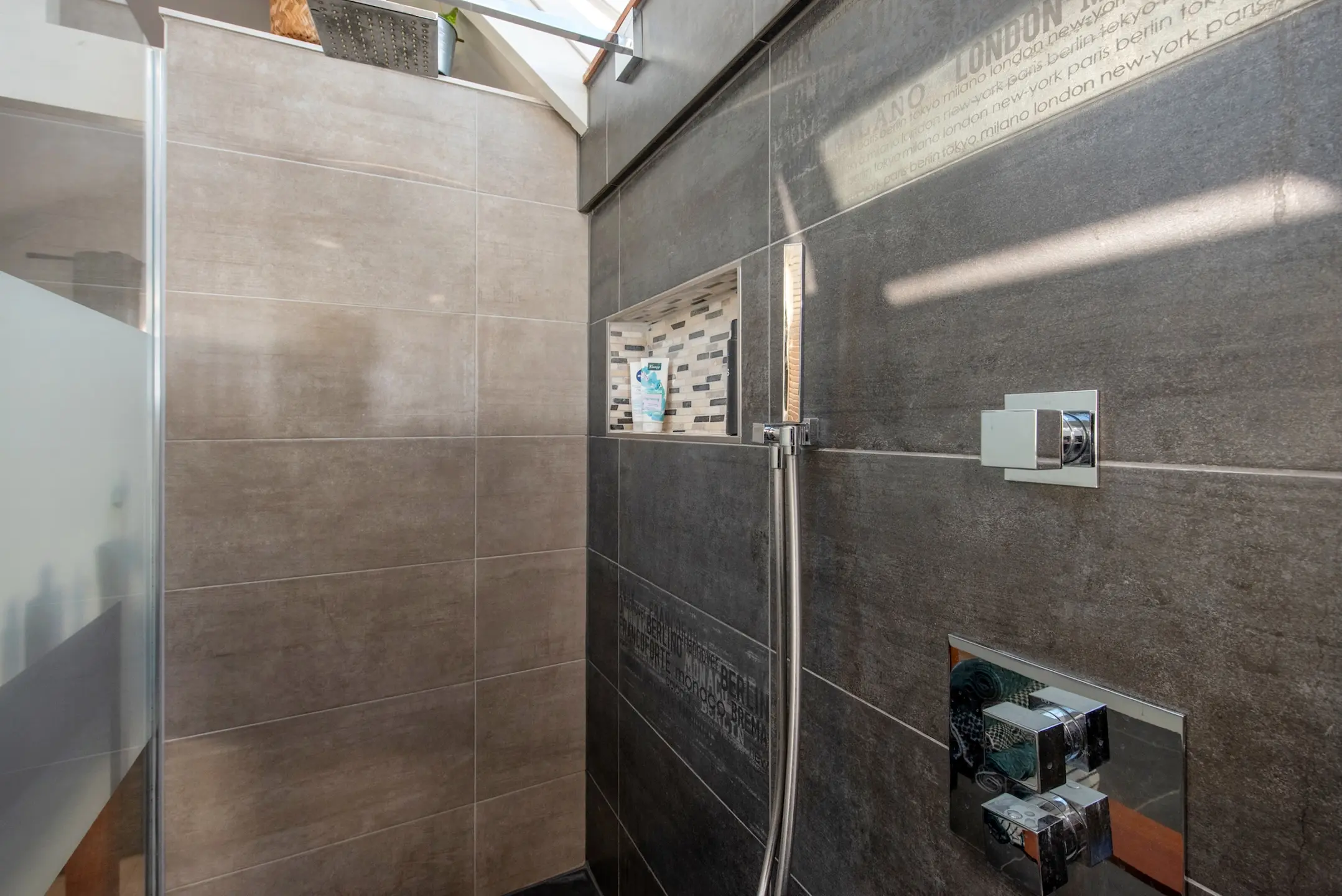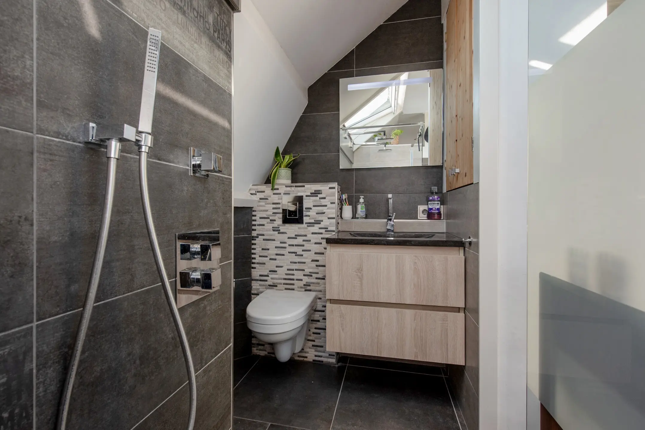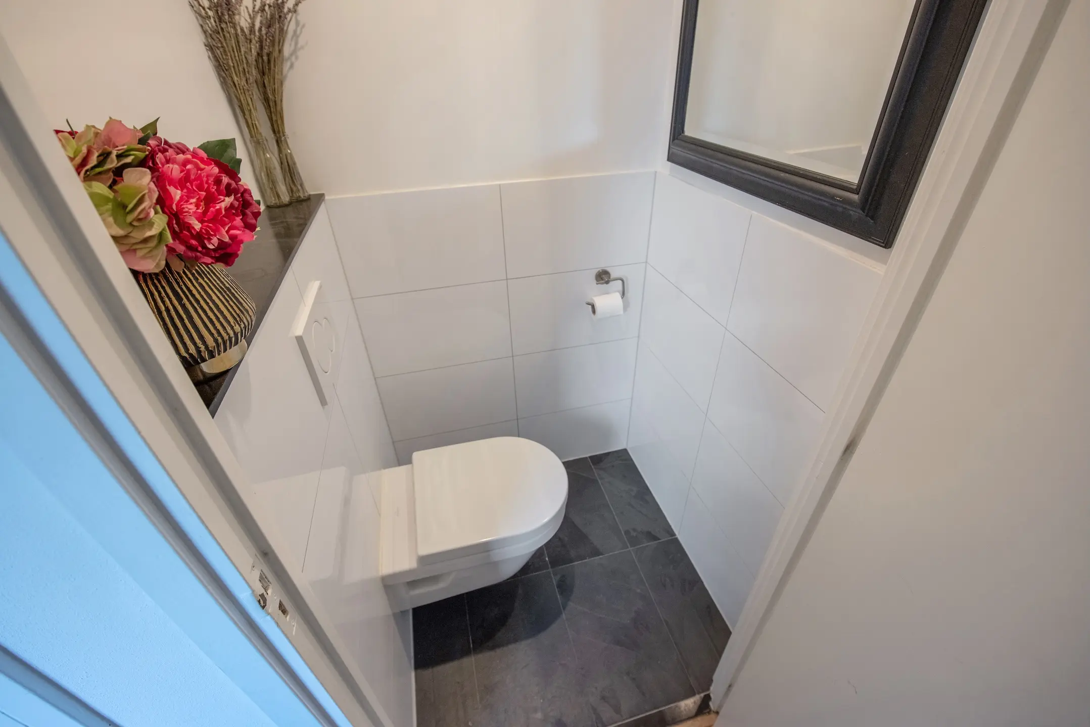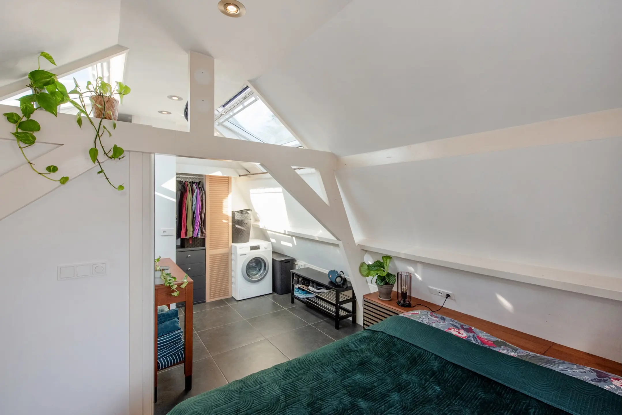 De trap leidt naar de eerste verdieping, een open ruimte waarin de fraaie houten balken van de dakconstructie direct in het oog springen. Hier bevindt zich de ruime slaapkamer met vloerverwarming met aangrenzende, royale badkamer, uitgerust met een dubbele inloopdouche, een ruime wastafelmeubel en een tweede toilet.