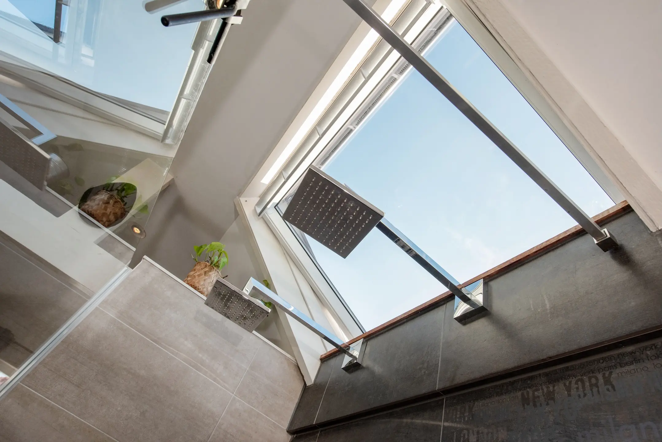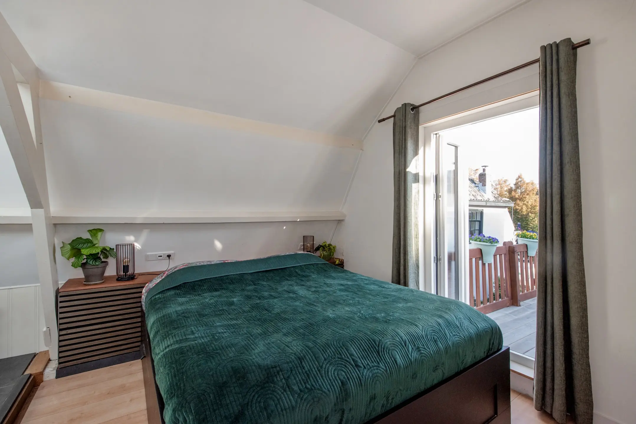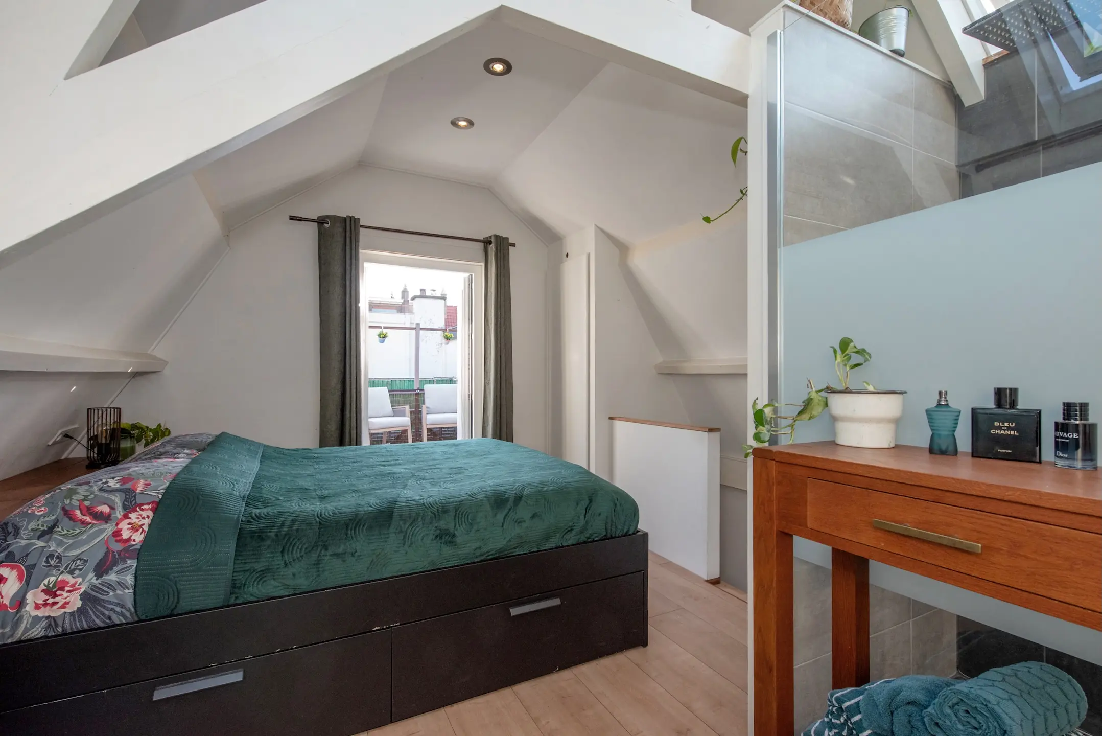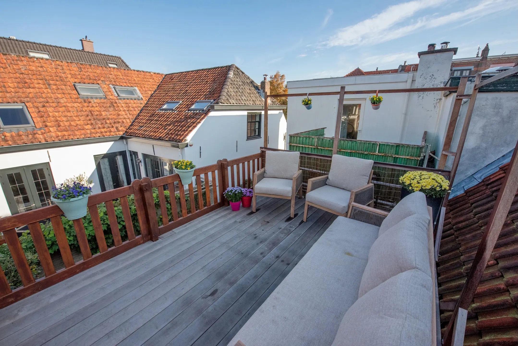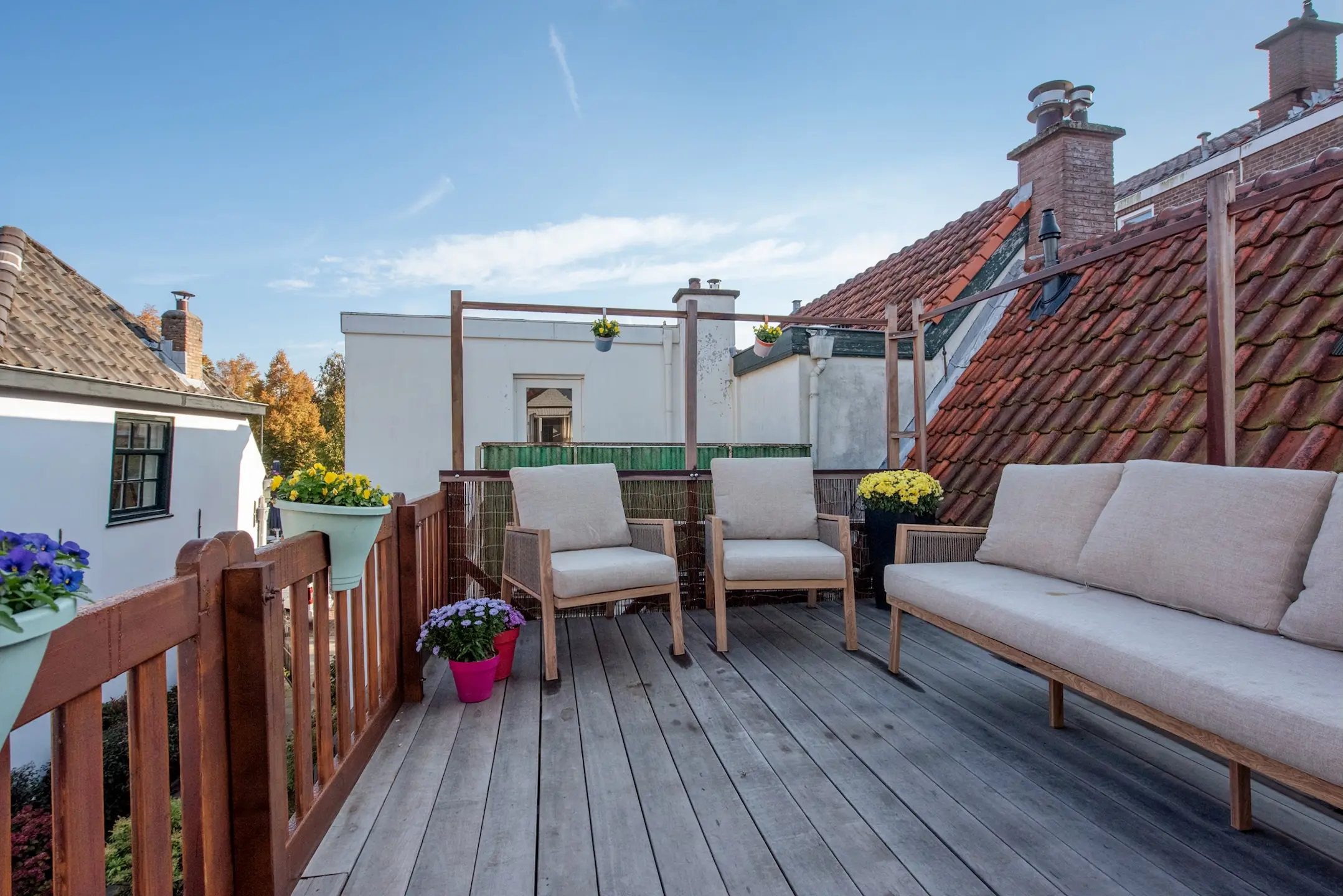 Vanuit de slaapkamer openen dubbele deuren naar het heerlijke dakterras met houten vlonder – een oase van rust, midden in het levendige centrum van Rijswijk.