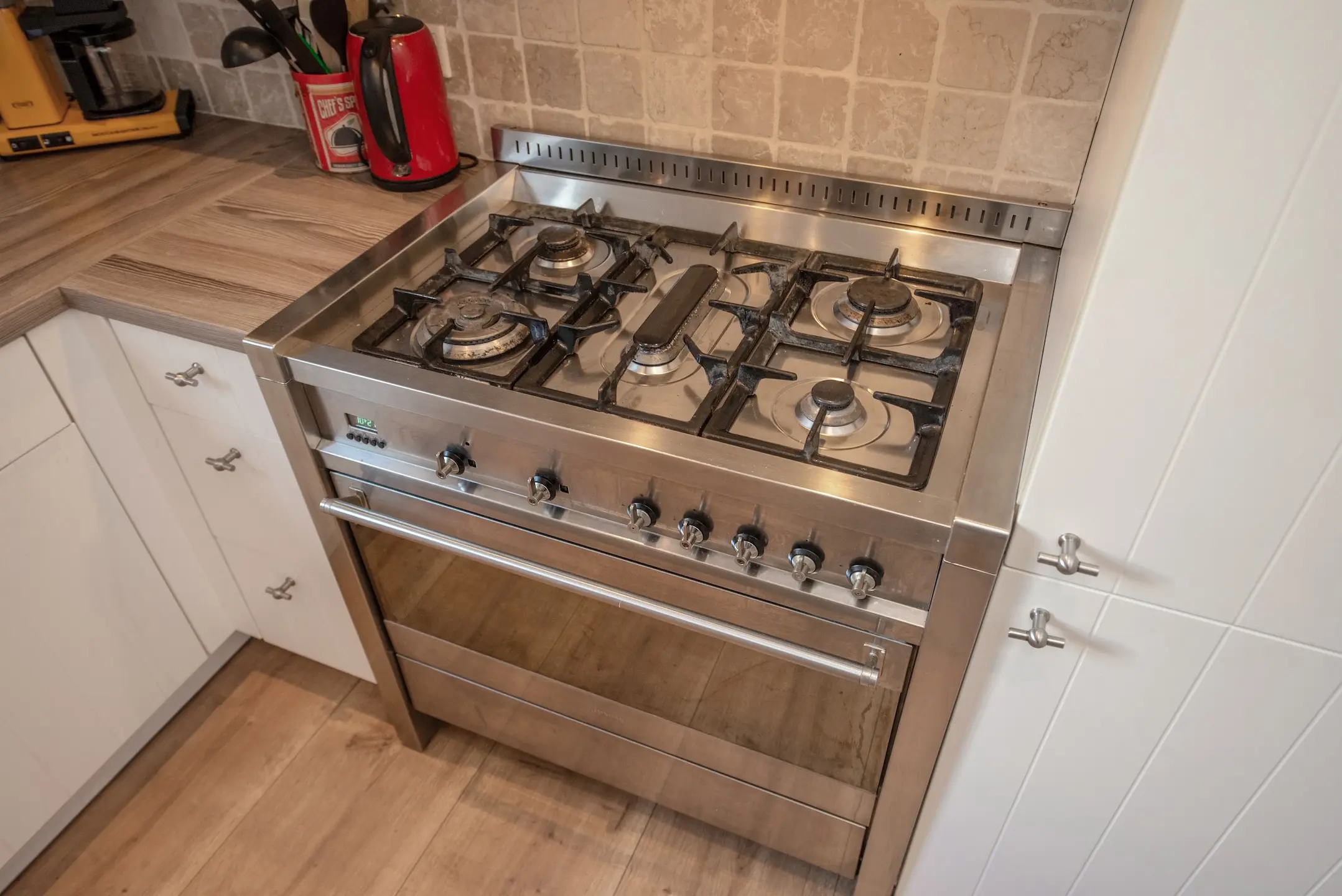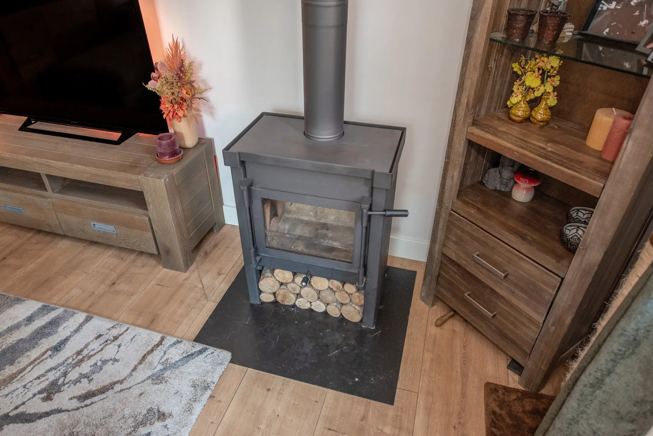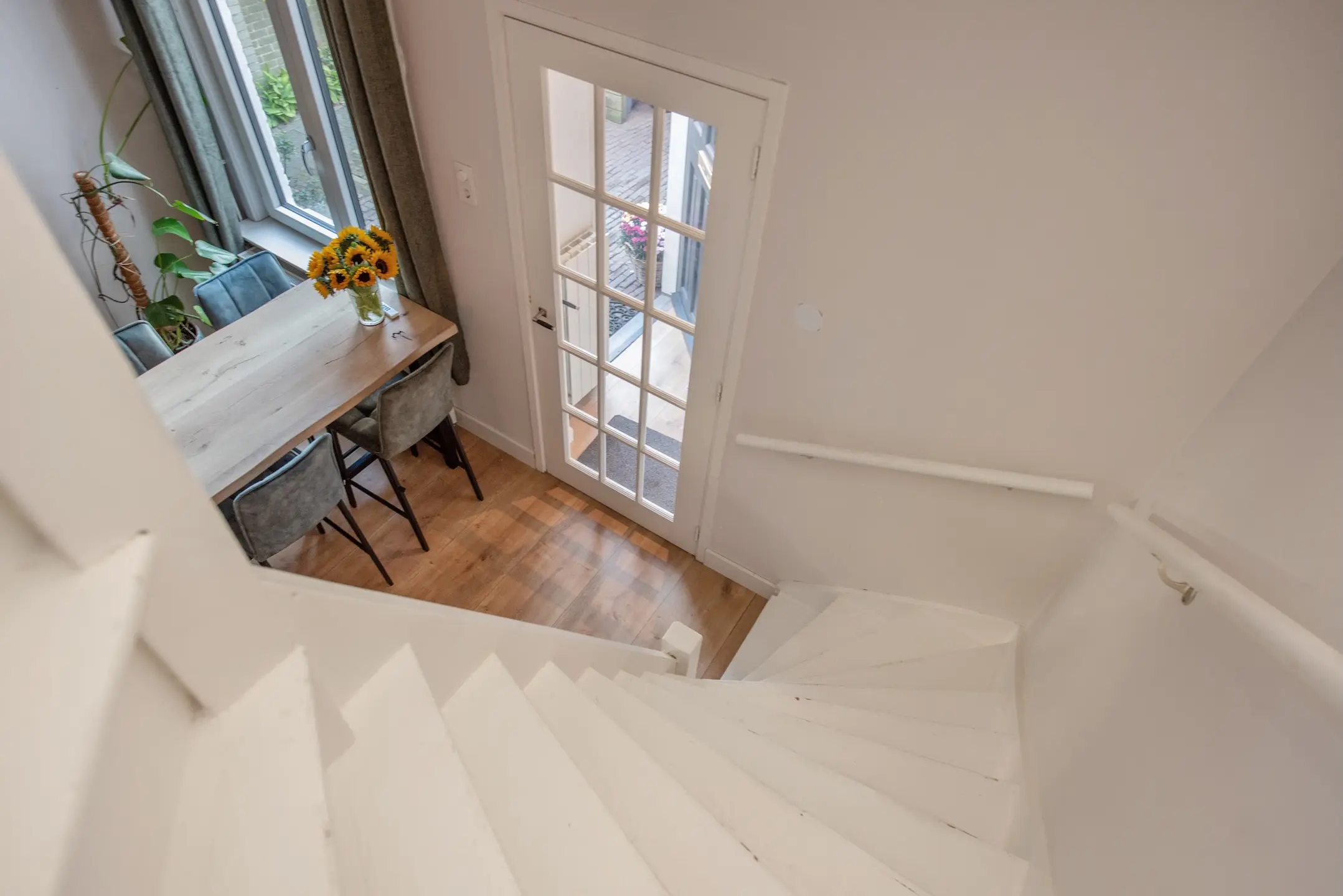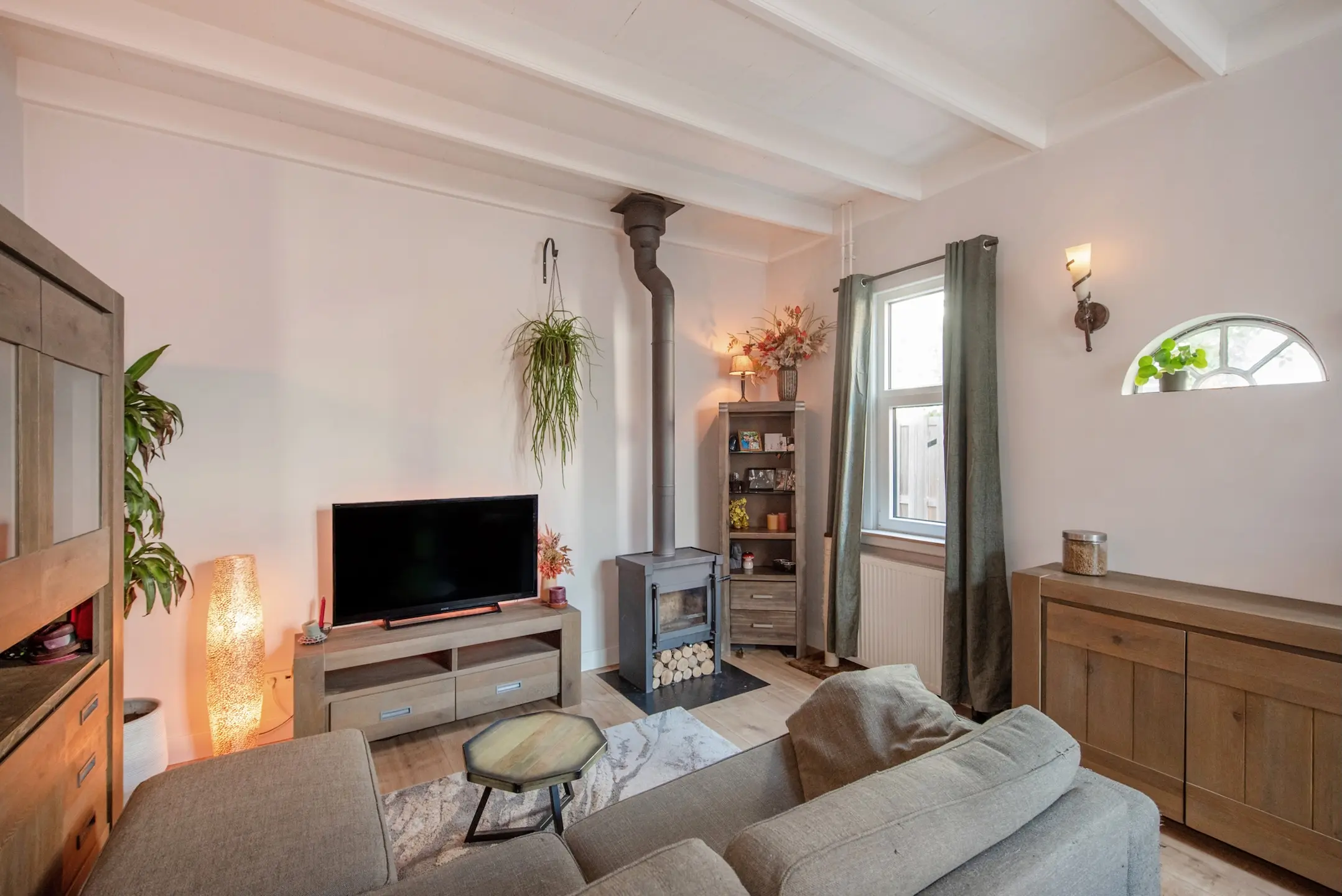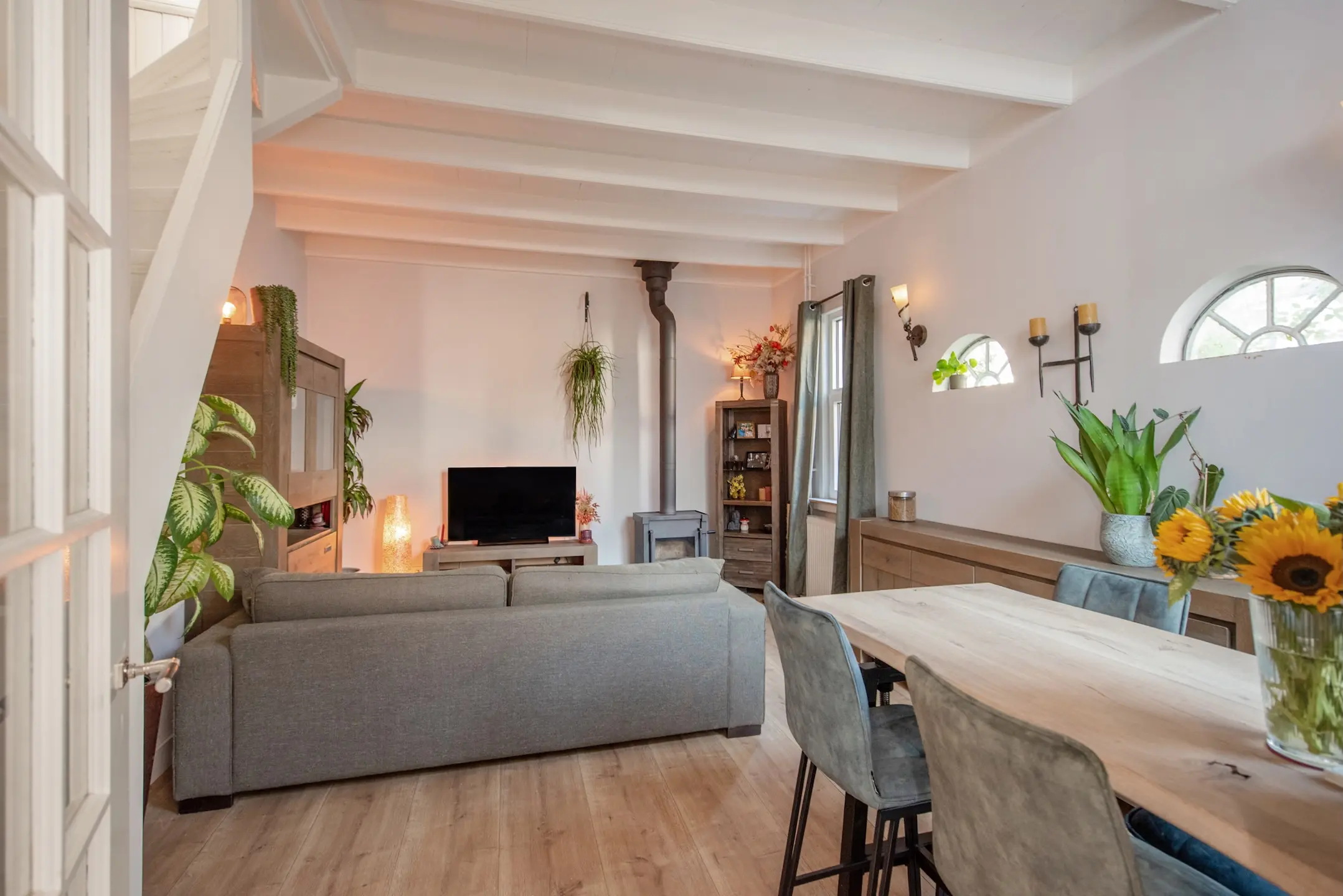 Door de deur loopt u de sfeervolle woon- en eetkamer in, waar de hoge plafonds (ca. 3 meter) en de houtkachel zorgen voor een warme en huiselijke sfeer. Onder de trap bevindt zich extra bergruimte, slim geïntegreerd in het geheel.