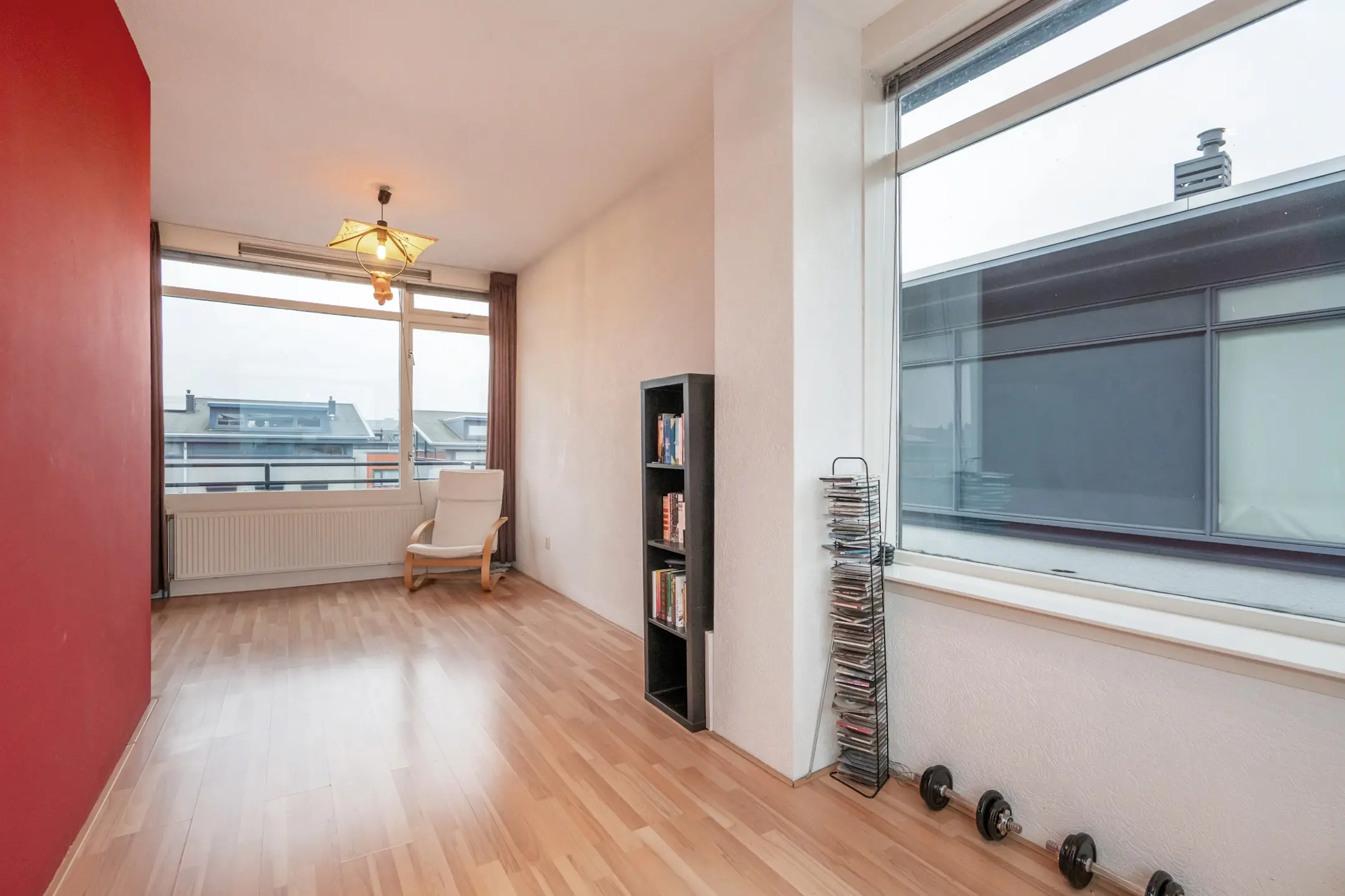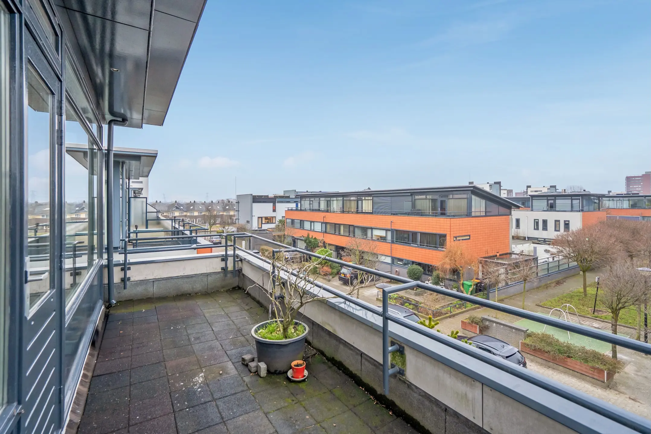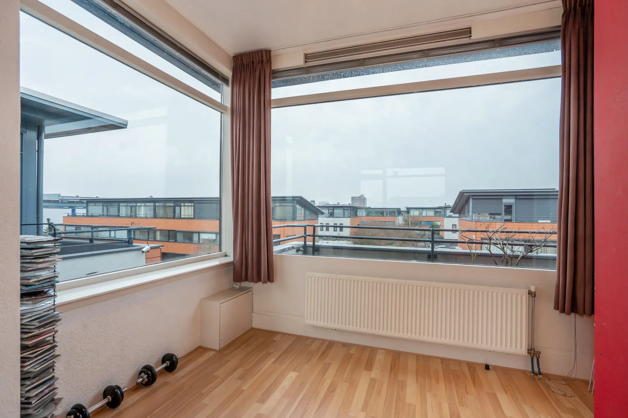 Mede door de aanwezigheid van een grote raampartij en een dakraam bijzonder lichte overloop met een opstelplaats voor de wasmachine en wasdroger. Middels een deur toegang tot het voorgelegen zonnige dakterras. Achtergelegen slaapkamer met toegang tot het achtergelegen balkon. Royale 6e slaapkamer met diverse ramen. Aan de achterzijde bevindt zich een zonnig balkon over de volle breedte van de woning en aan de voorzijde een riant dakterras, gunstig gelegen op het westen.