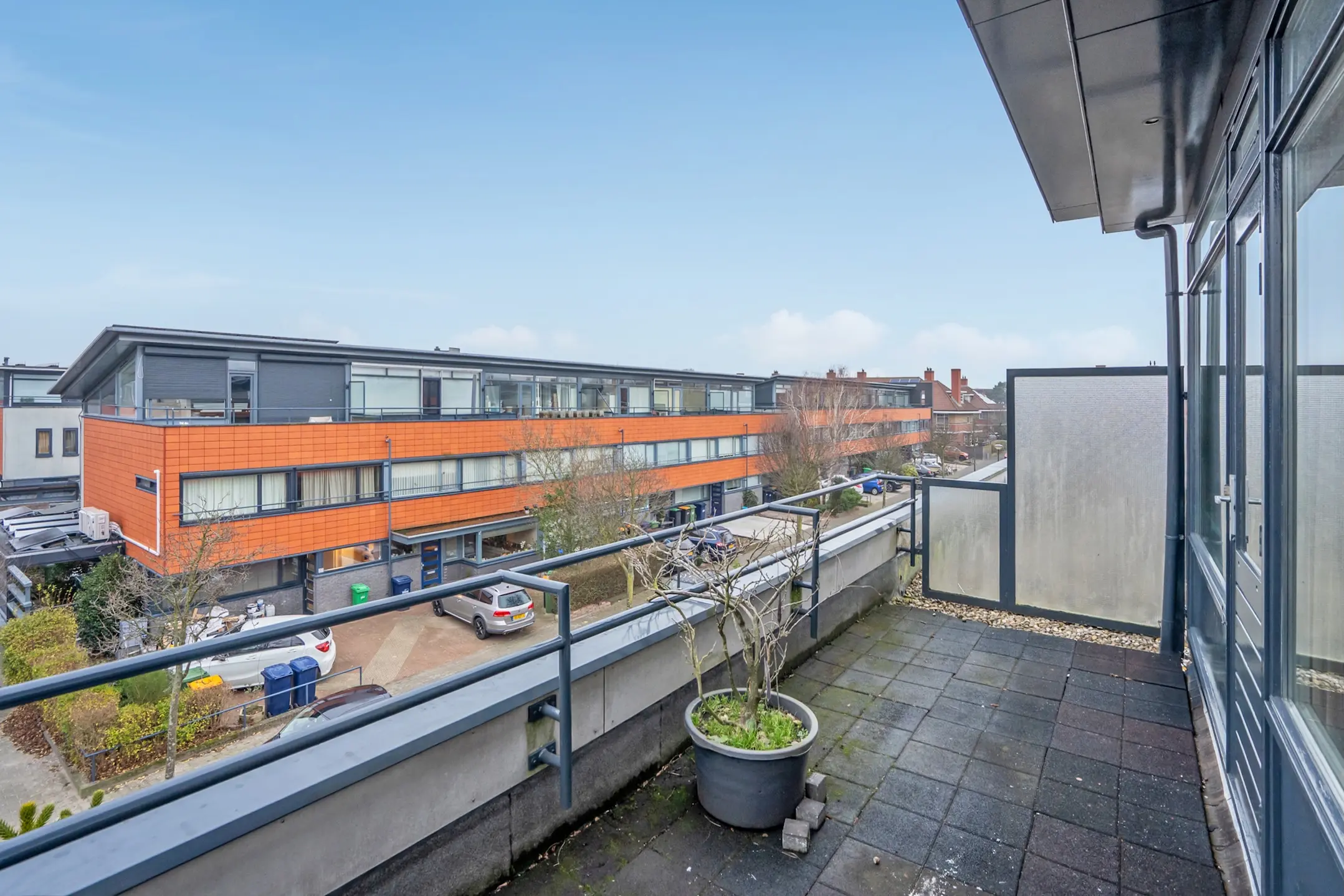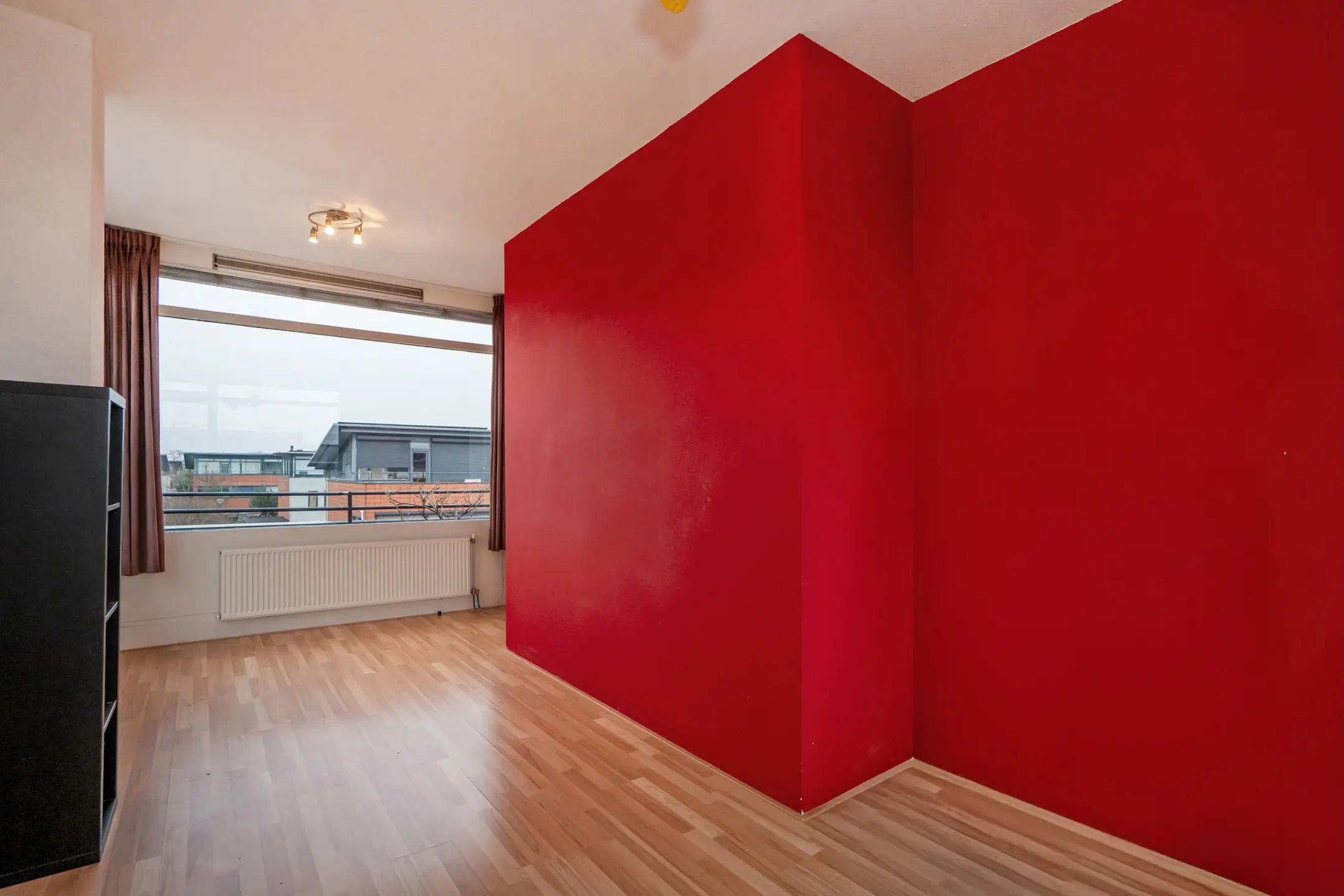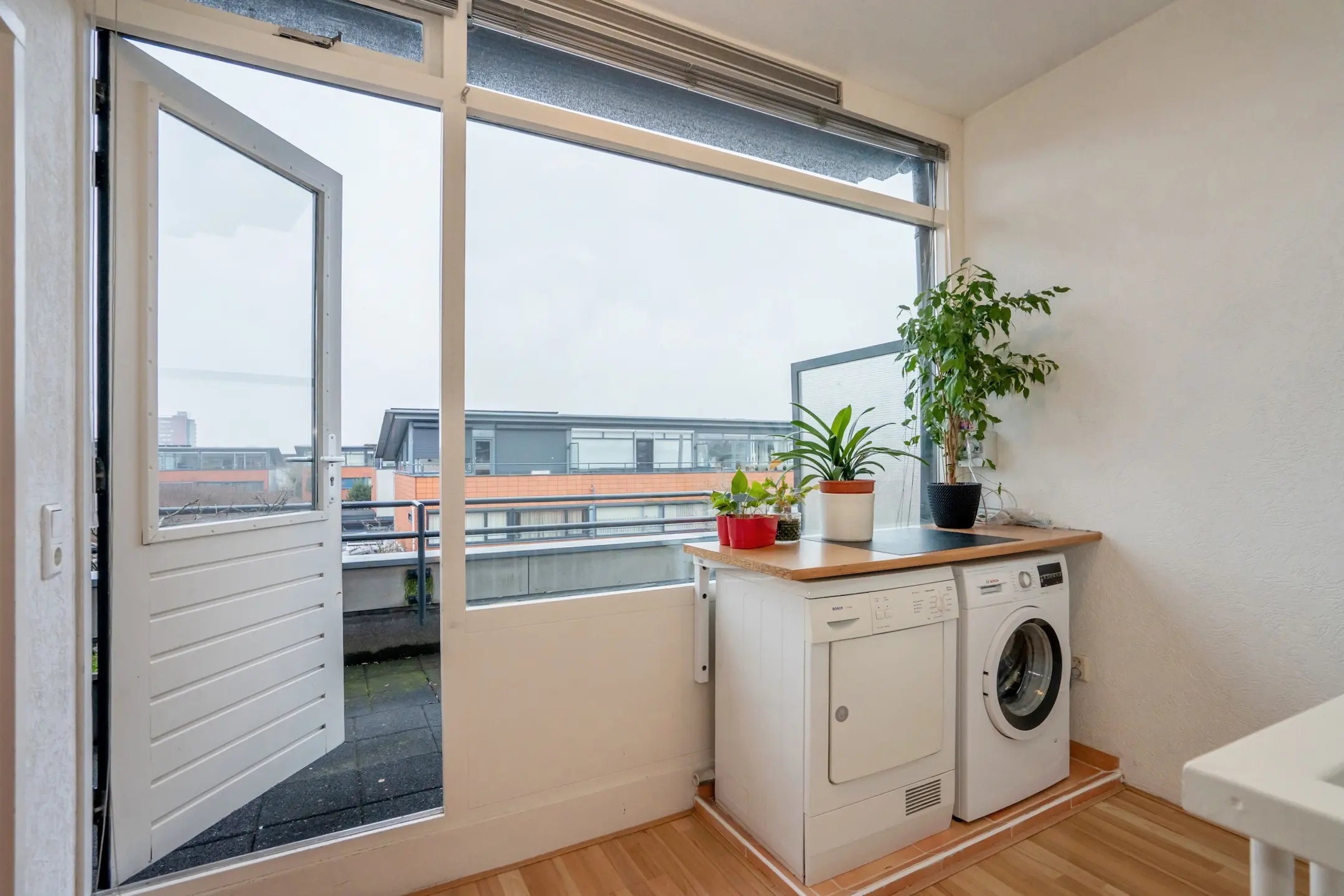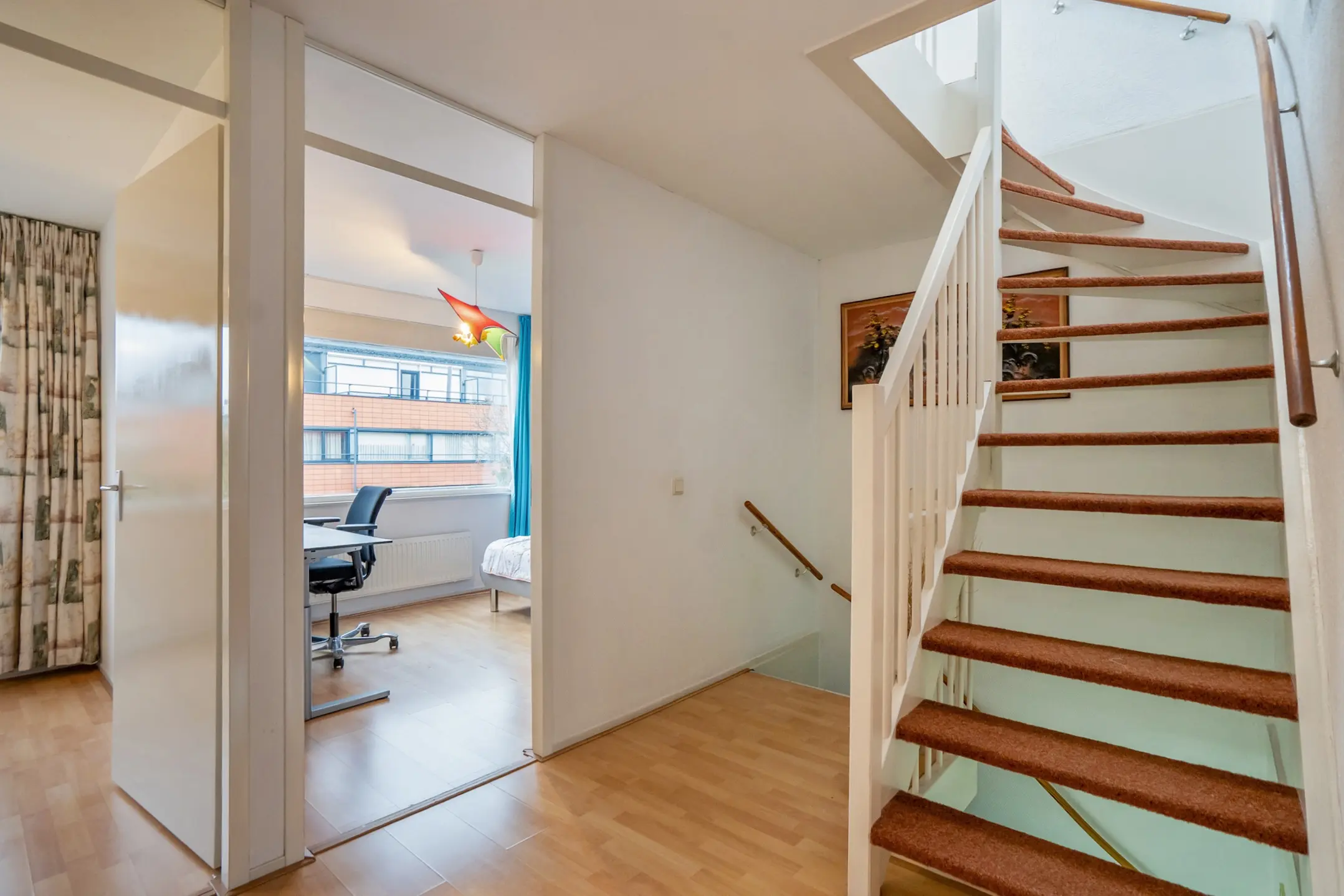 Mede door de aanwezigheid van een grote raampartij en een dakraam bijzonder lichte overloop met een opstelplaats voor de wasmachine en wasdroger. Middels een deur toegang tot het voorgelegen zonnige dakterras. Achtergelegen slaapkamer met toegang tot het achtergelegen balkon. Royale 6e slaapkamer met diverse ramen. Aan de achterzijde bevindt zich een zonnig balkon over de volle breedte van de woning en aan de voorzijde een riant dakterras, gunstig gelegen op het westen.