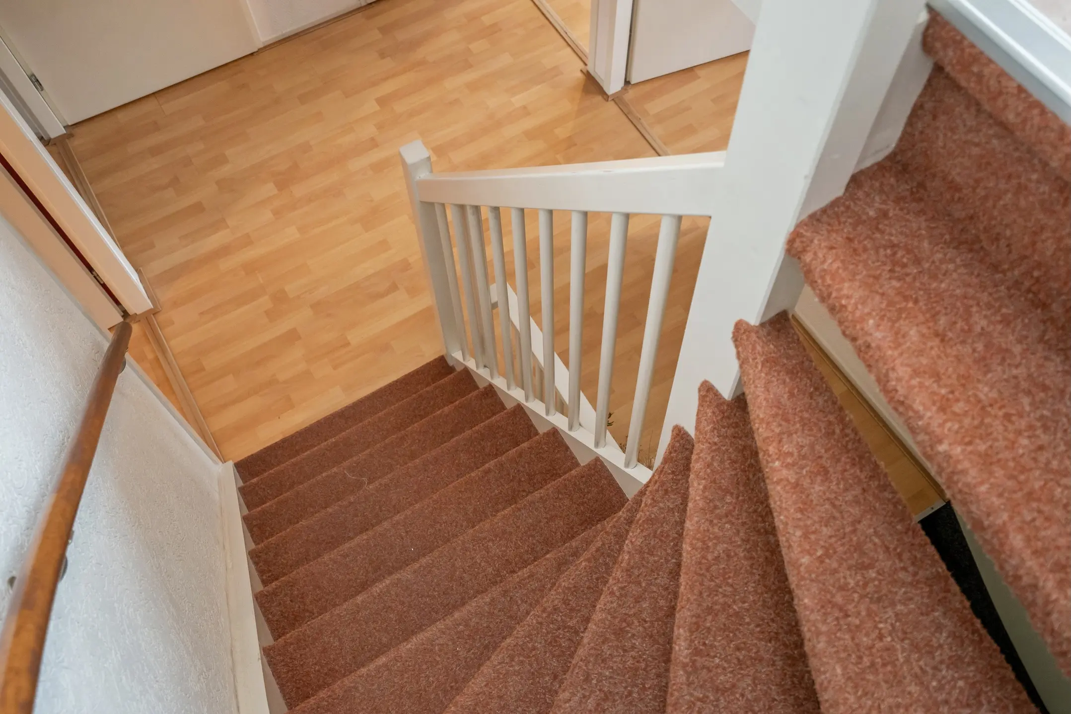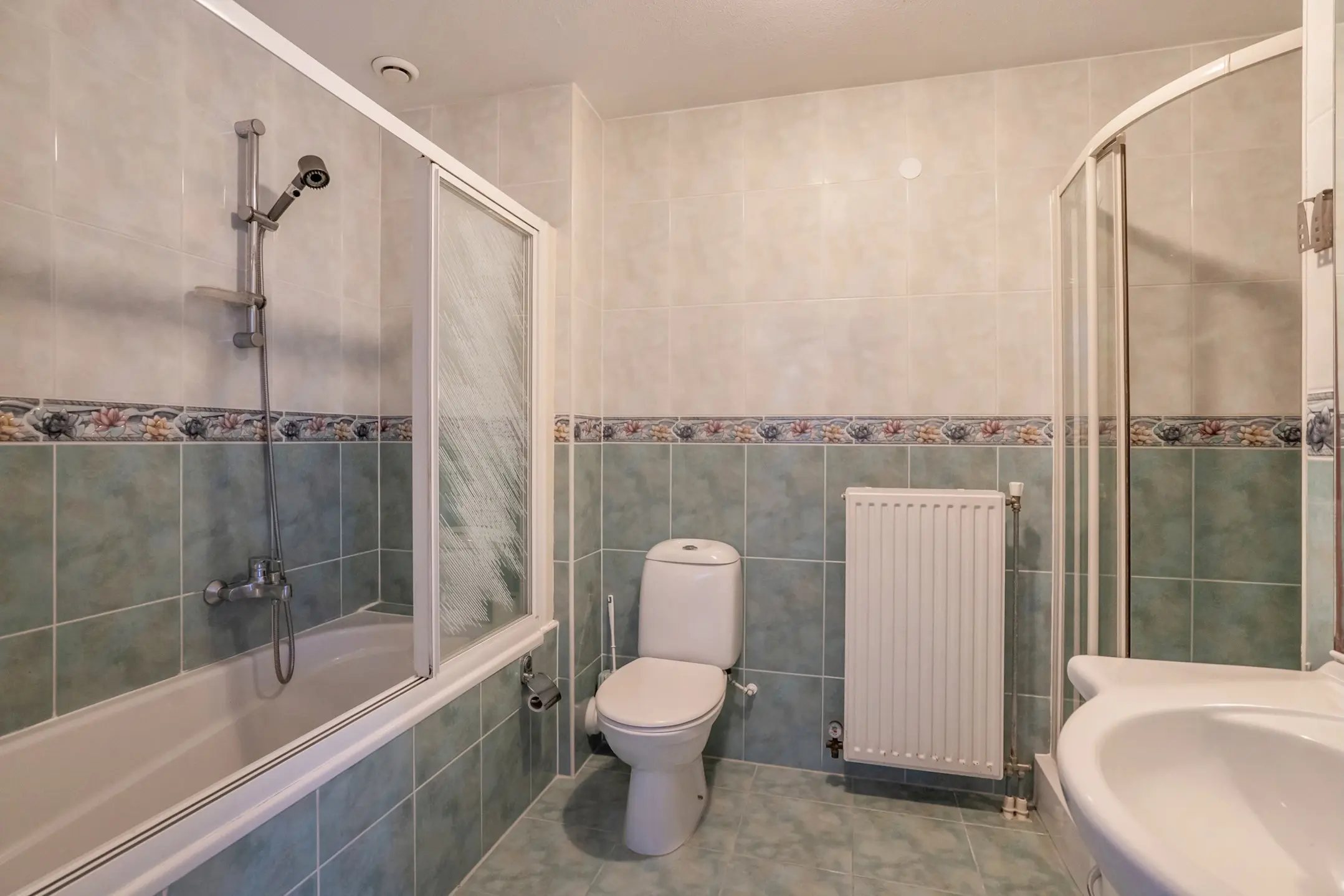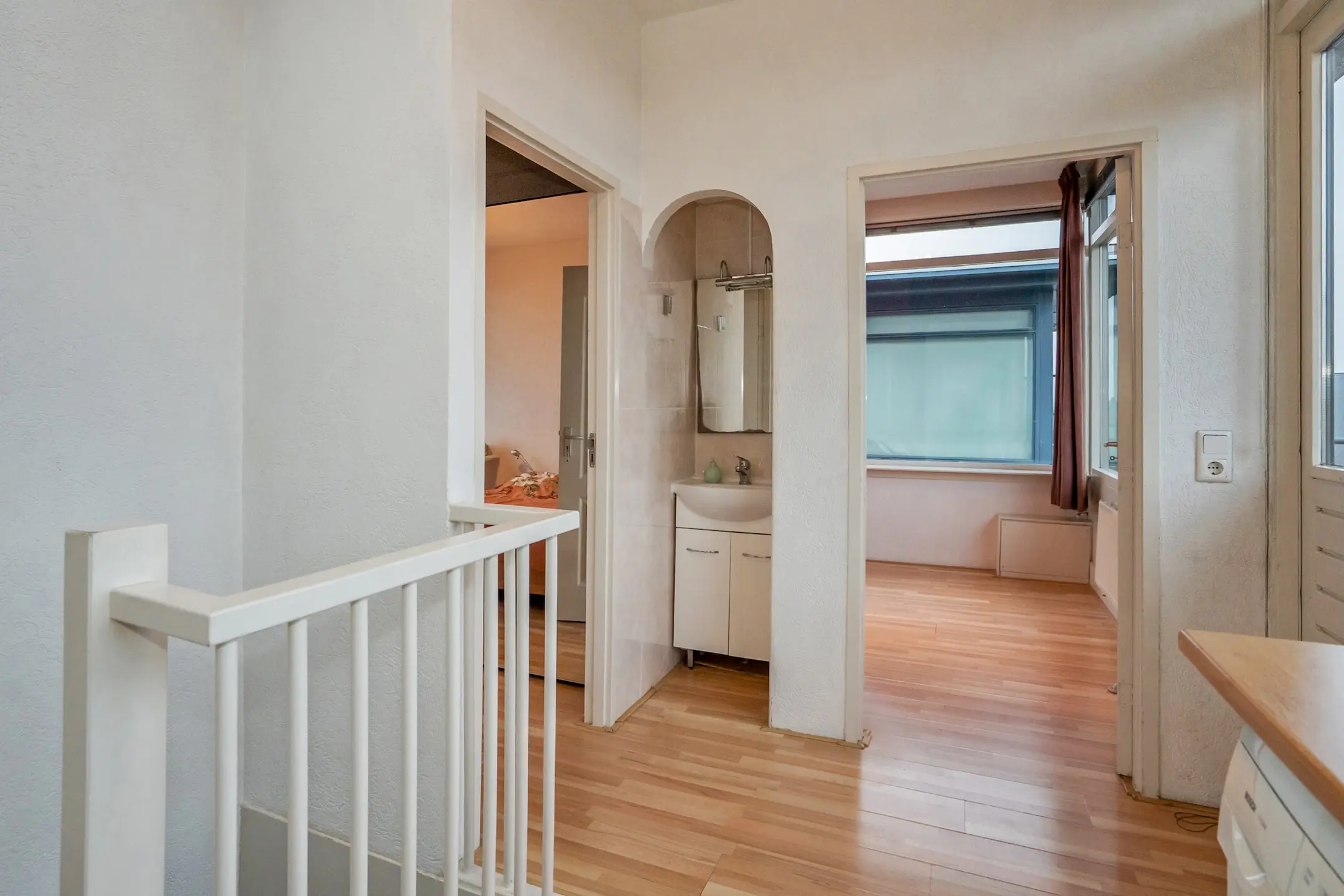 Overloop met een afgesloten stookruimte. twee slaapkamers aan de voorzijde en twee aan de achterzijde. De tussengelegen badkamer is ingericht met een ligbad, douche, toilet en wastafel.