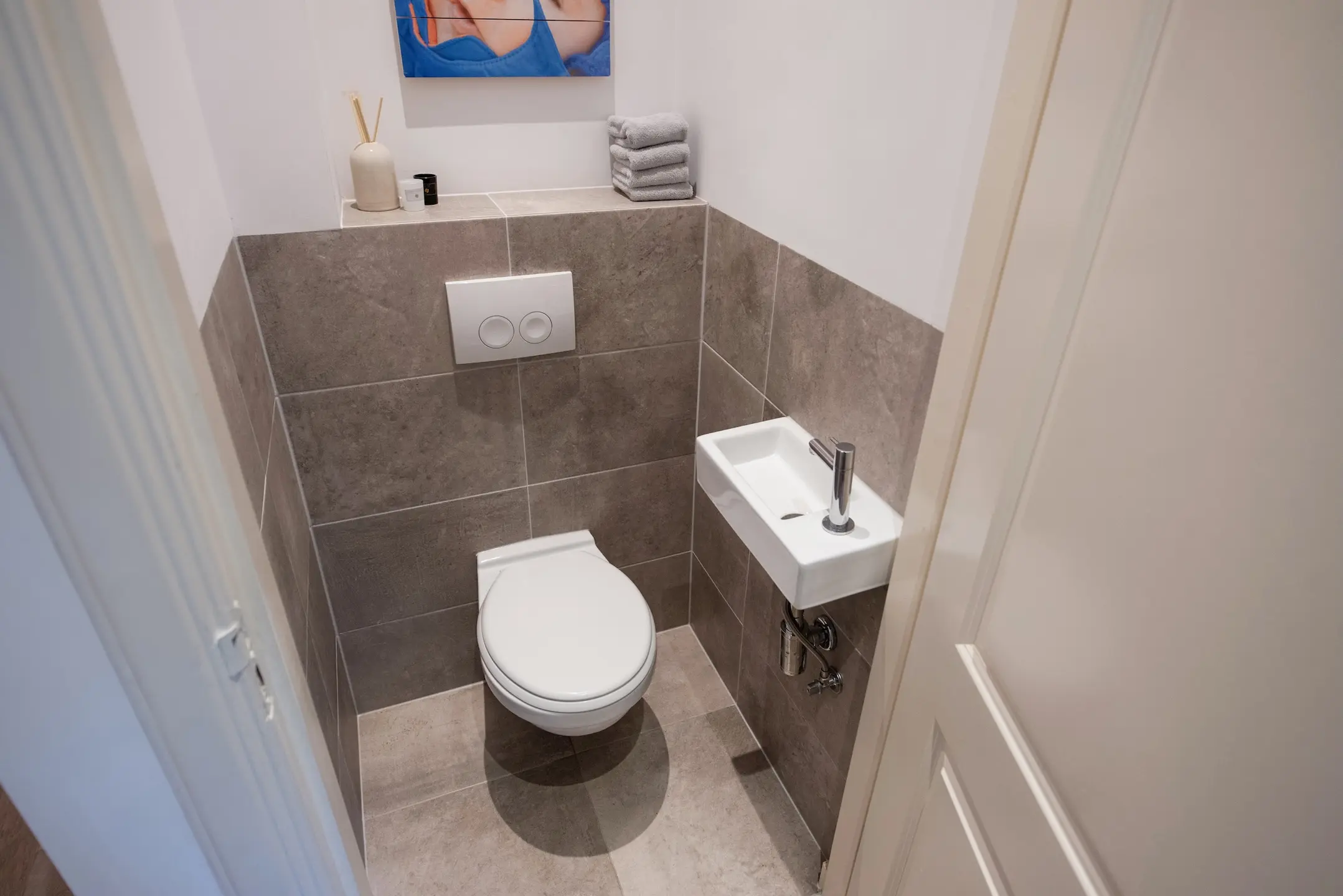 Vestibule met prachtige granito vloer en een uitgebreide meterkast. Vanuit hier toegang tot de ruime hal met openslaande deuren naar de woon-/eetkamer. Het moderne toilet is voorzien van een fonteintje en inbouwspots.