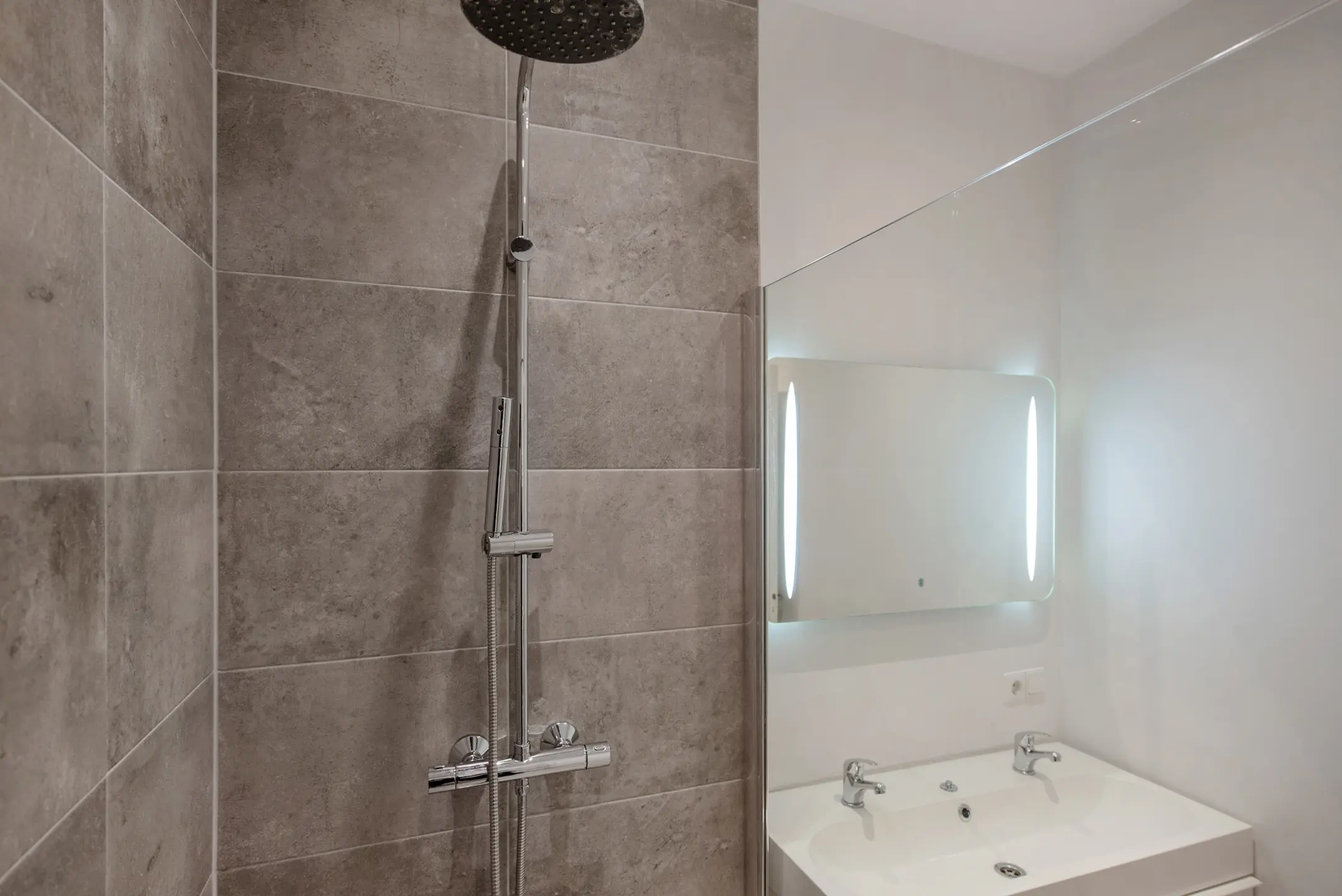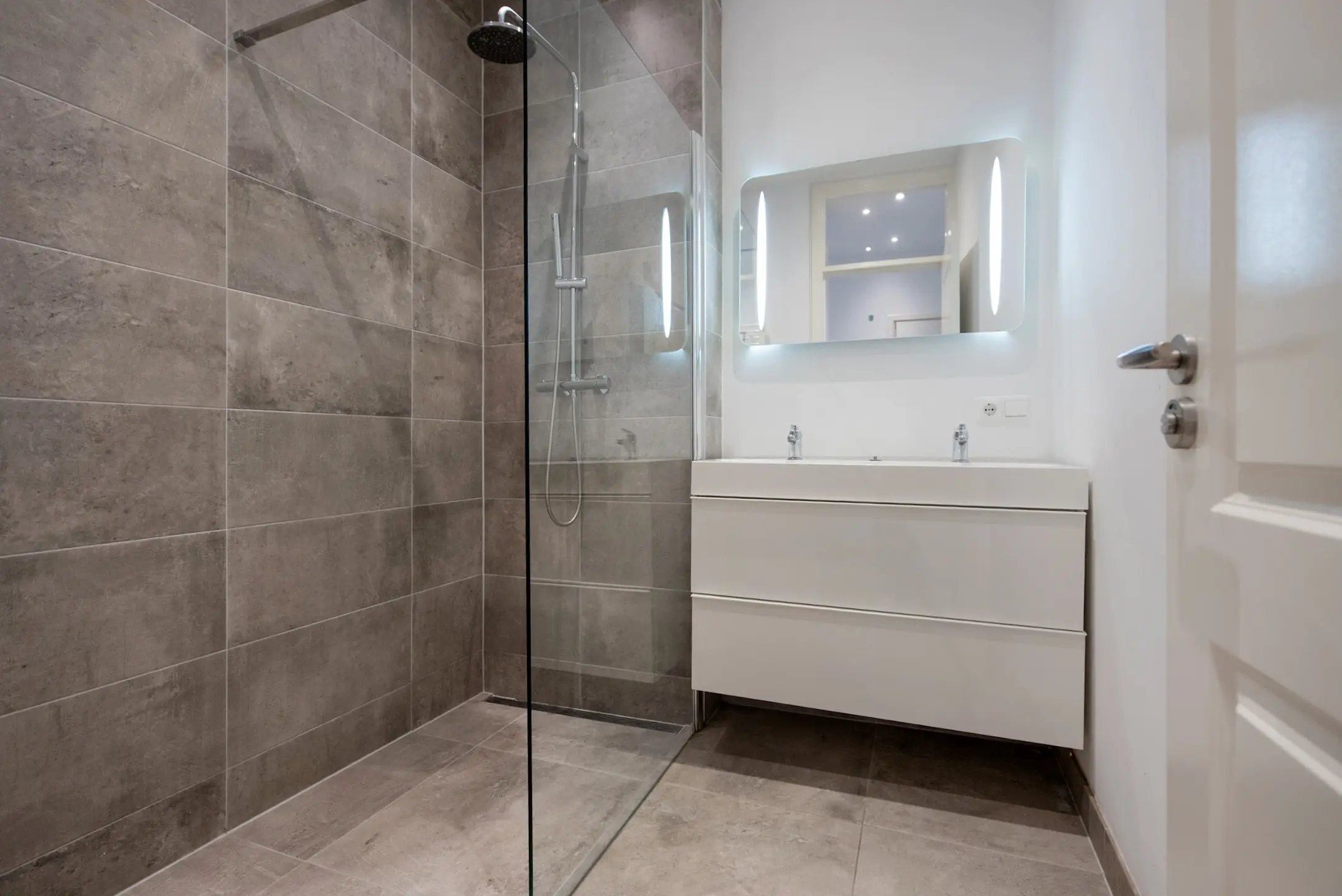 De luxe badkamer is geheel betegeld en uitgerust met een inloopdouche met hand- en stortdouche brede drain voor de wateropvang, wastafelmeubel, spiegelwand met verwarming en spotverlichting.