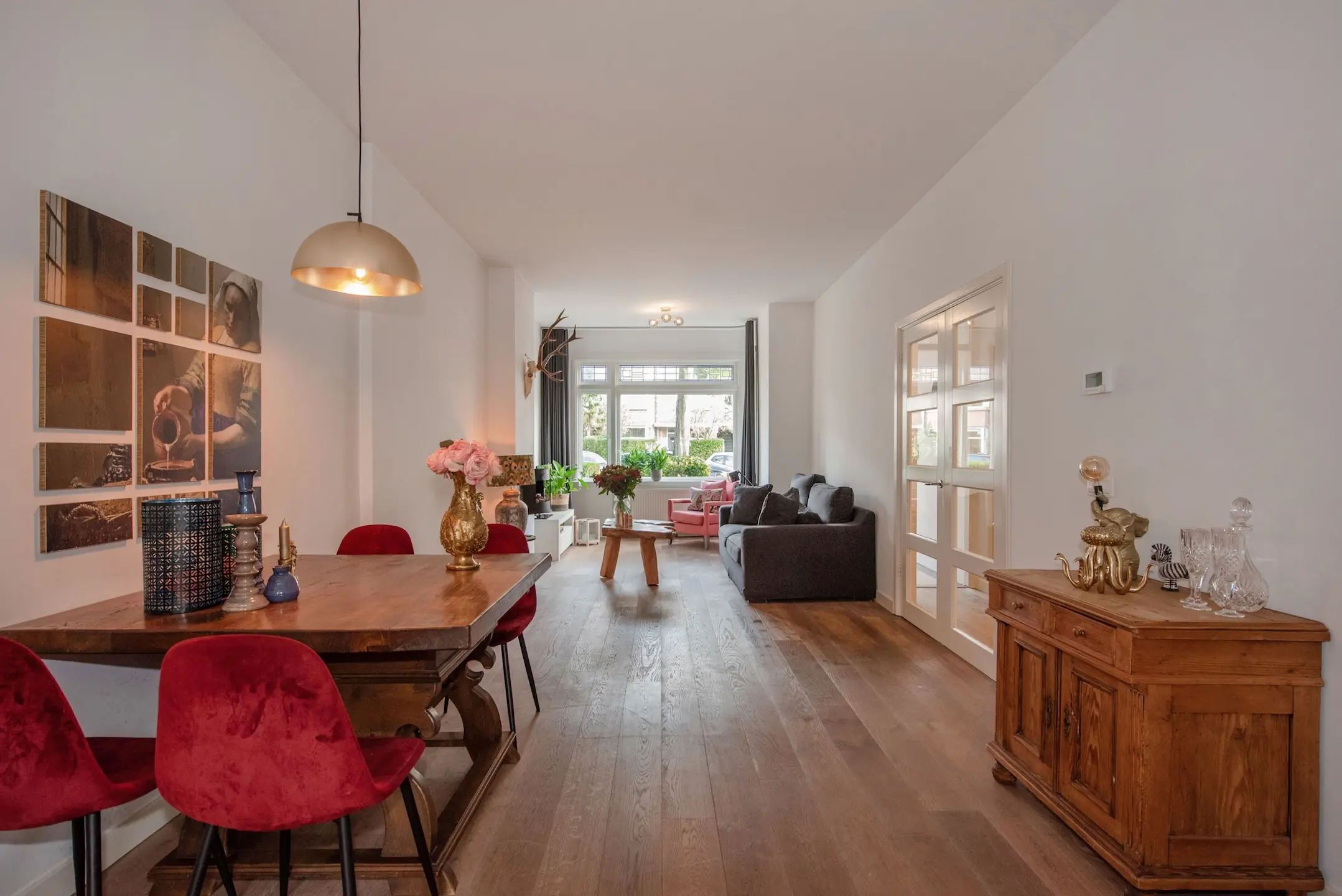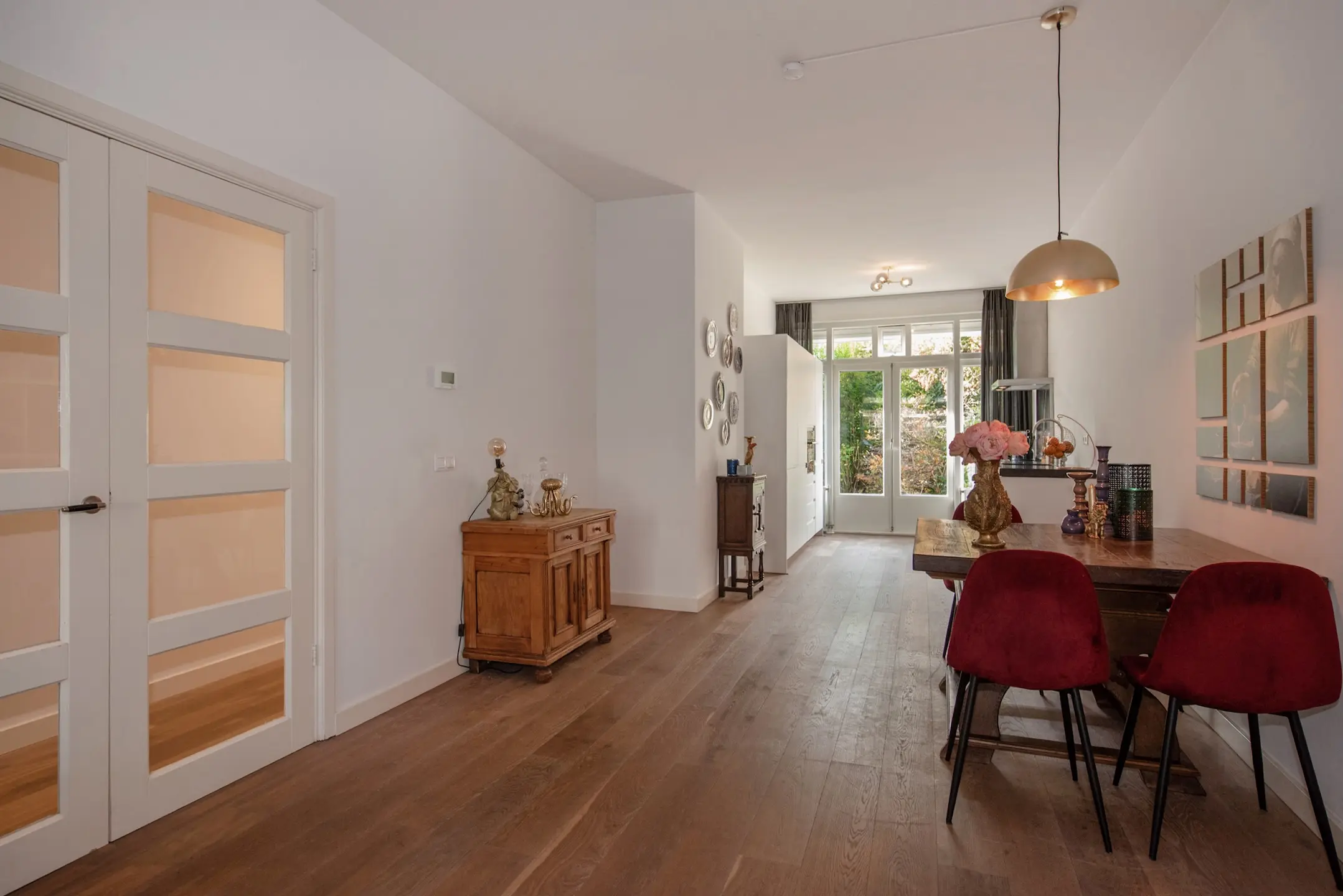 De woon-/eetkamer is bijzonder sfeervol dankzij de eikenhouten vloer, erker met glas-in-loodramen, en strak gestuukte wanden en plafonds.