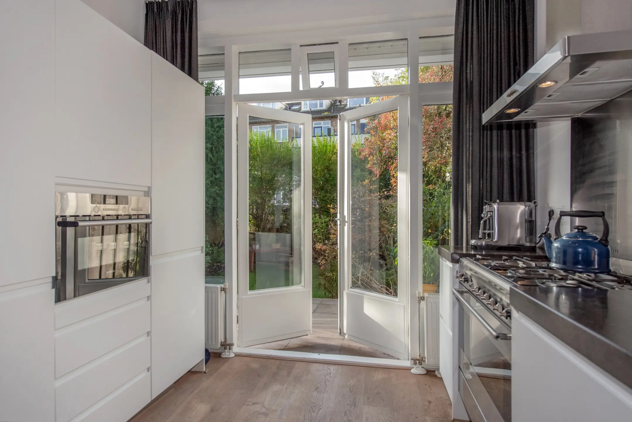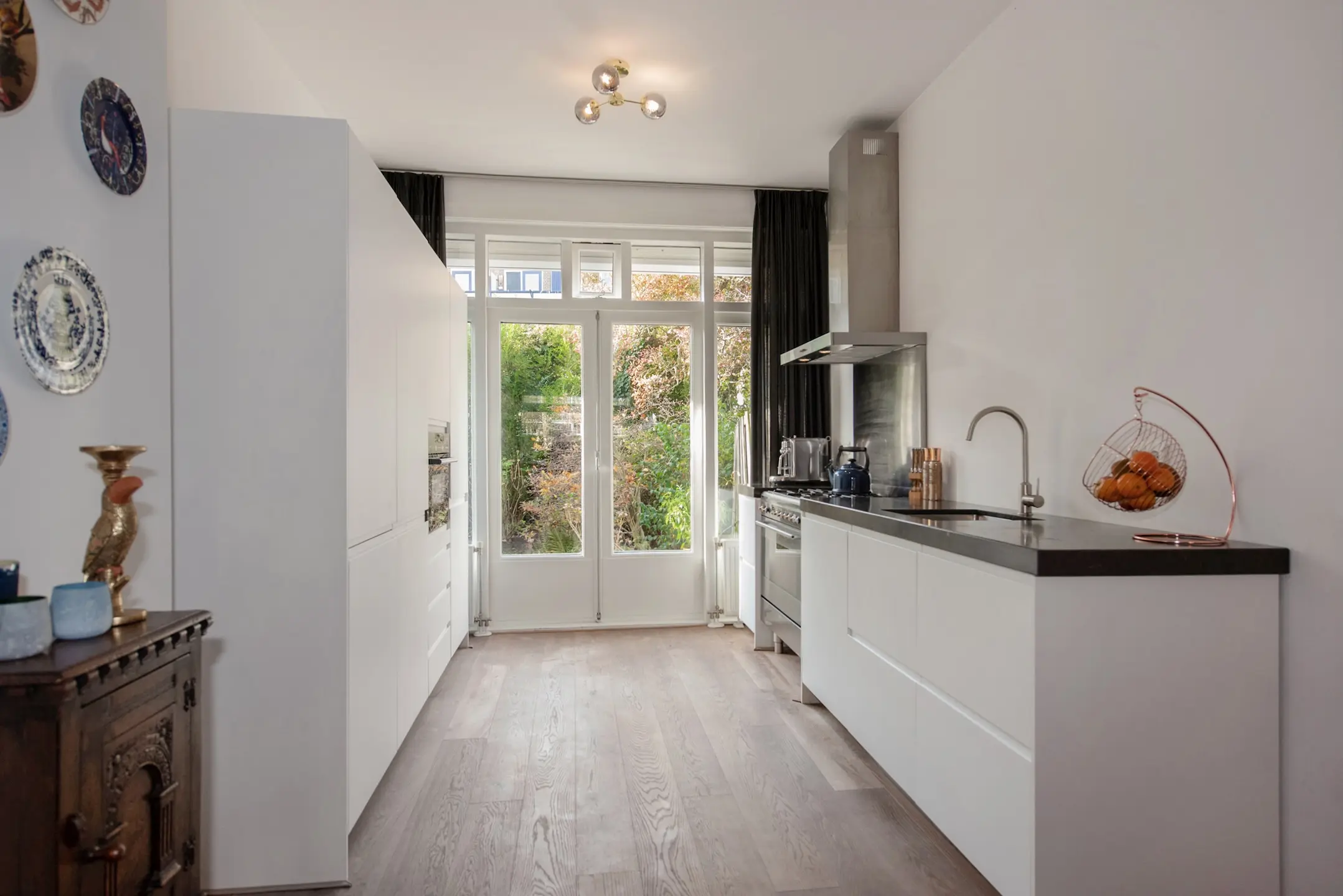 Aan de achterzijde bevindt zich de luxe open keuken (2016), uitgevoerd met een hardstenen aanrechtblad en lichte, moderne kasten en laden. De keuken is voorzien van diverse inbouwapparatuur, waaronder een 6-pits Smeg fornuis met brede oven, koelkast, vriezer en combi-magnetron.