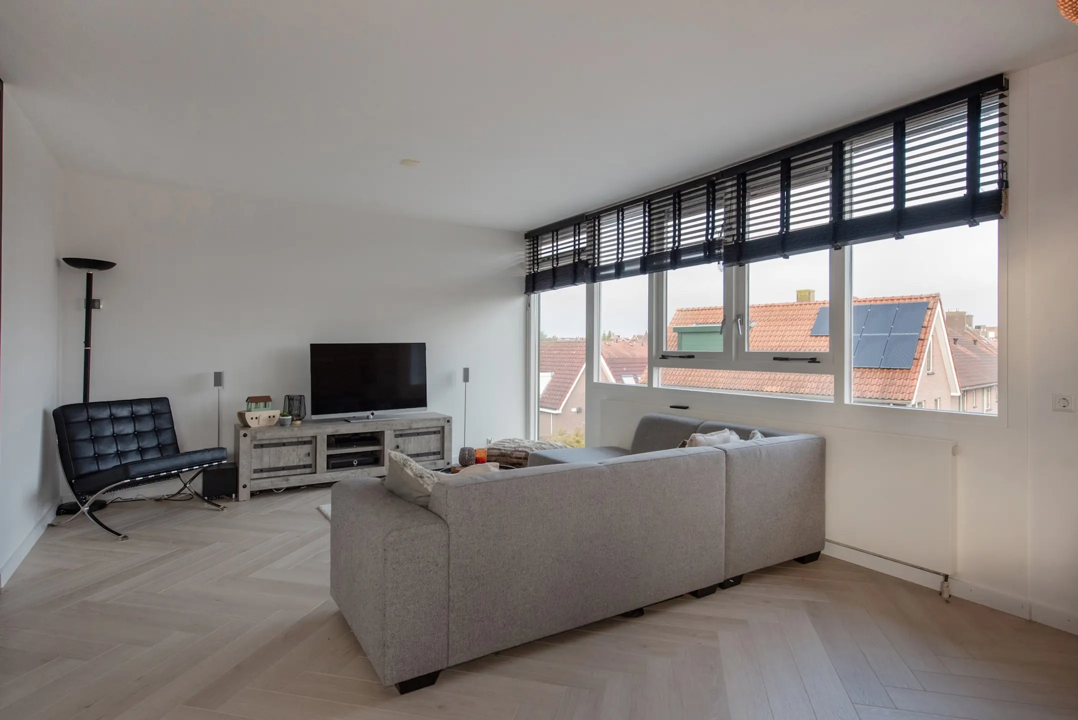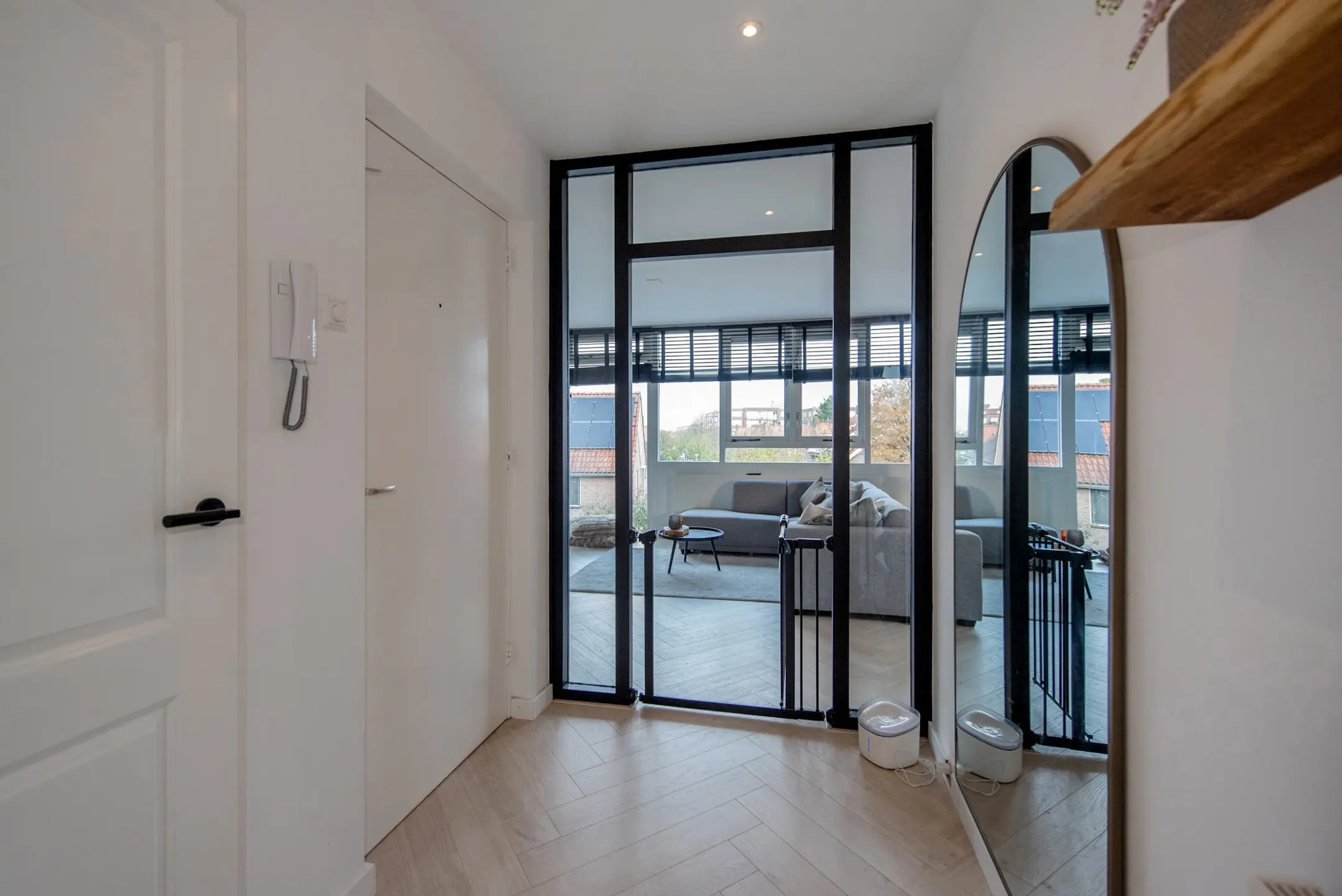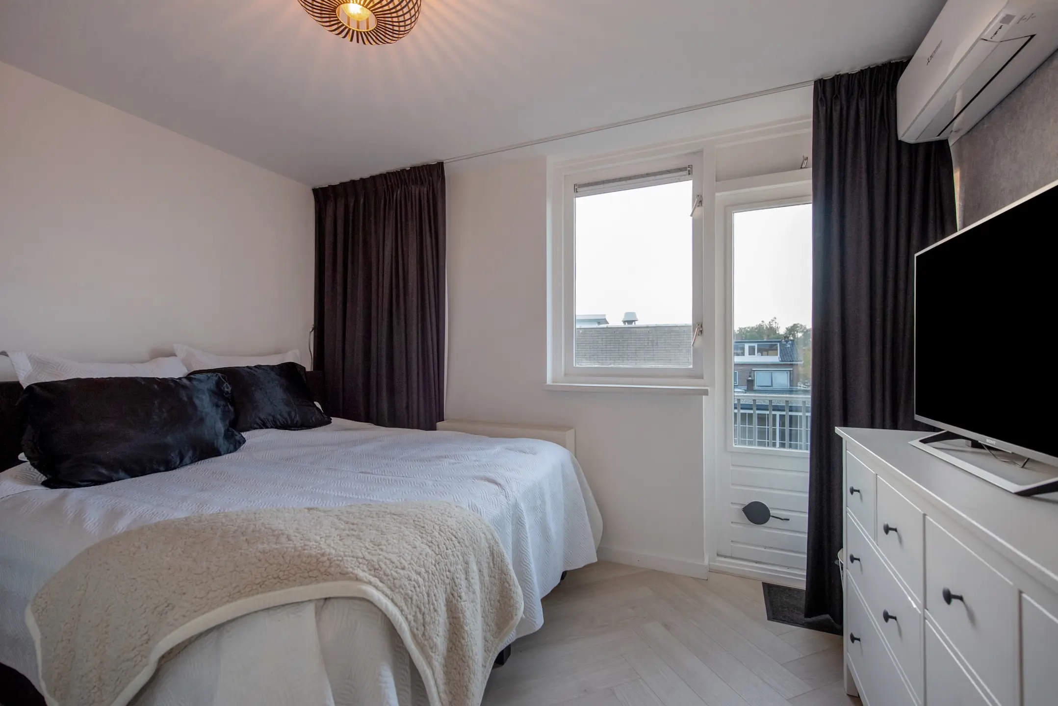 Indeling: afgesloten entree, trap naar de 2e verdieping, entree appartement, hal, vernieuwde meterkast, modern vrij hangend toilet met fontein, vaste kast met opstelplaats voor wasmachine en droger, schitterende door zijraam lichte woon-/eetkamer met vrij uitzicht richting de Prinses Beatrixstraat, moderne open keuken voorzien van een stenen aanrechtblad, Franke kokendwaterkraan en diverse inbouwapparatuur w.o. koelkast, vriezer, inductie kookplaat met geïntegreerd afzuigsysteem en vaatwasser, ruime achtergelegen hoofdslaapkamer met airconditioning (koeling/warmte) toegang tot het zonnig gelegen balkon (ZO), moderne badkamer (geheel betegeld) met design radiator, wastafelmeubel en inloop douche met drain en rainshower, 2e schitterend gelegen slaapkamer met wederom toegang tot het zonnige balkon, een aparte vaste kast met mechanische ventilatie en CV combi ketel. Het gehele appartement is voorzien van een mooie visgraat laminaatvloer.