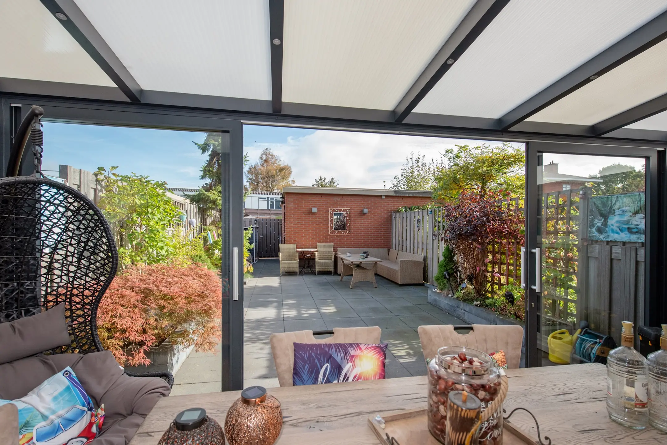De entree is via de nette voortuin die in 2021 opnieuw is aangelegd. Binnenkomend in de hal vindt u de meterkast, een garderobenis en een separaat toilet met fontein. Vanuit hier loopt u door naar de woon-/eetkamer. Aan de voorzijde ligt de moderne open keuken (2021), voorzien van Quooker, Bora inductieplaat, oven, magnetron, Amerikaanse koel-/vriescombinatie en vaatwasser. In de woonkamer is een ruime trapkast en aan de achterzijde openslaande deuren naar de prachtige serre met elektrische verwarming, zodat er ook in de koude winterdagen comfortabel gezeten kan worden. Vanuit de serre schuift u zo door naar de diepe achtertuin, vier jaar geleden opnieuw aangelegd, met achterom en toegang tot de garage (dubbelwandig en voorzien van elektra). Hier springt de prachtige dakopbouw er echt uit en vormt een opvallende blikvanger.