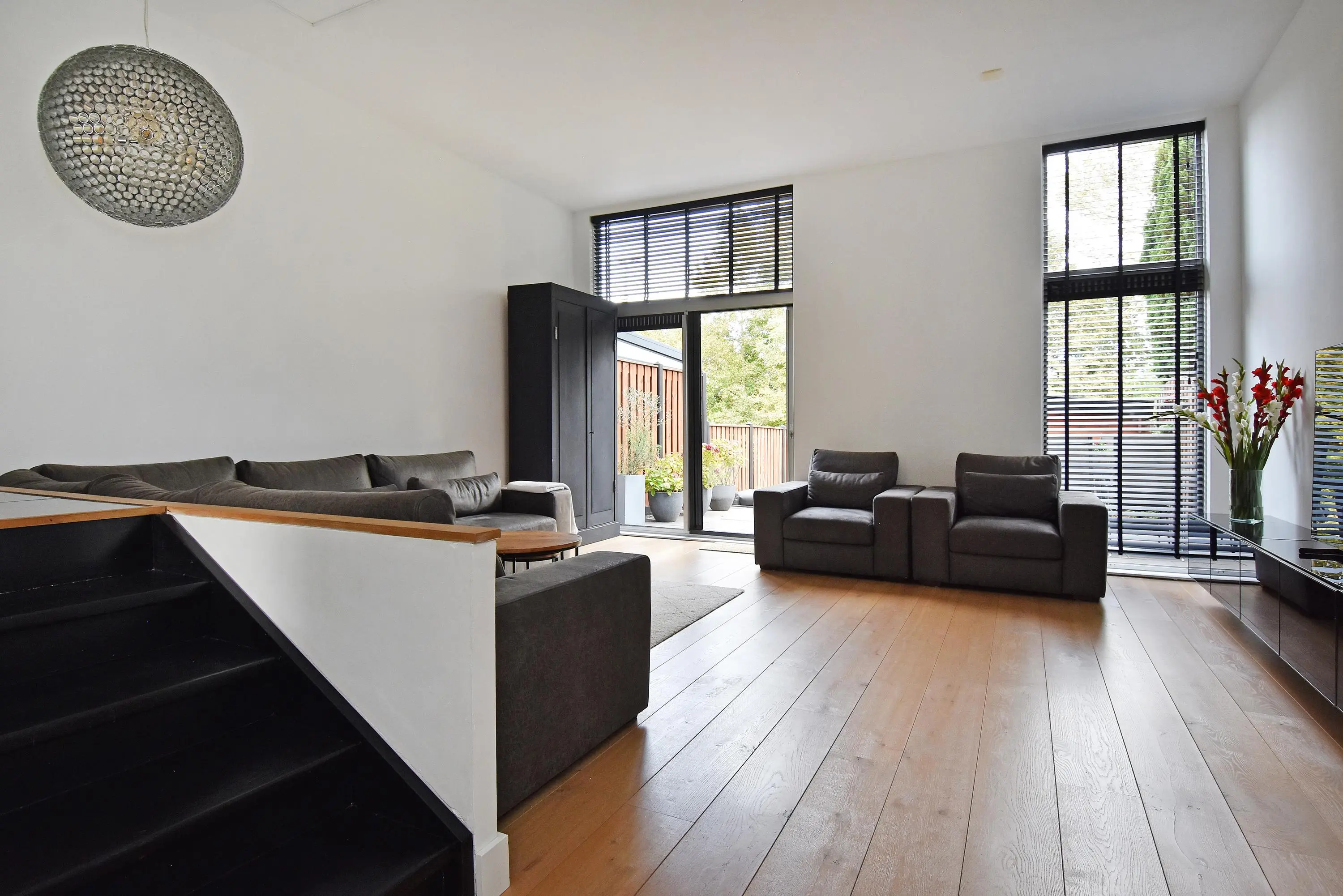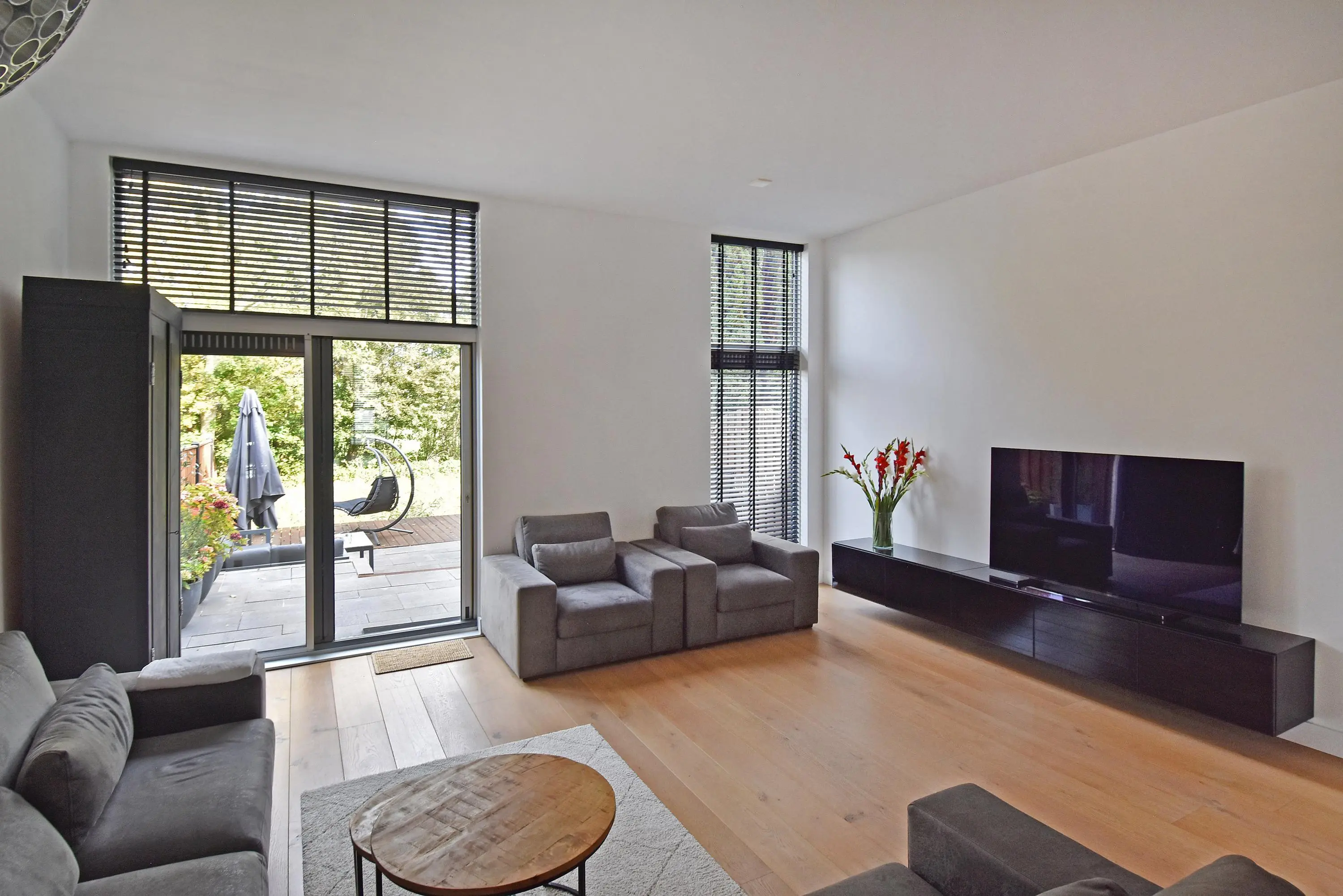 You can enter the house via the front garden or the sunken driveway leading to the garage. The spacious hallway includes the meter cupboard, a convenient stair cupboard with extra storage (even the lower steps are designed as drawers), and a modern separate toilet with wash basin. From here you step into the bright and generous living room, featuring an elegant parquet floor and sliding doors to the back garden. Facing east, the garden offers a terrace and a wooden deck directly on the water, providing a unique combination of tranquility, privacy, and green views.