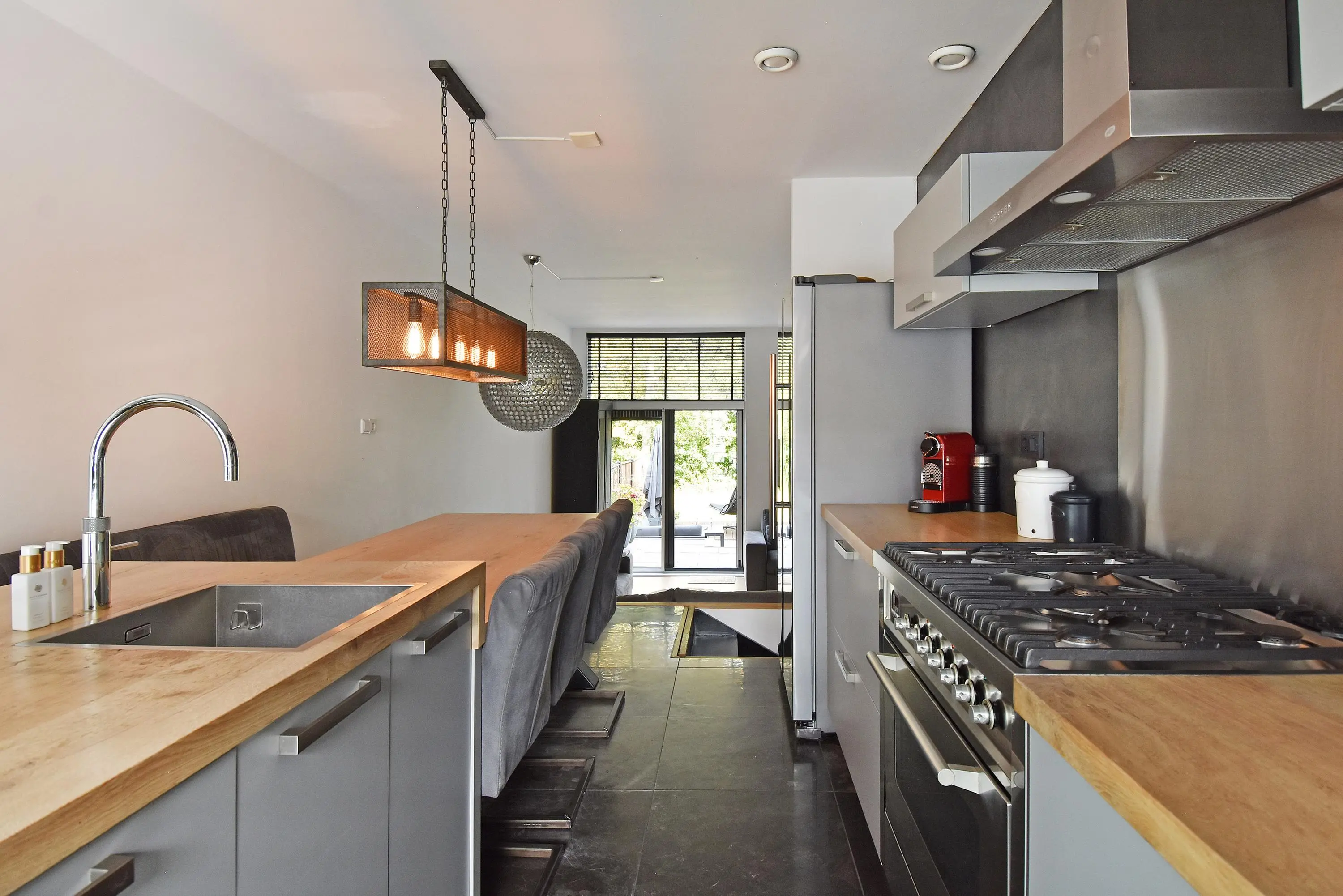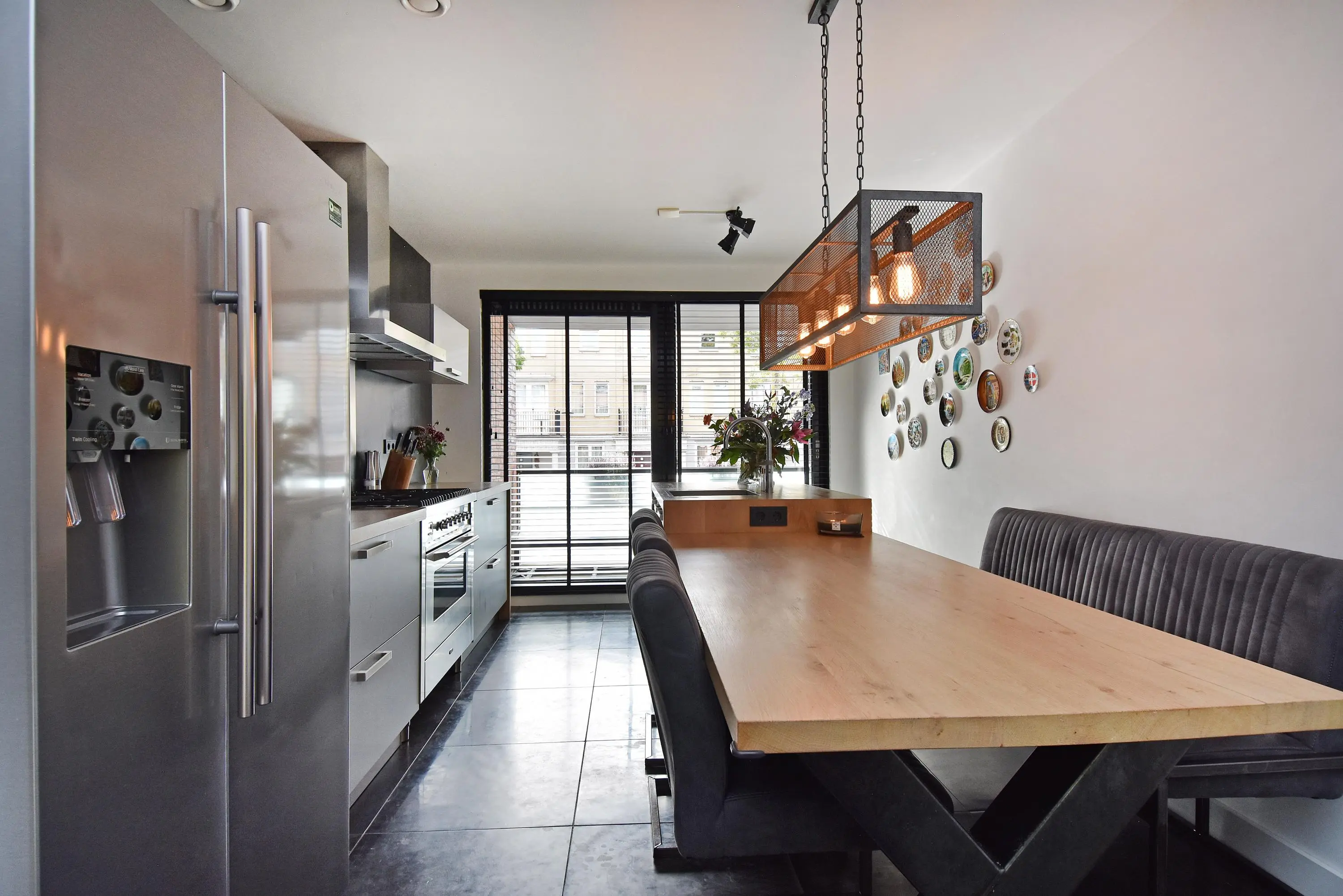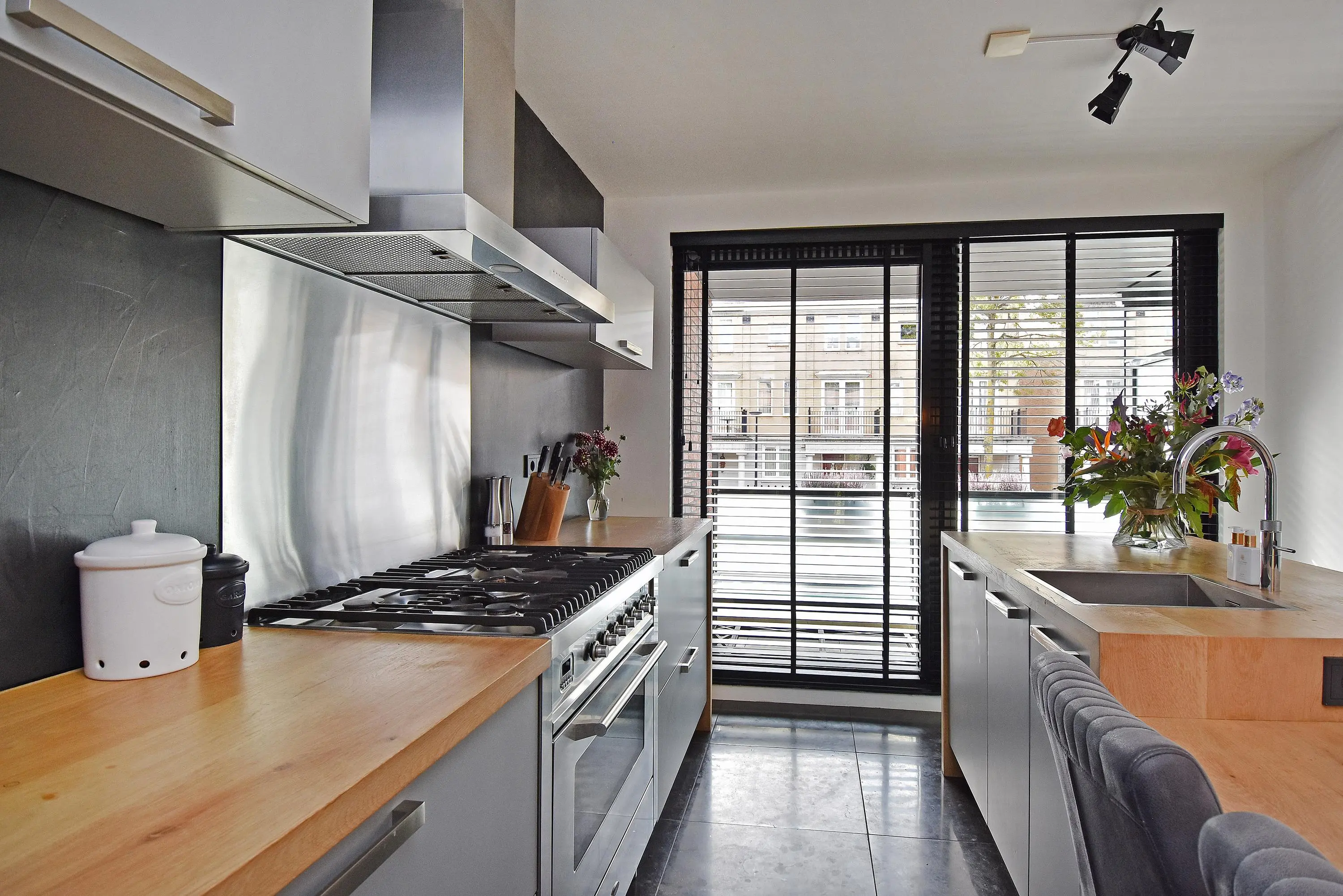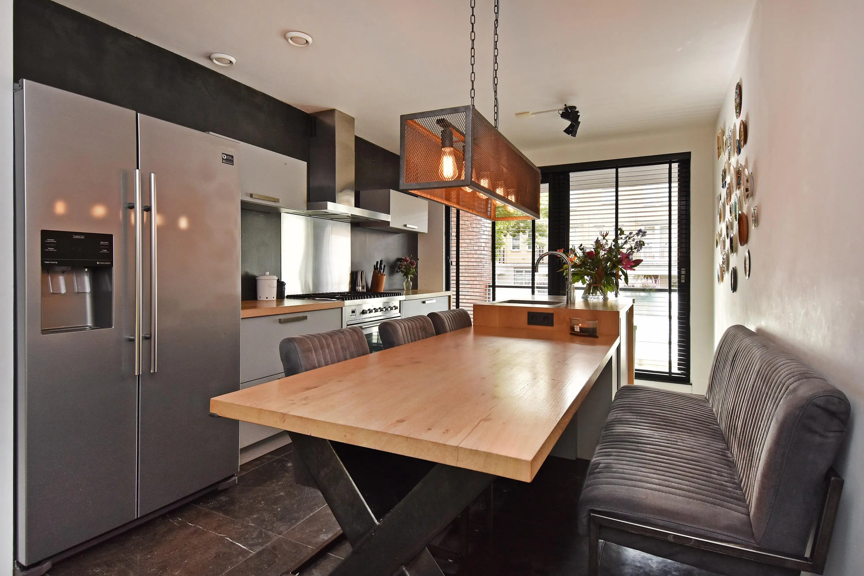 De woonkamer loopt via een speels split-level over in de hoger gelegen keuken. Deze is modern en compleet ingericht met een kookeiland met spoelgedeelte, een royaal 5-pits gasfornuis met oven, een vrijstaande Amerikaanse koelkast en een extra koelkast. Aan het eiland grenst een ruime eettafel, ideaal om samen te komen en uitgebreid te tafelen. Ook hier is een schuifpui naar buiten, ditmaal naar een zonnig balkon op het zuidwesten waar u tot in de avondzon kunt zitten.