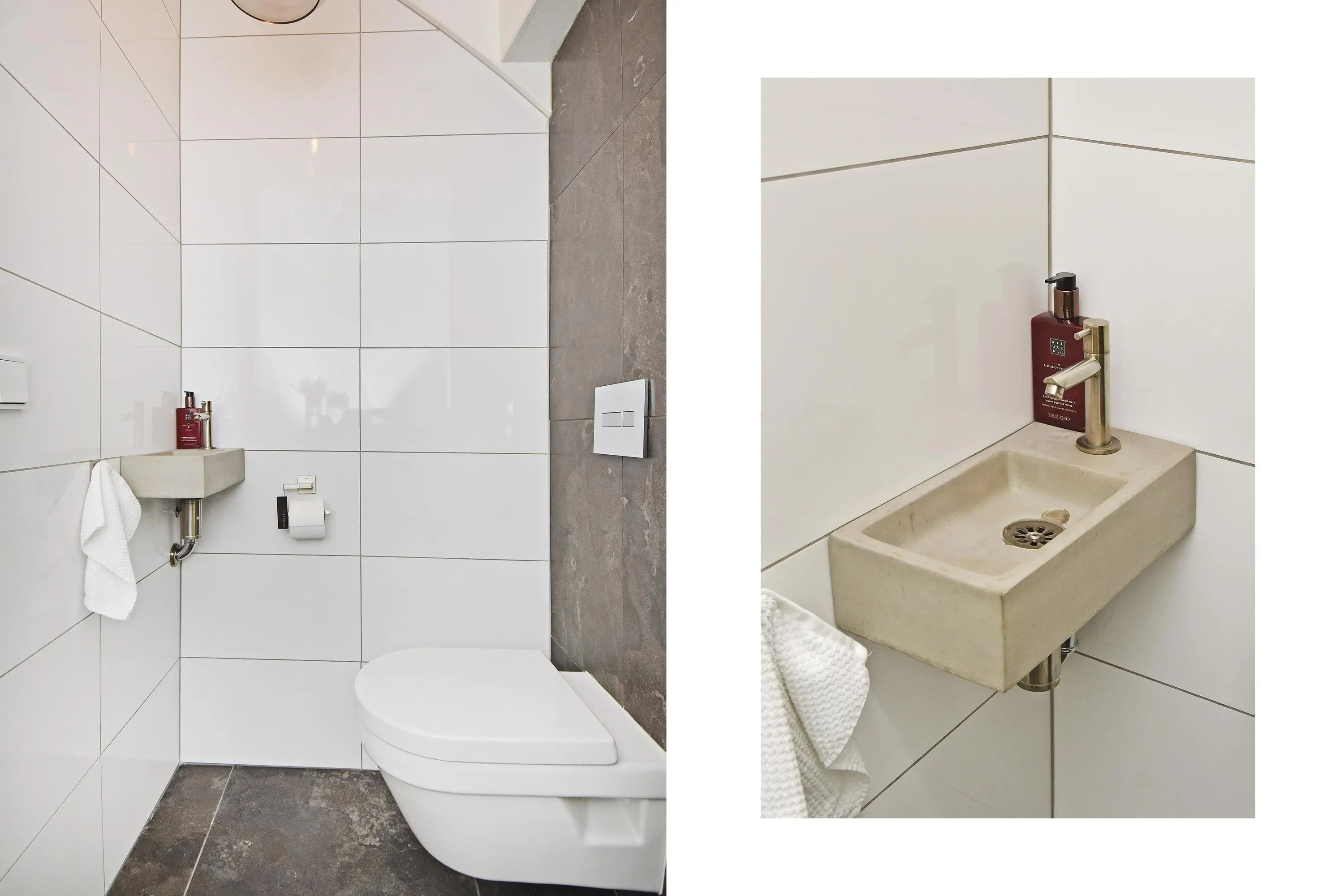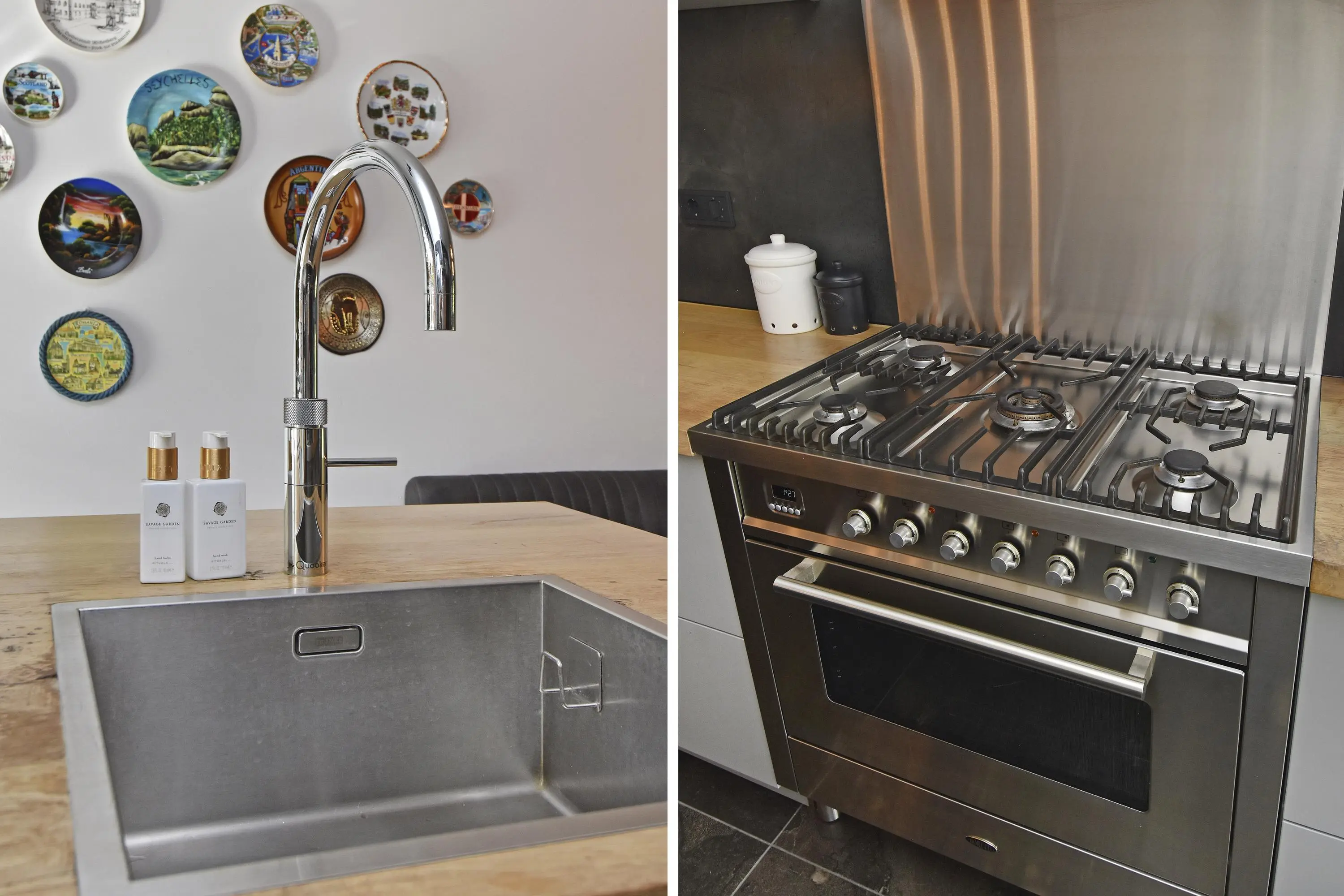 The living room flows seamlessly into the elevated kitchen through a playful split-level design. The kitchen is modern and fully equipped with a cooking island including sink, a large 5-burner gas stove with oven, a freestanding American fridge, and an additional fridge. The spacious dining table is attached to the island, making it the perfect spot to gather and dine. From here, sliding doors open onto a sunny southwest-facing balcony, where you can enjoy the evening sun.