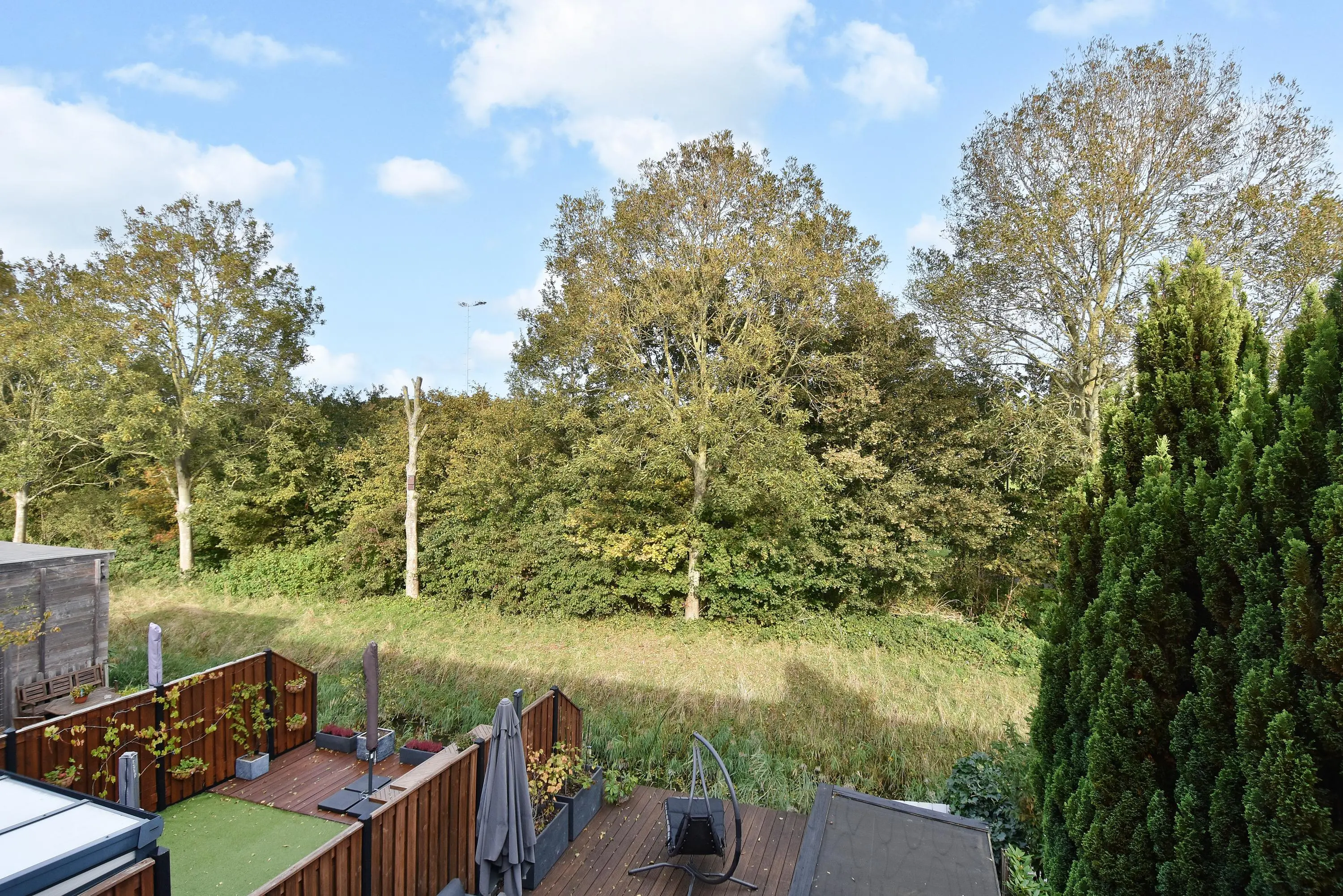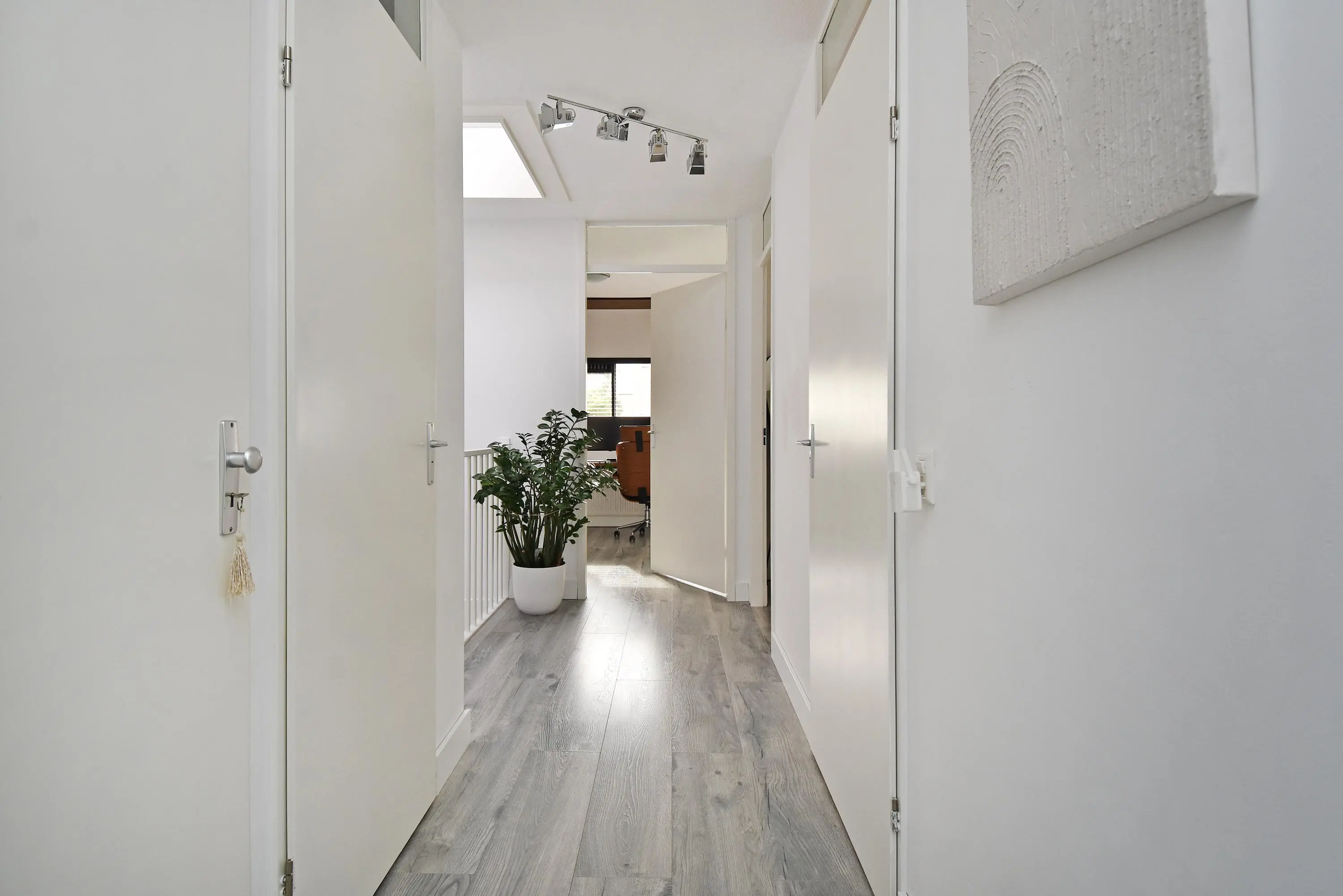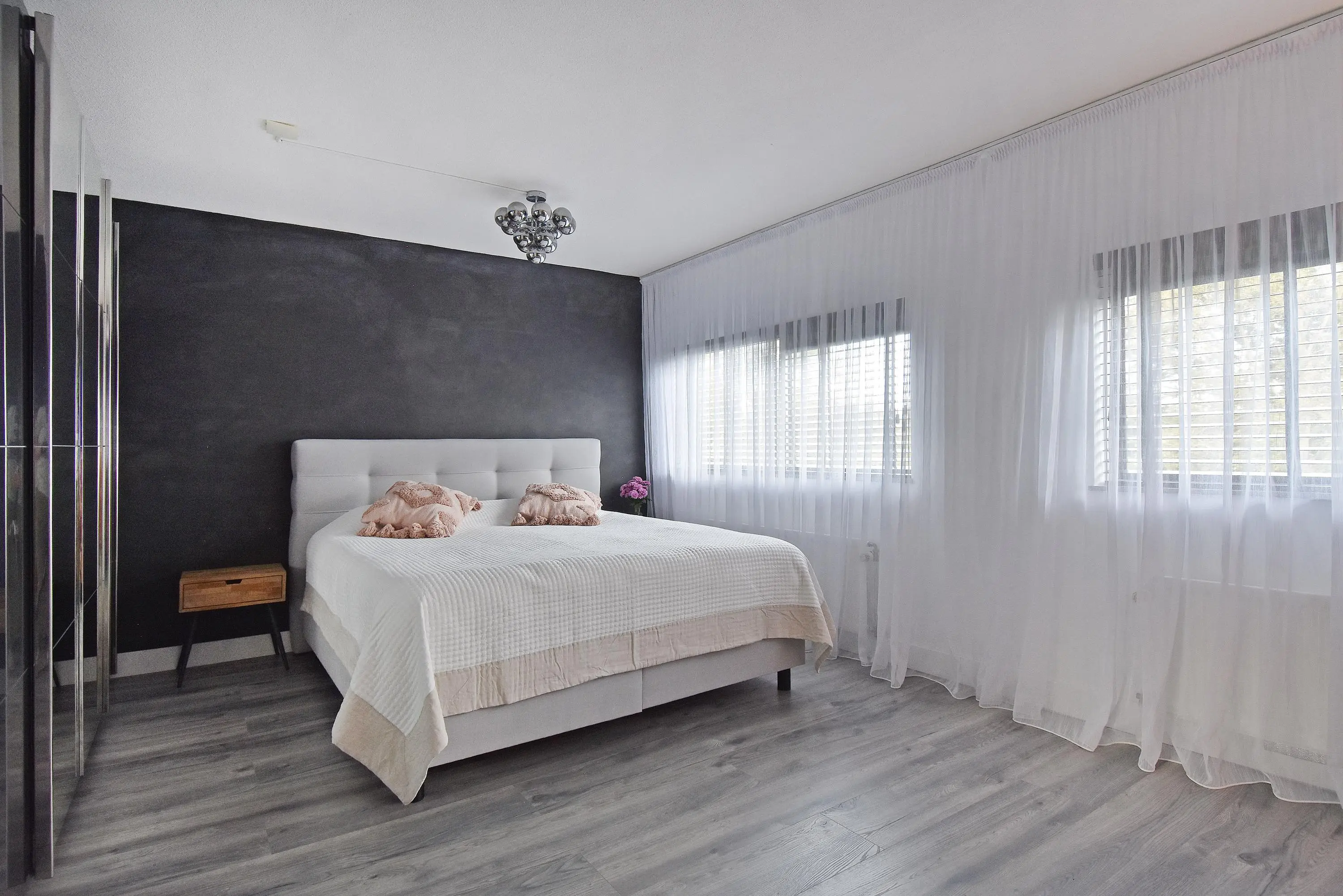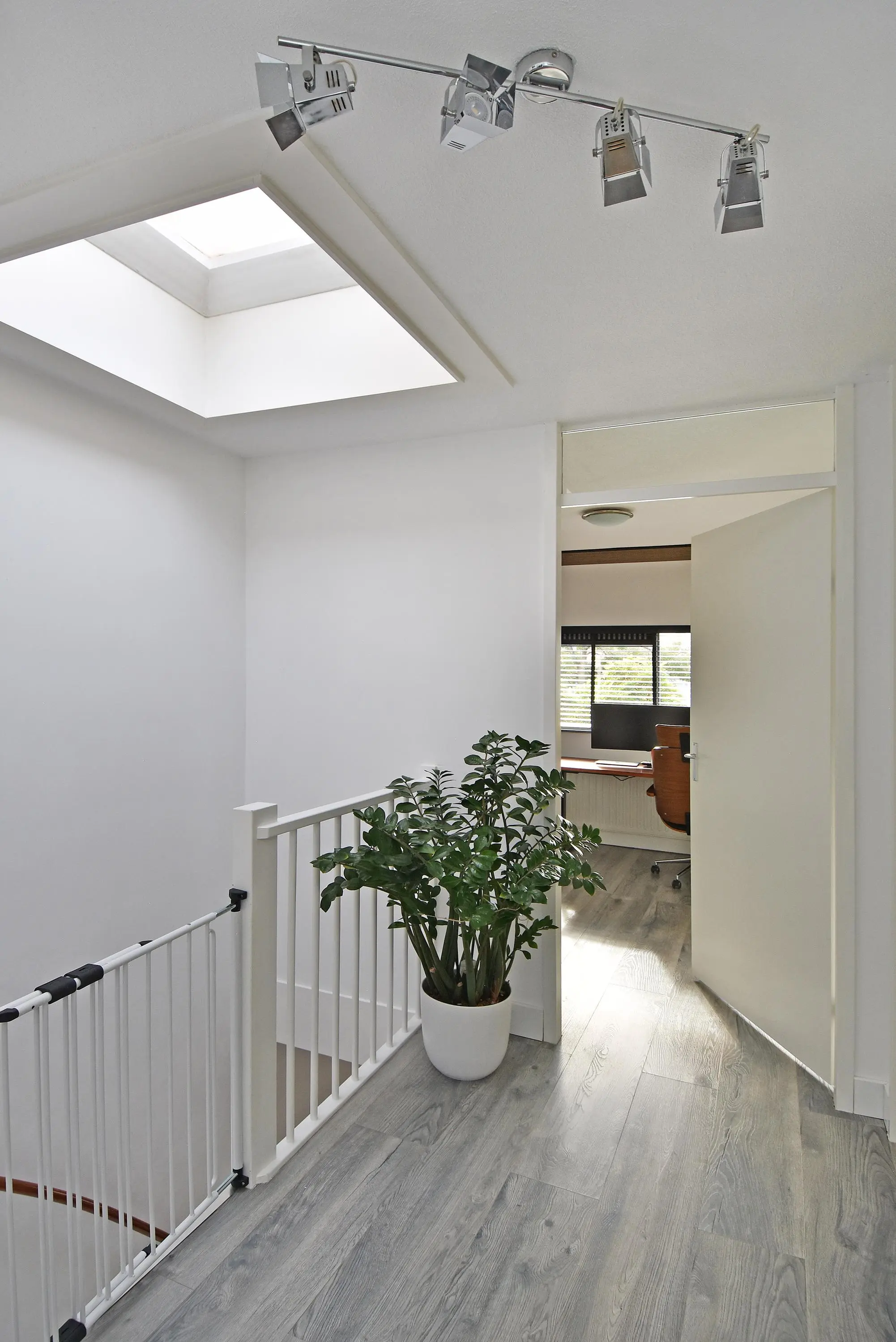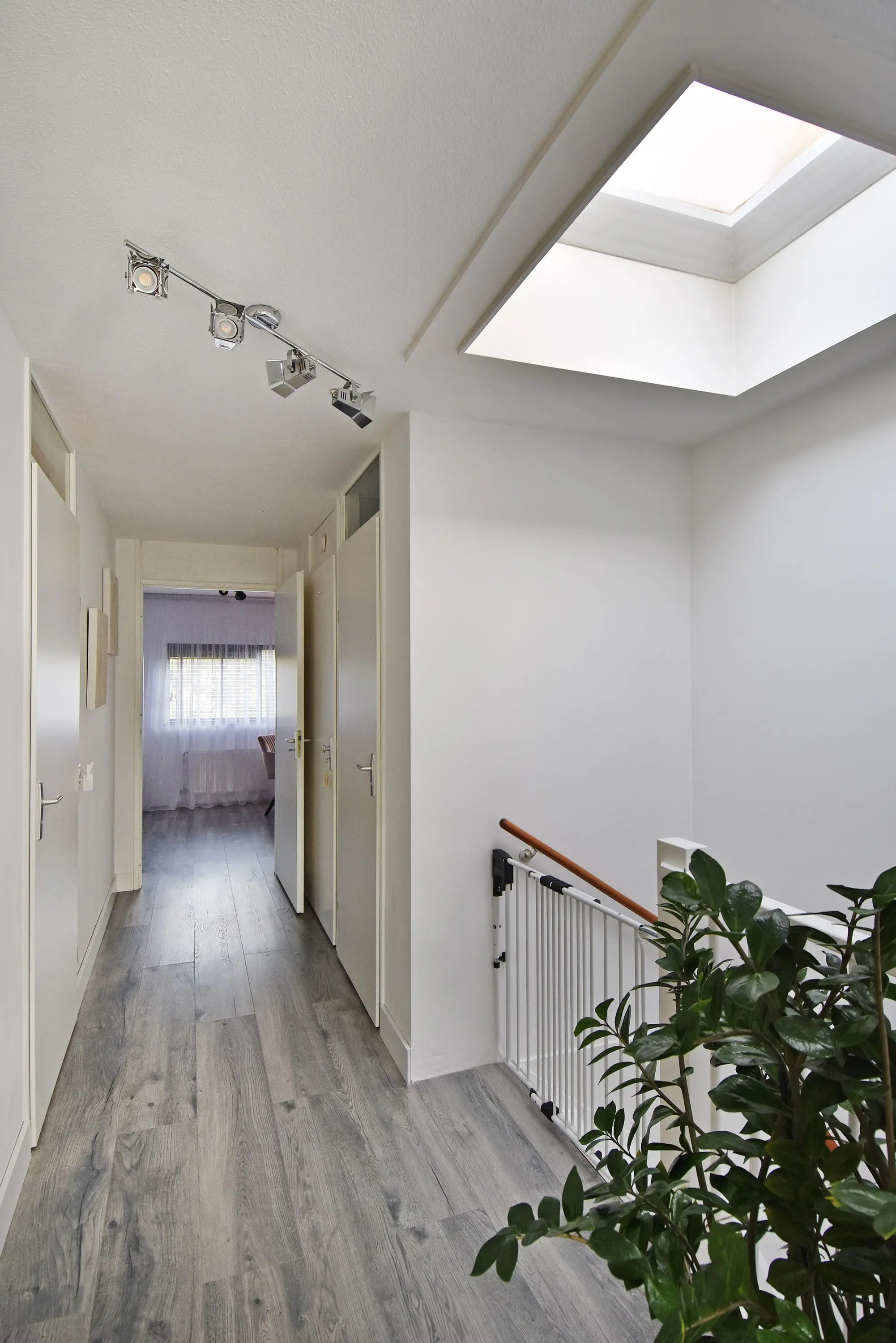 Een verdieping hoger komt u op de lichte overloop met daklicht. Hier vindt u een separaat tweede toilet en een praktische bergkast met de omvormer van de zonnepanelen, de aansluiting voor de wasmachine en de cv-ketel (Remeha Avanta, 2013). Aan de voorzijde liggen twee goed bemeten slaapkamers die uitkijken over de straat, terwijl in het midden de luxe badkamer is gesitueerd met ligbad, royale inloopdouche en een breed dubbel wastafelmeubel. De achterzijde van de woning wordt volledig ingenomen door de master bedroom, een bijzonder ruime kamer met airconditioning en uitzicht op het groen.