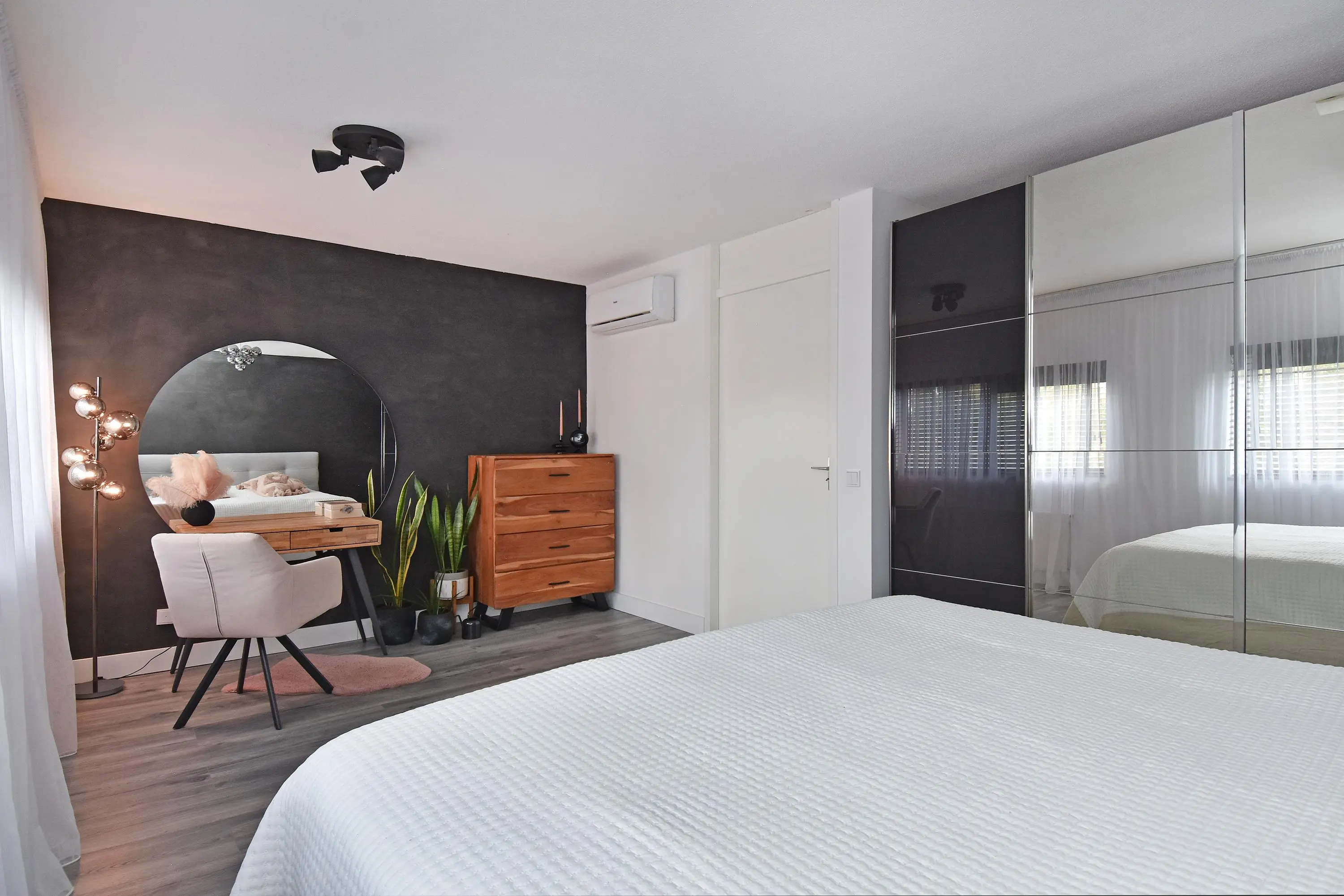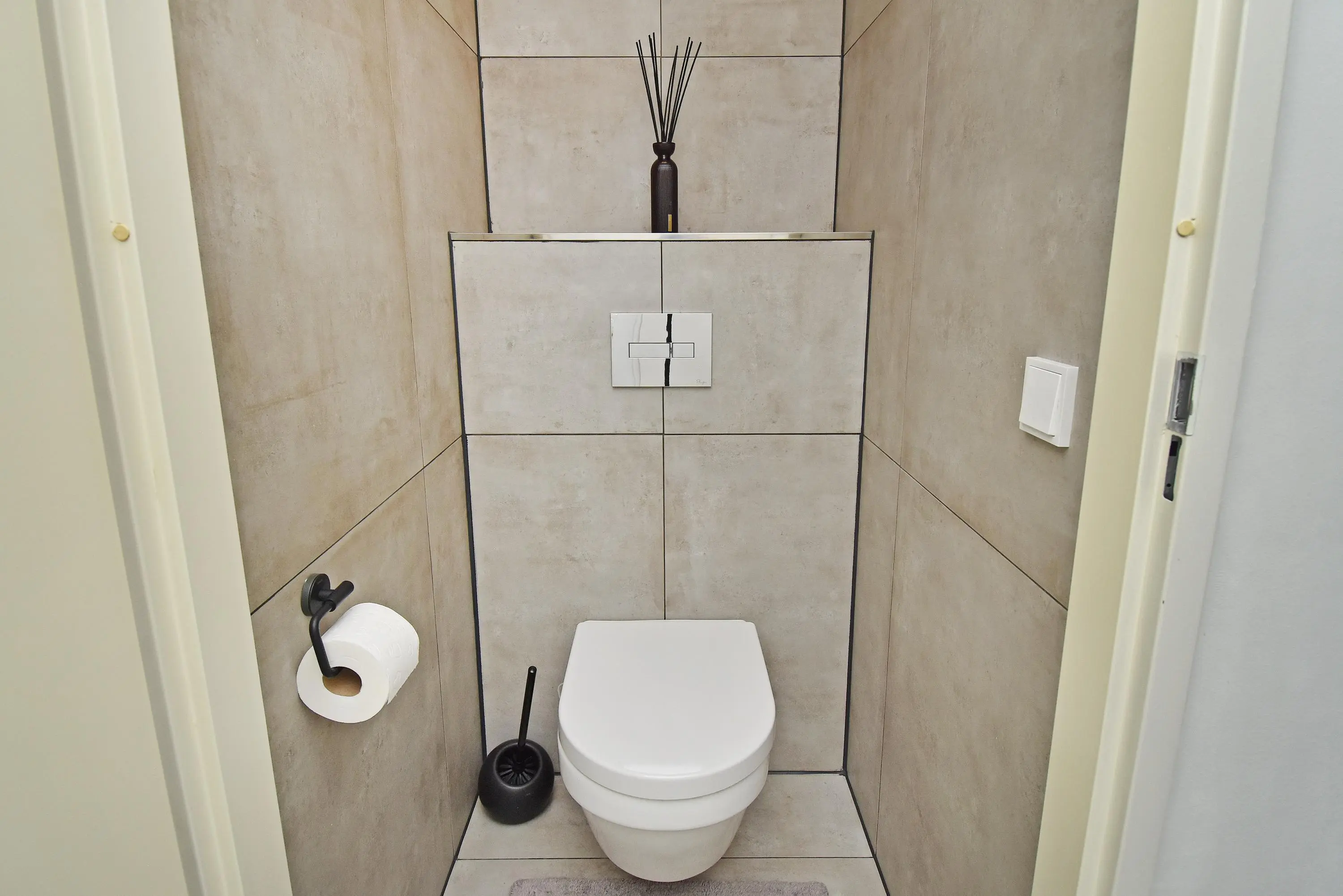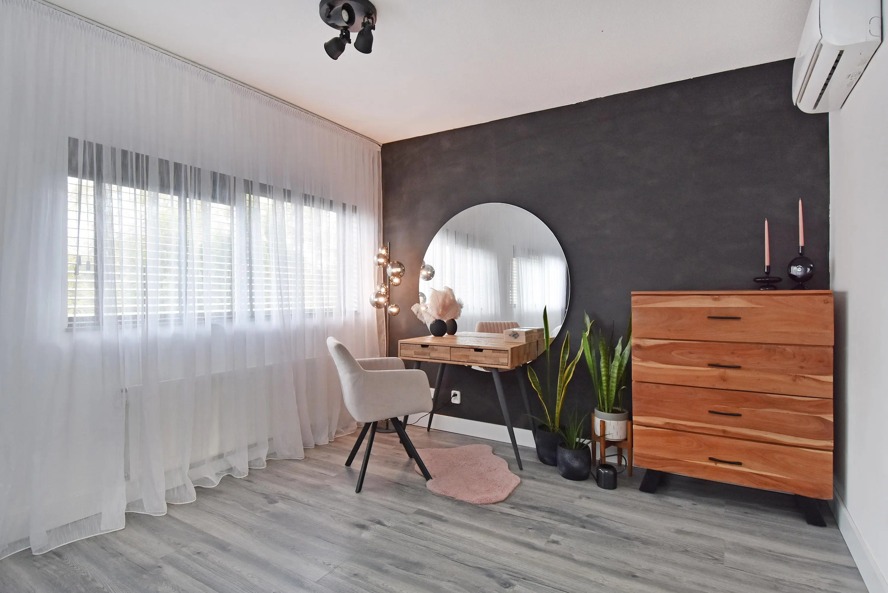 Upstairs, a light-filled landing with skylight leads to all rooms. Here you will find a separate second toilet and a practical storage cupboard housing the inverter for the solar panels, the washing machine connection, and the central heating boiler (Remeha Avanta, 2013). At the front, two well-sized bedrooms overlook the street, while the luxurious bathroom is centrally located and features a bathtub, spacious walk-in shower, and a wide double washbasin unit. The entire rear side of the house is occupied by the master bedroom, an exceptionally spacious room equipped with air conditioning and overlooking the greenery.