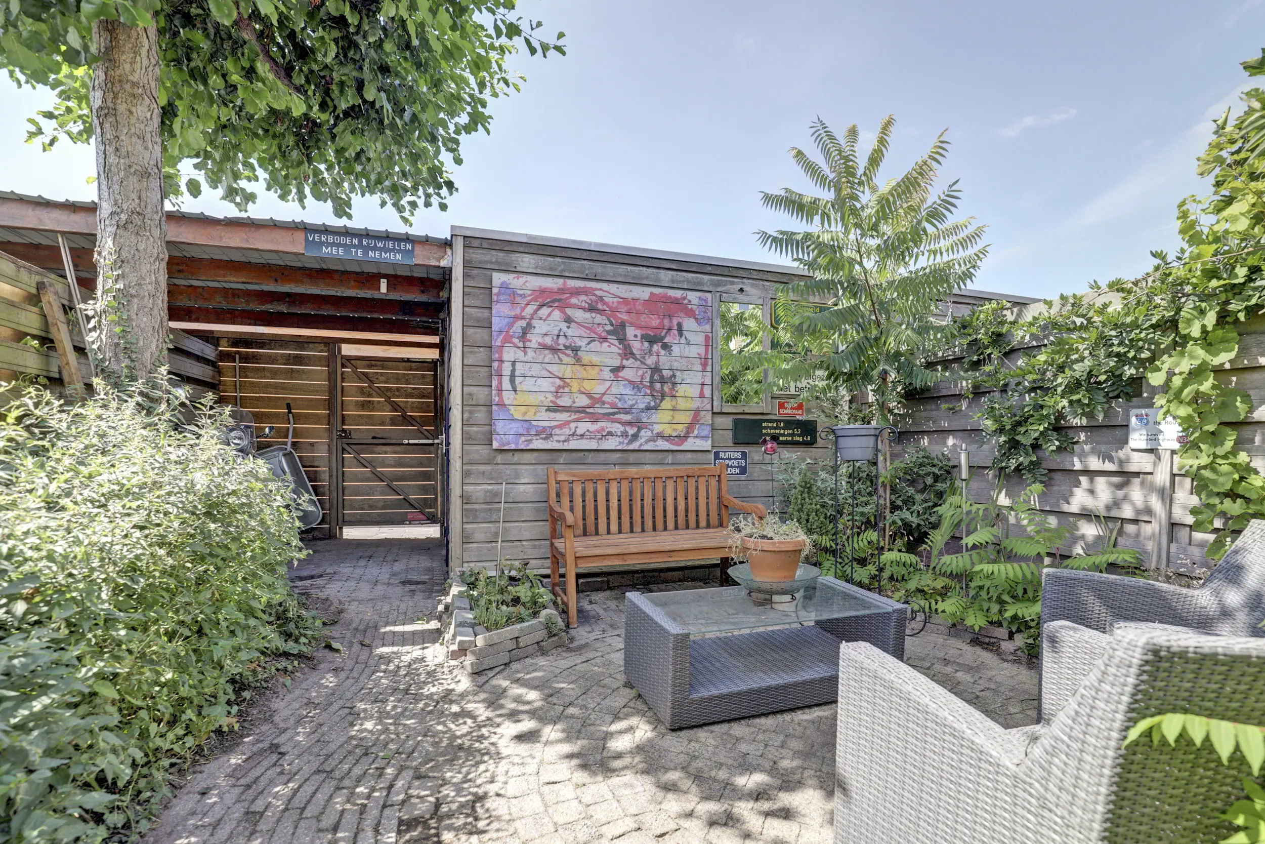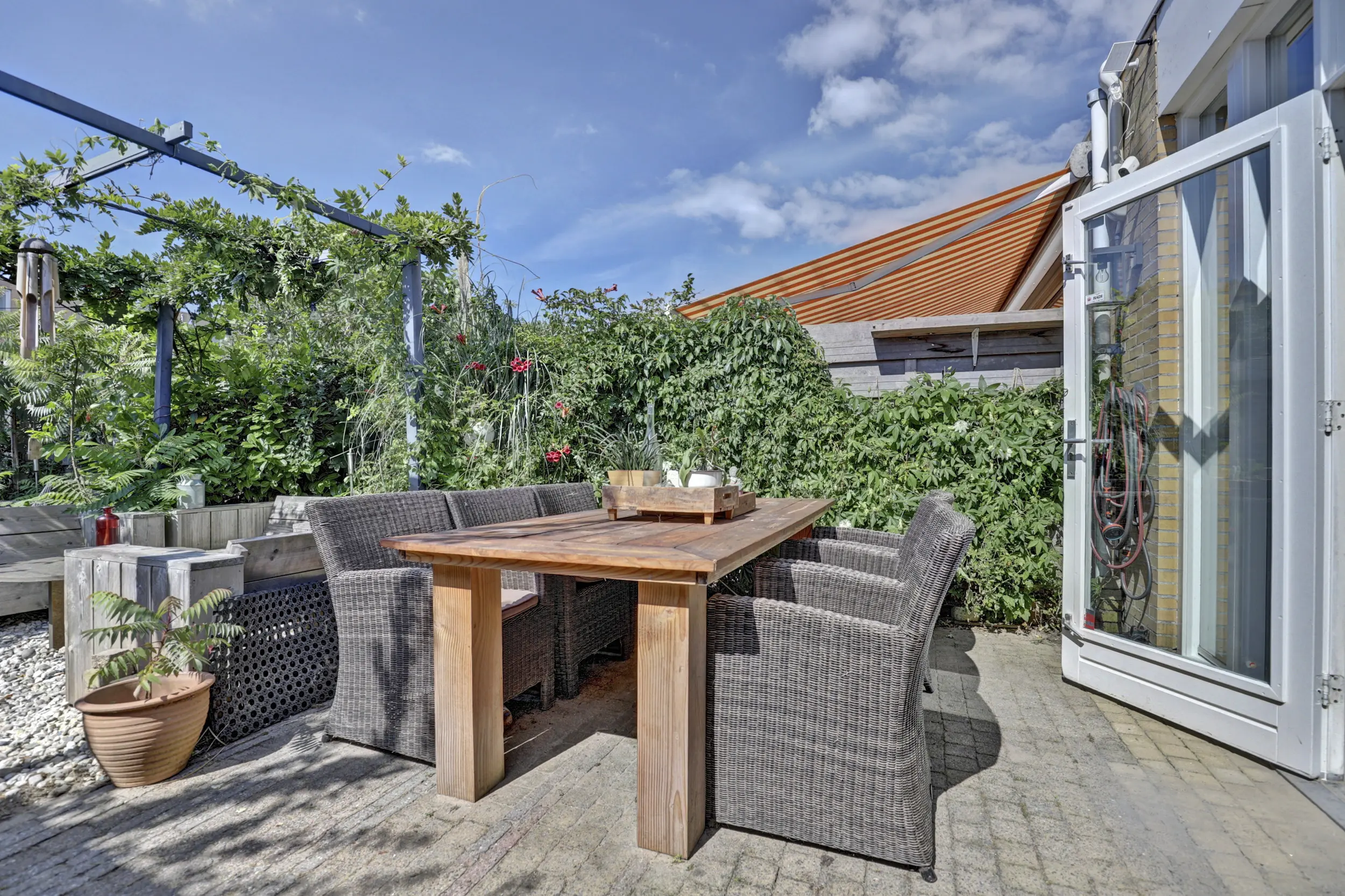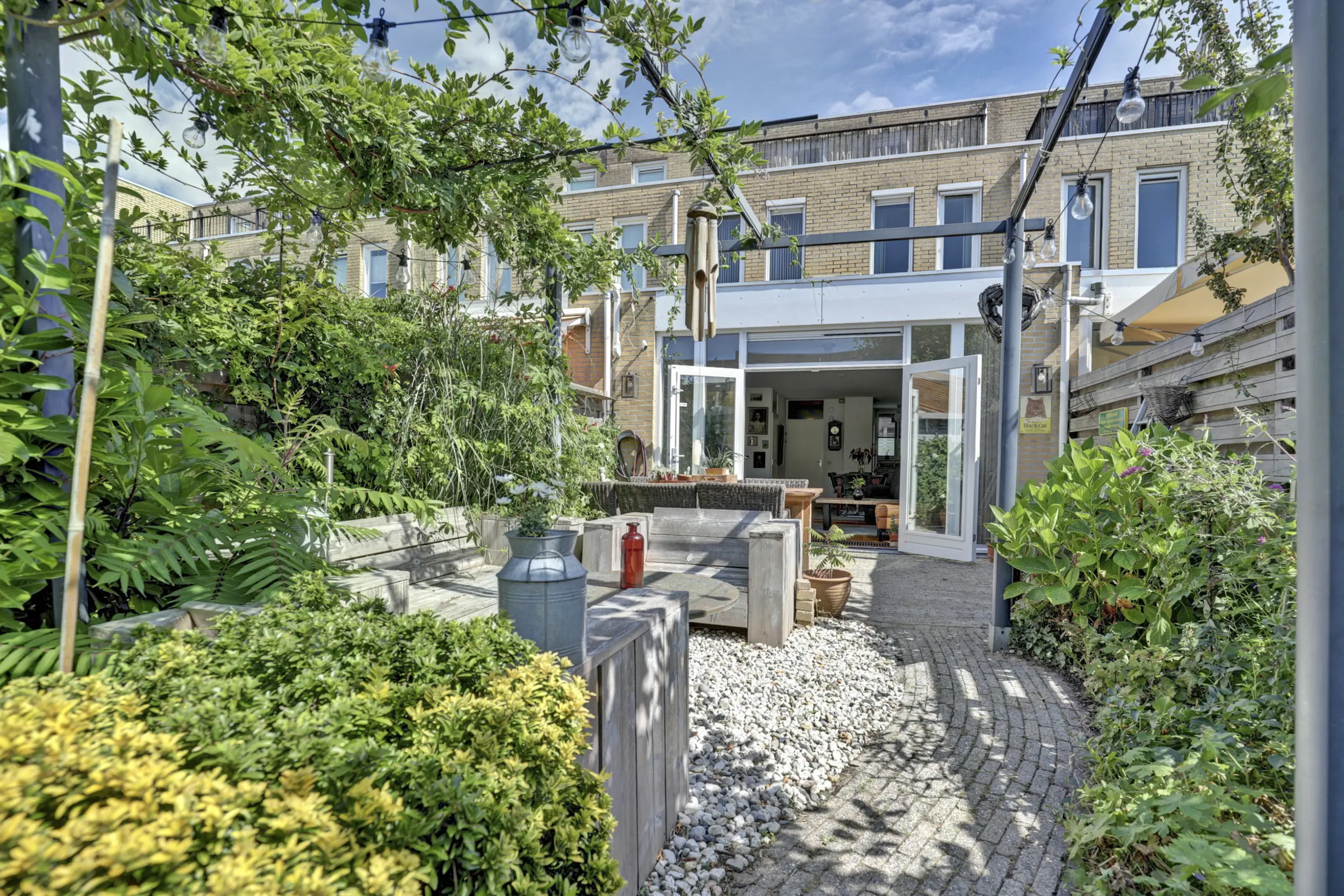De fraai aangelegde, diepe achtertuin beschikt over veel vaste planten, een terras grenzend aan de living en een meanderend pad naar het tweede terras. Achterin de tuin bevindt zich een houten berging met elektra en een naastgelegen overkapping. Er is tevens een deur naar het achterpad.