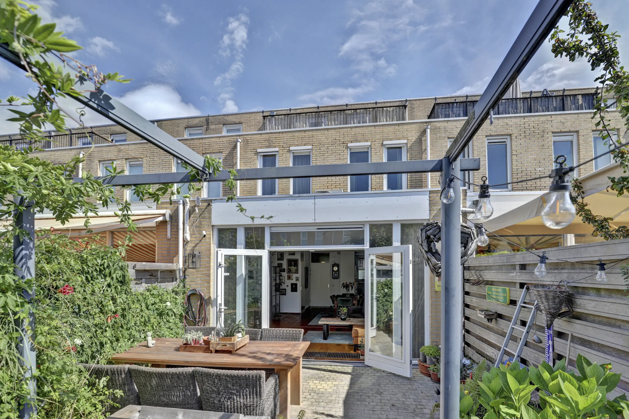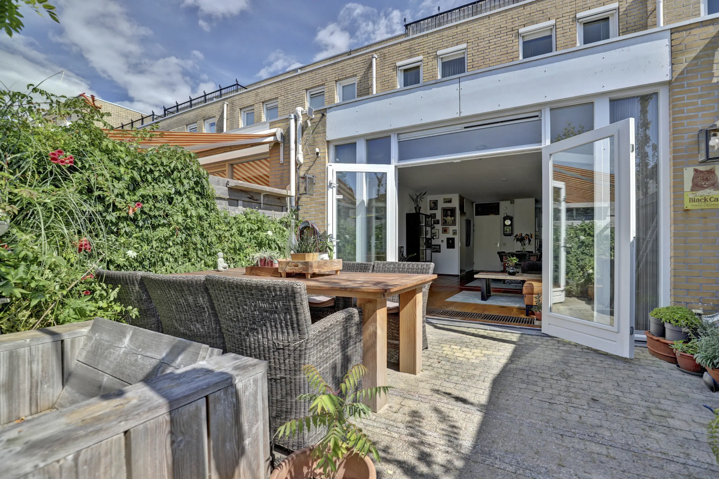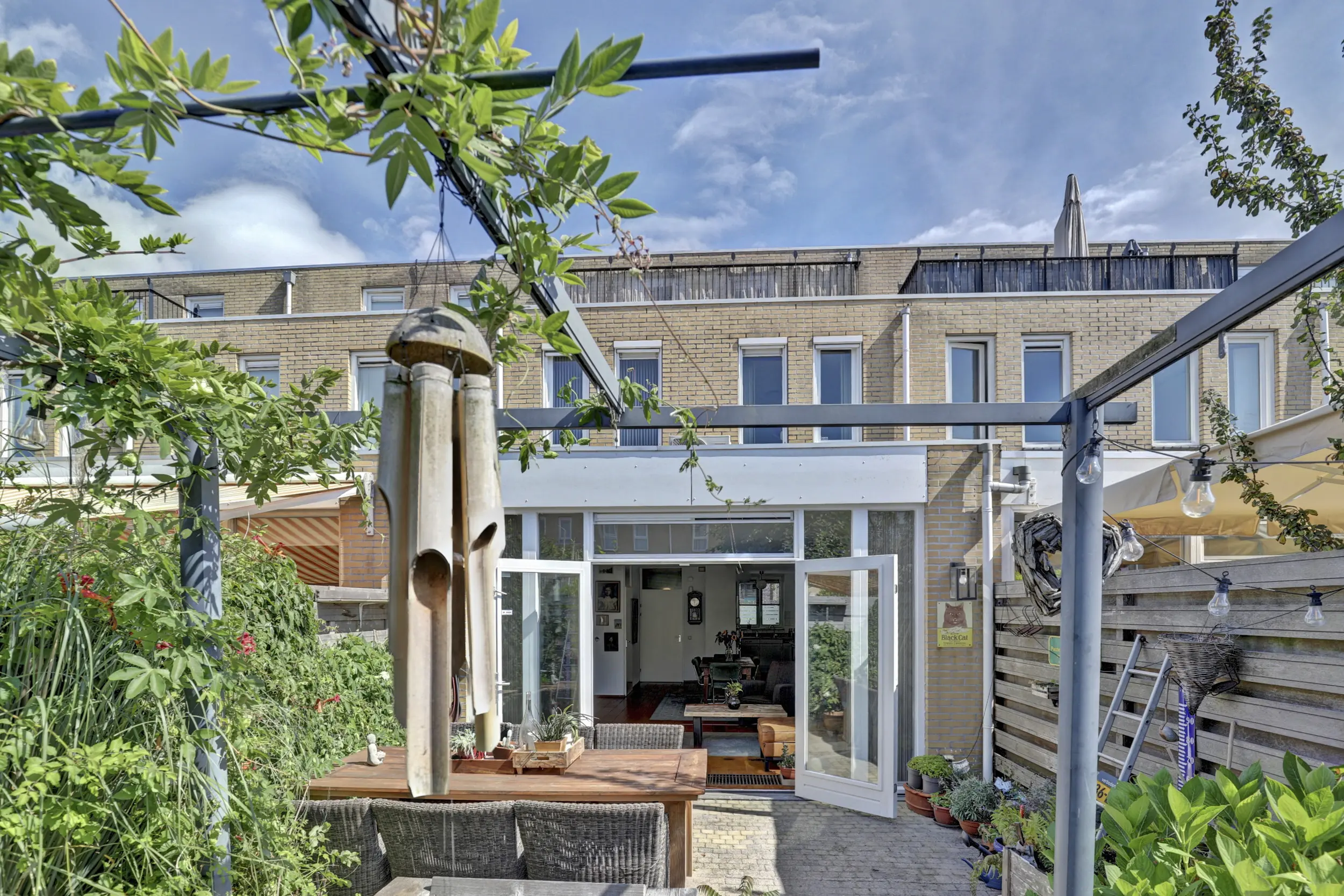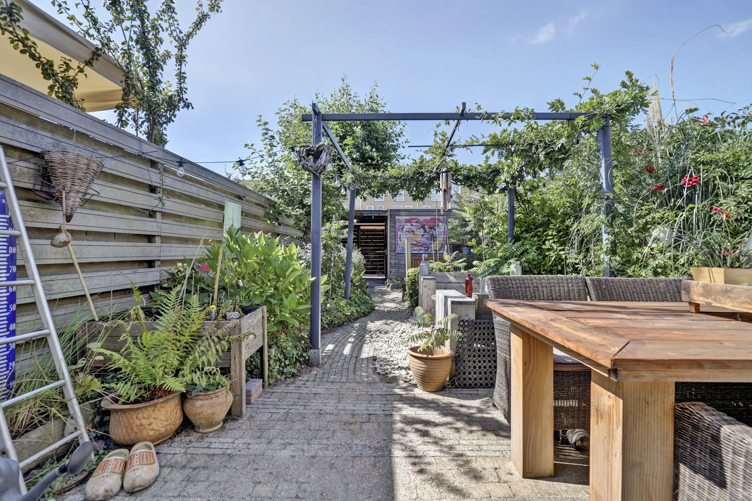 De fraai aangelegde, diepe achtertuin beschikt over veel vaste planten, een terras grenzend aan de living en een meanderend pad naar het tweede terras. Achterin de tuin bevindt zich een houten berging met elektra en een naastgelegen overkapping. Er is tevens een deur naar het achterpad.