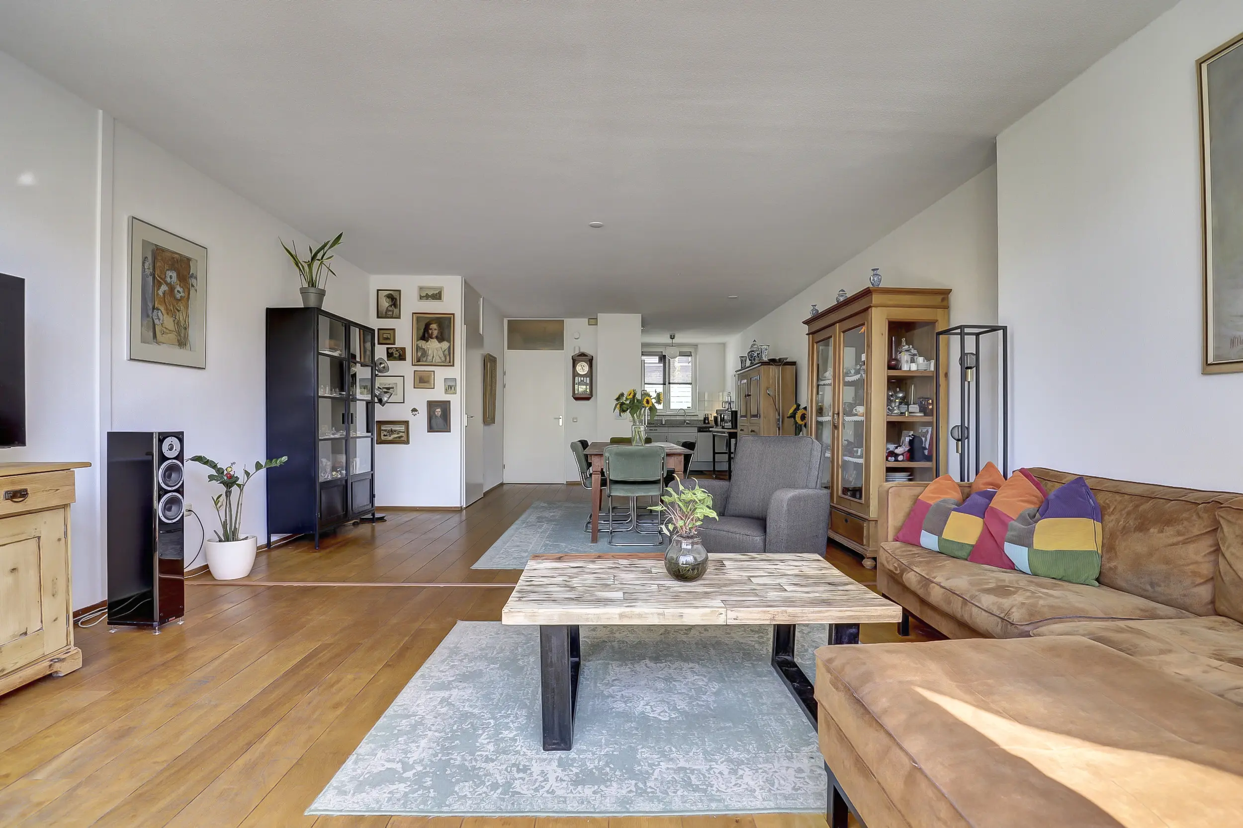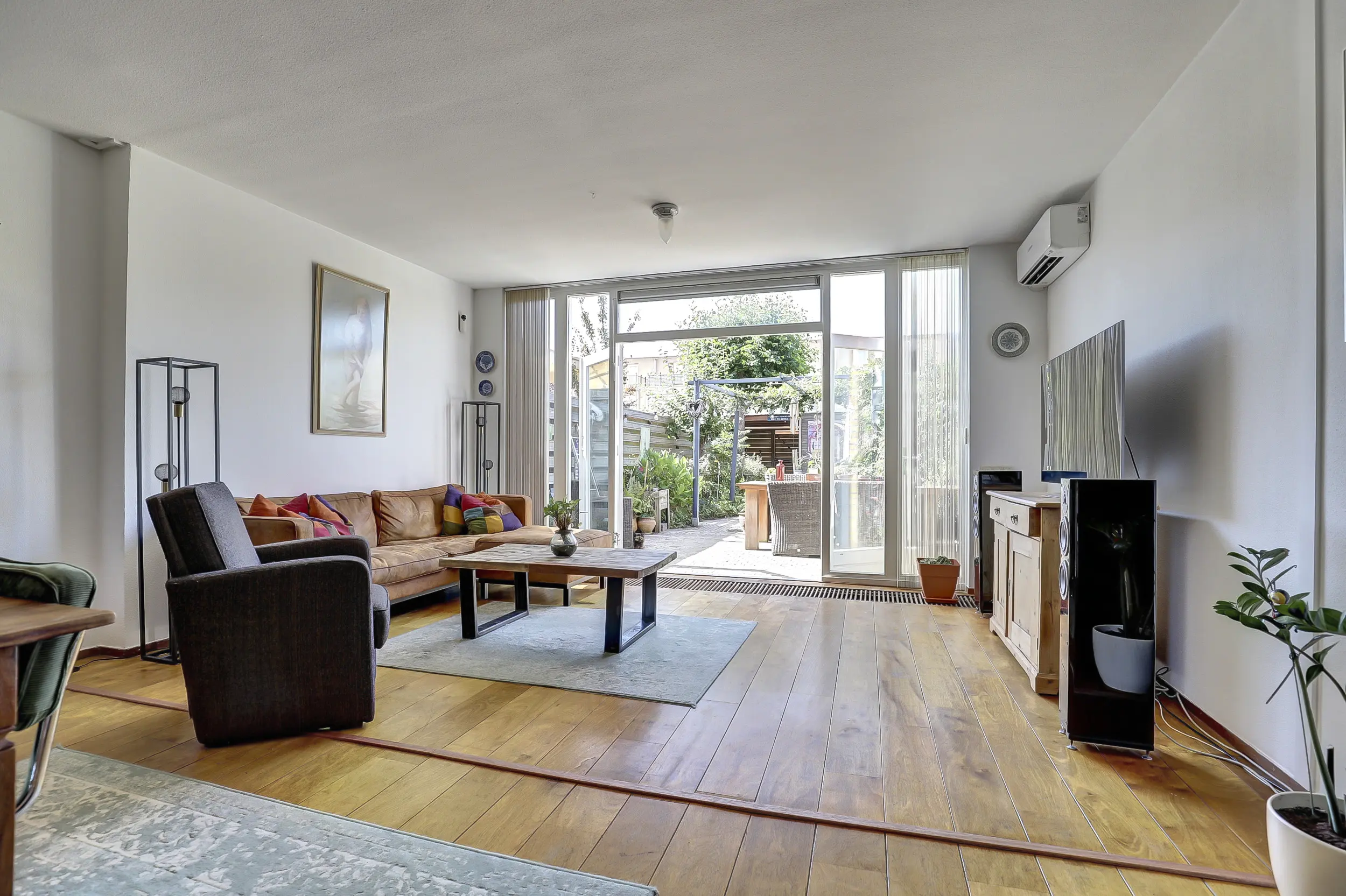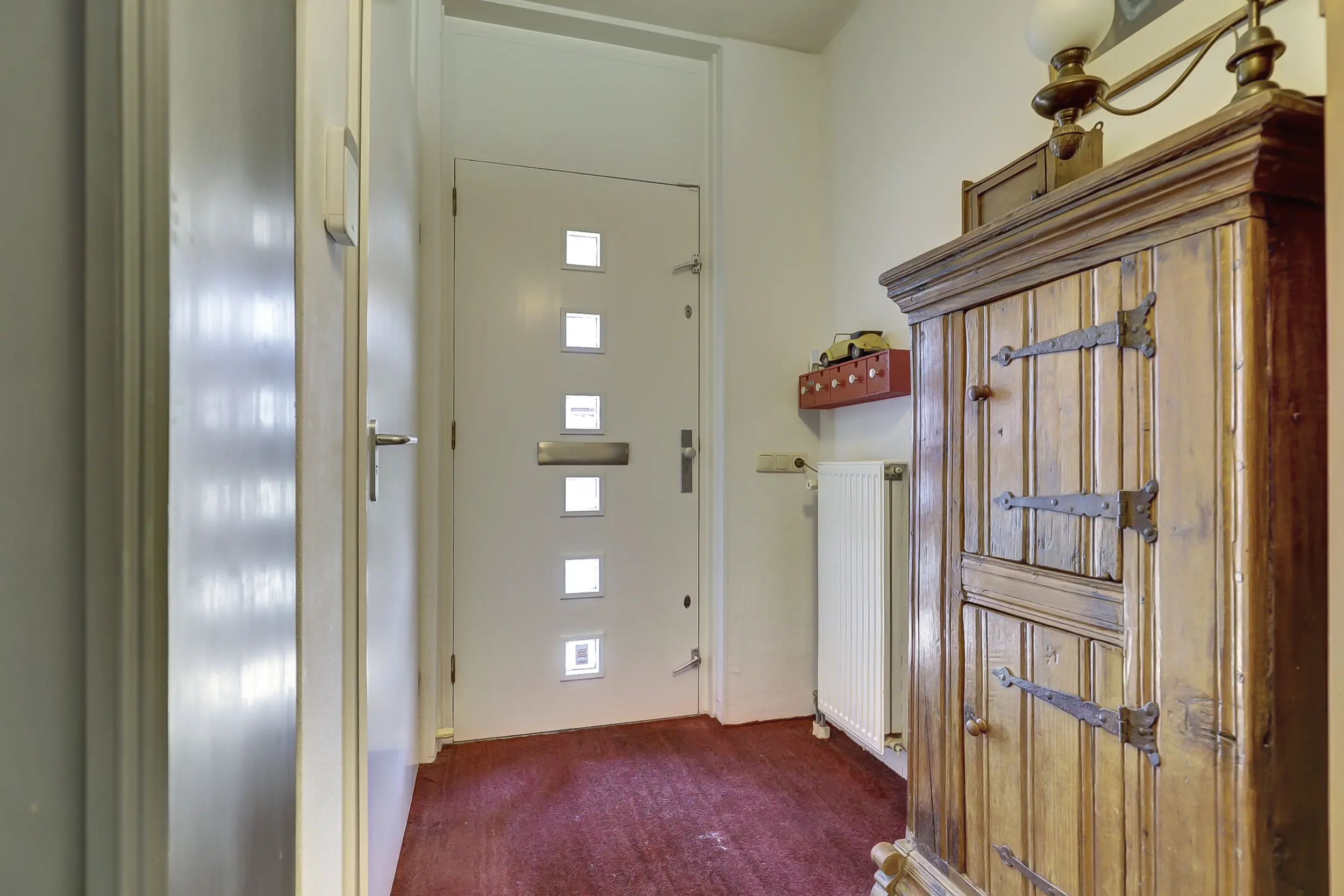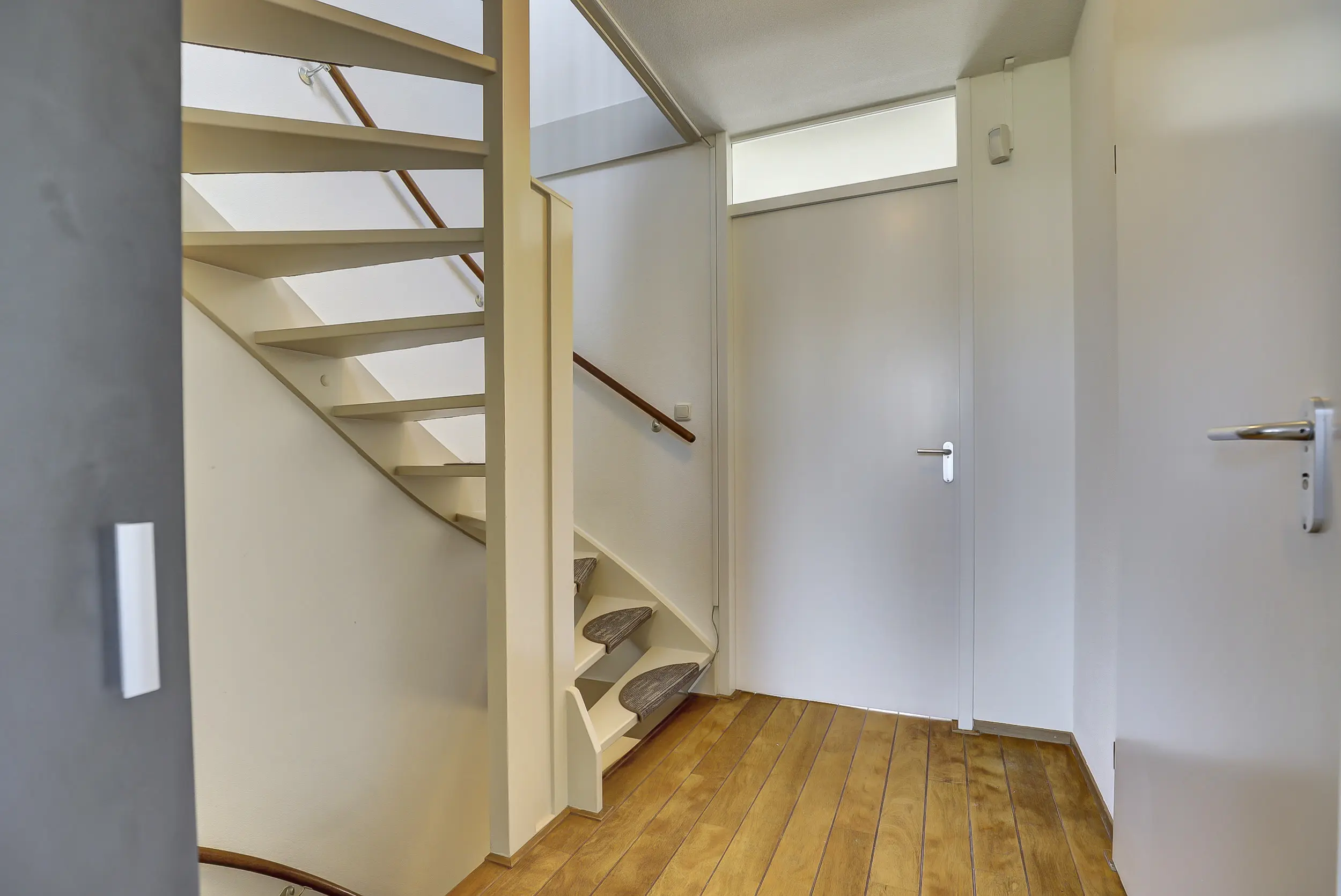 Voortuin met toegang tot de woning. Ruime hal met meterkast en een wit betegeld toilet, voorzien van een wandcloset en fonteintje. Heerlijke, ruime uitgebouwde living met dubbele tuindeuren. In de woonkamer bevindt zich een praktische trapkast voor extra bergruimte.